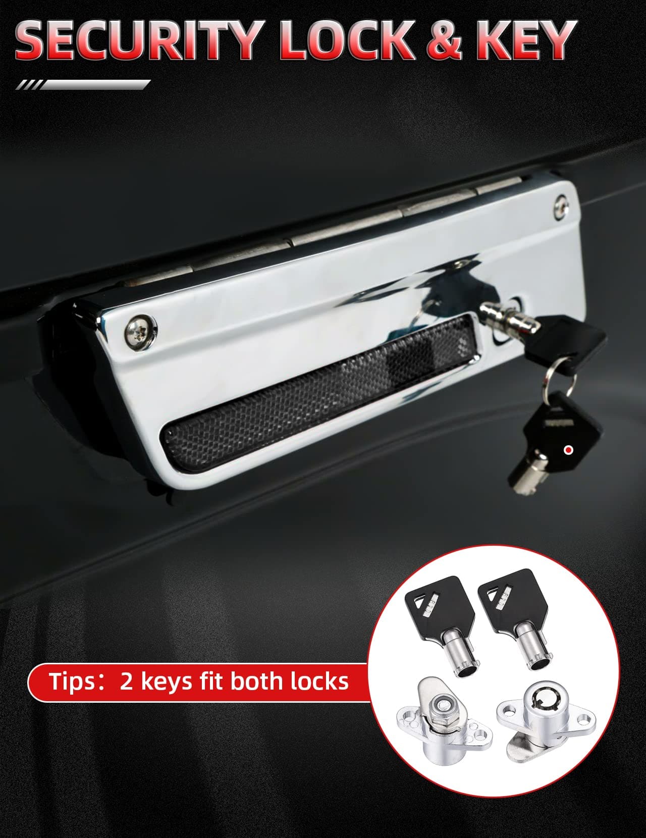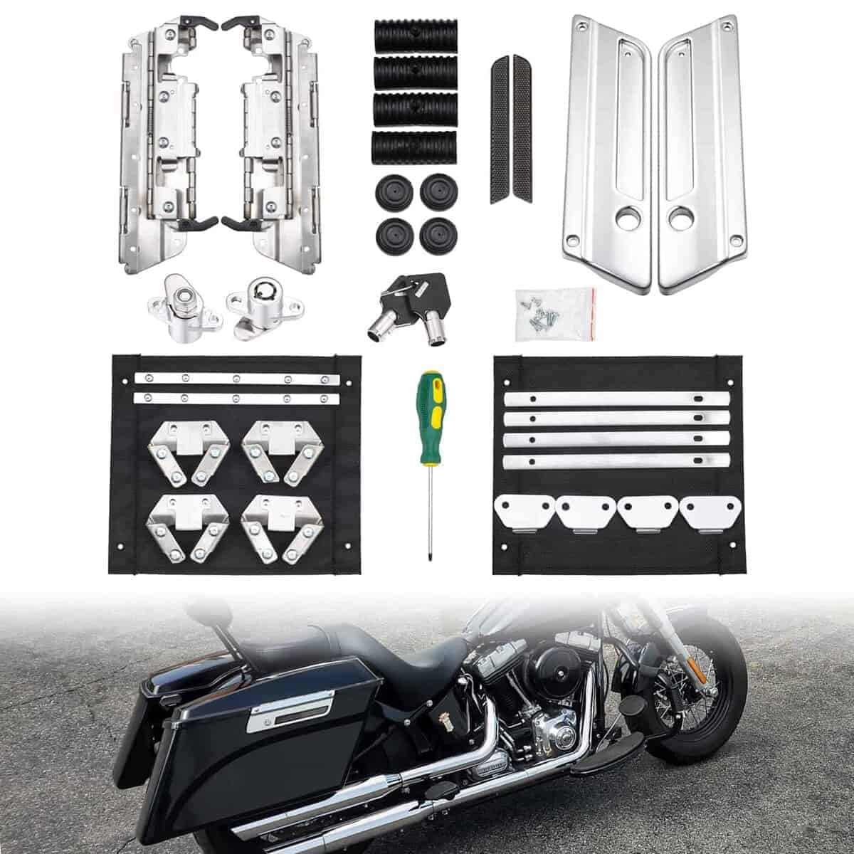Este kit de pestillo de alforja de posventa es la actualización perfecta para las alforjas duras en los modelos Harley Touring Street Glide, Electra Glide, Road King y Road Glide de 1993 a 2013. La cubierta de pestillo cromado no solo agrega estilo a tu motocicleta, sino que también protege las bisagras internas del pestillo de suciedad, golpes y daños externos, lo que prolonga la vida útil de tus alforjas. Las almohadillas de goma durables en este kit ofrecen un soporte resistente para las alforjas, evitando que se agrieten debido a las vibraciones durante la conducción. Fabricado con metal de alta calidad, las cubiertas de pestillo son duraderas y resistentes al desgaste, evitando la decoloración y el óxido con el tiempo, lo que garantiza una larga vida útil. La instalación es sencilla gracias al diseño de fácil instalación de este kit, que incluye un juego completo de accesorios para facilitar el proceso. Se recomienda encarecidamente la instalación profesional para garantizar un ajuste y funcionamiento adecuados. Con este kit, recibirás todo lo necesario para completar la instalación: 1 juego de hardware para alforjas, 1 cubierta de pestillo cromada, 2 reflectores de alforja negros, 1 bloqueo con 2 llaves y 4 monturas de goma para grommet, todo tal como se muestra en la imagen. Actualiza y protege tus alforjas con este kit de hardware de pestillos de alta calidad.