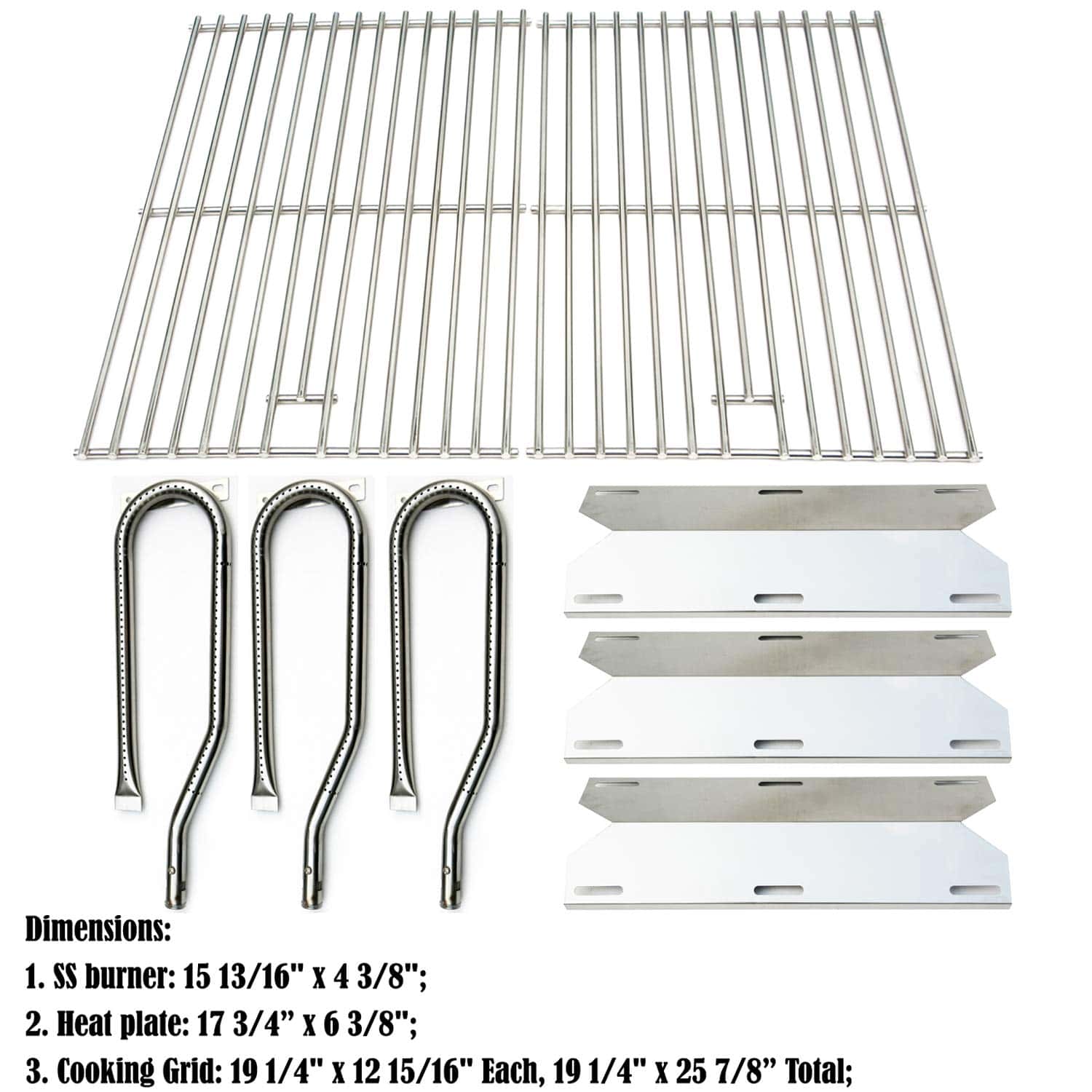 Kit de piezas de repuesto DG131 para parrilla de gas Jenn Air 720-0336 que incluye quemadores de gas, placas de calor y rejilla de cocina; Repuesto para parrilla de barbacoa de gas Jenn Air modelo 720-0336; Reemplaza los números de parte: NGCHP2, CG2150-72A; Incluye 3 quemadores de acero inoxidable, 3 placas de calor de acero inoxidable y 1 juego de 2 rejillas de cocina de acero inoxidable sólido.