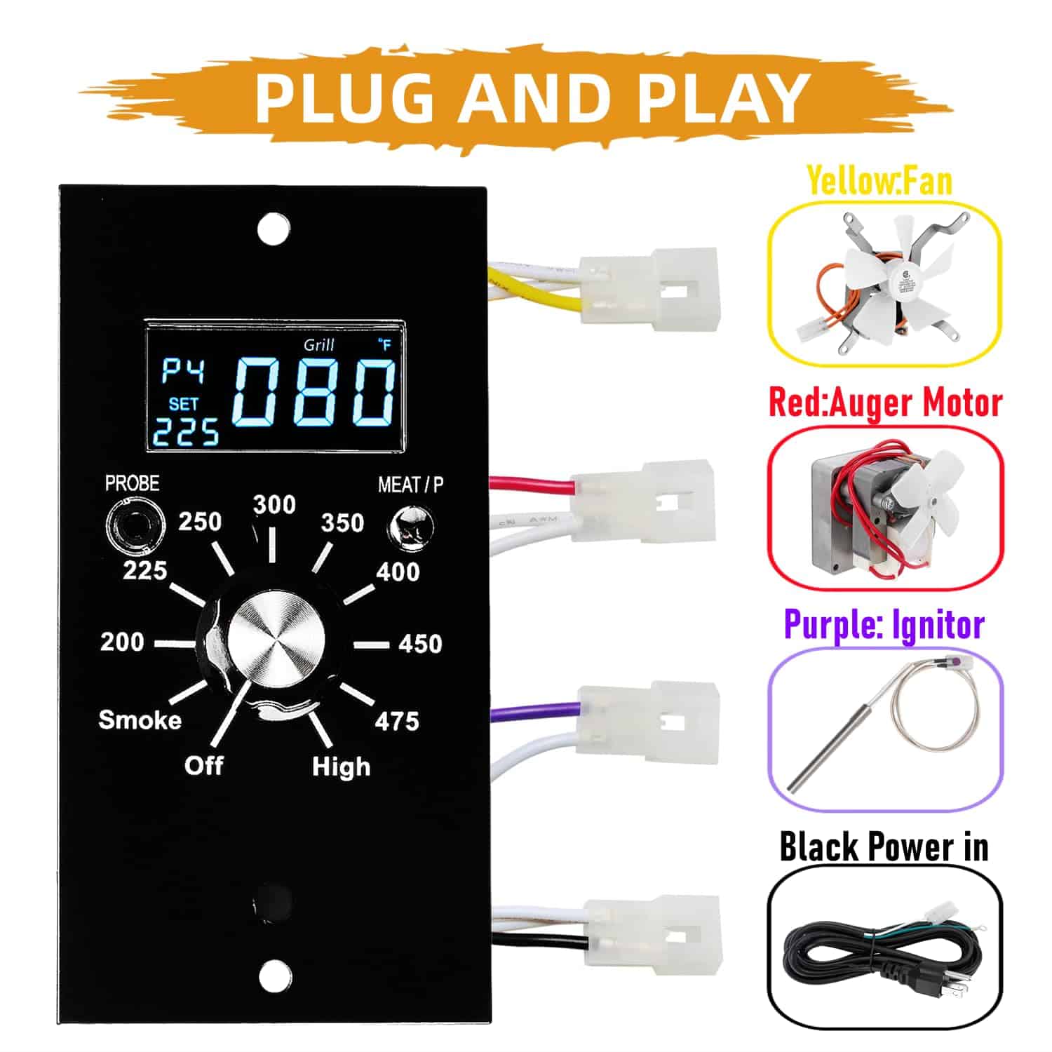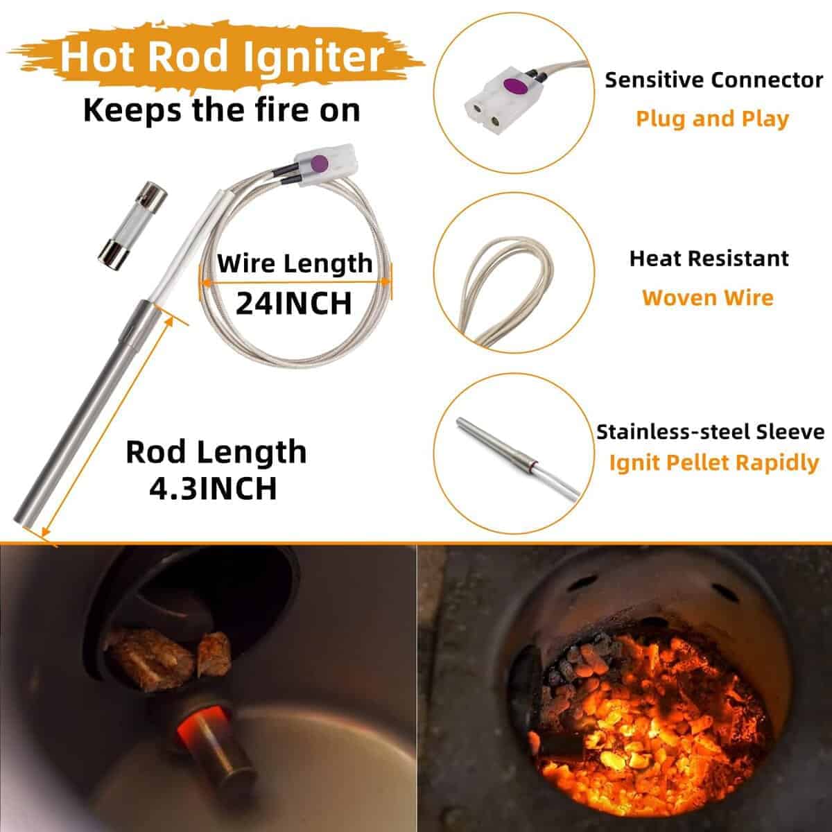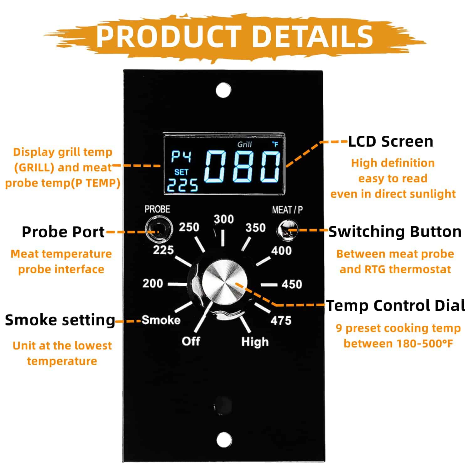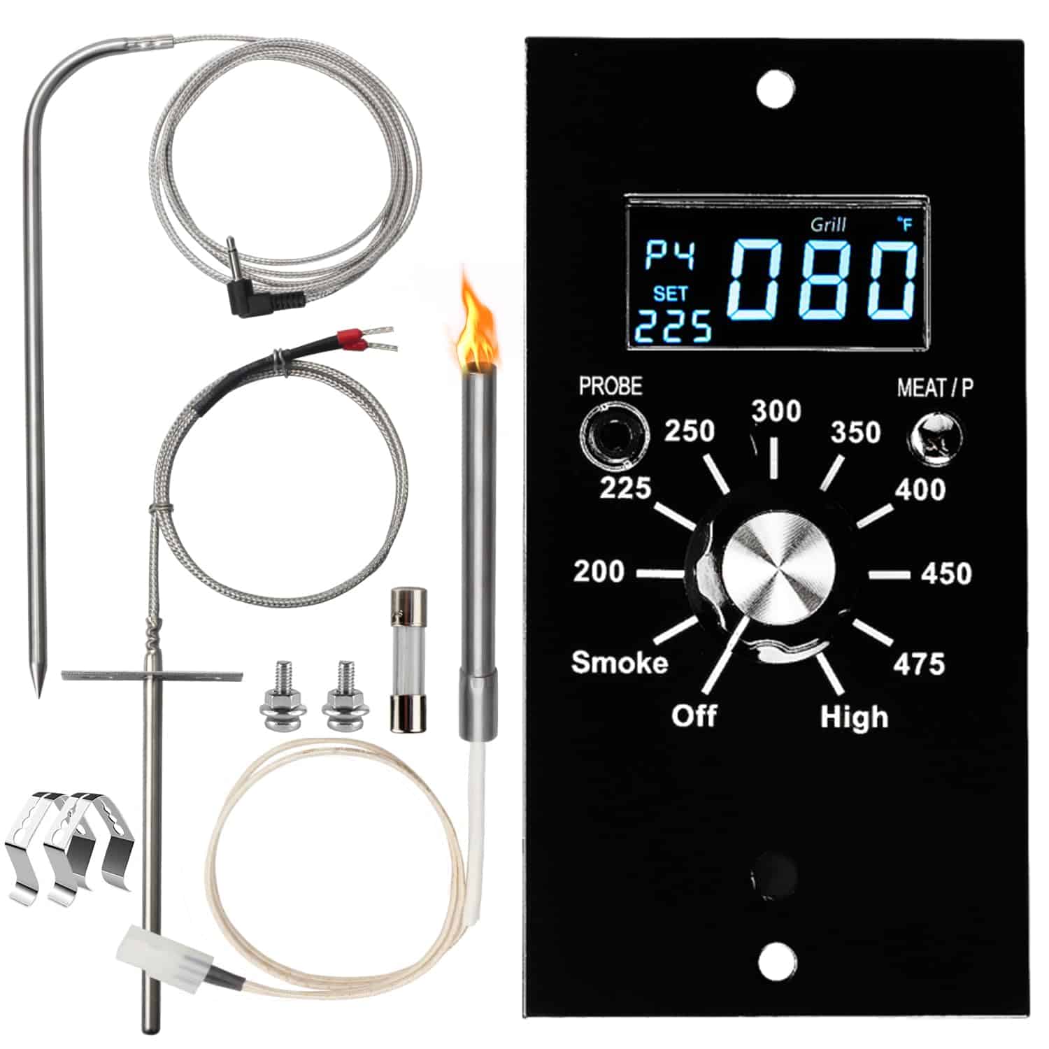 Este kit de repuesto para parrilla de pellets Pit Boss viene con un controlador de termostato digital mejorado, puertos para sondas de carne, 1 sonda RTD, 1 sonda de carne resistente al agua y 1 varilla de ignición con fusible.