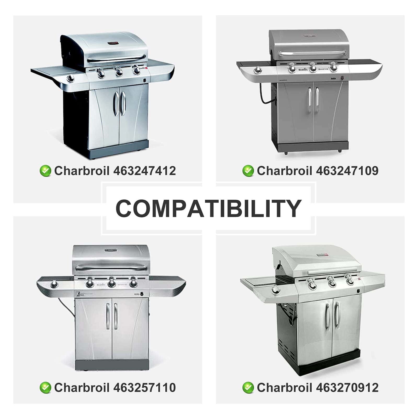 Piezas de repuesto diseñadas para los modelos CHARBROIL 463247412, 463257110, 463247109, 463270912, 463270913, 463261709, 463243911, 463243812, 463246910, 463270614, 463270613, 463270612, 463270611, 463246909, 463270610, 463244011, 463257010, 463247009, 463251512, 463215513, 463247512, 463247310, 463215512, 463212511, 463247209, 463267113, 463224611, 463225315, 463271314, 463271315, 463271913, 463225312, 463224912, 463231711, C-46G5CB, 463215713, 463271313, 463215714, 463271312, 463215712, 463270512, 463271309, 463262812, 463270909, 463271912, 466231711, 463262210, 463262211, 463263110, 463273614, 466224611, 466244011, 466244012, 466246910, 466247110, 466247310, 466247512, 466270610, 466270611.