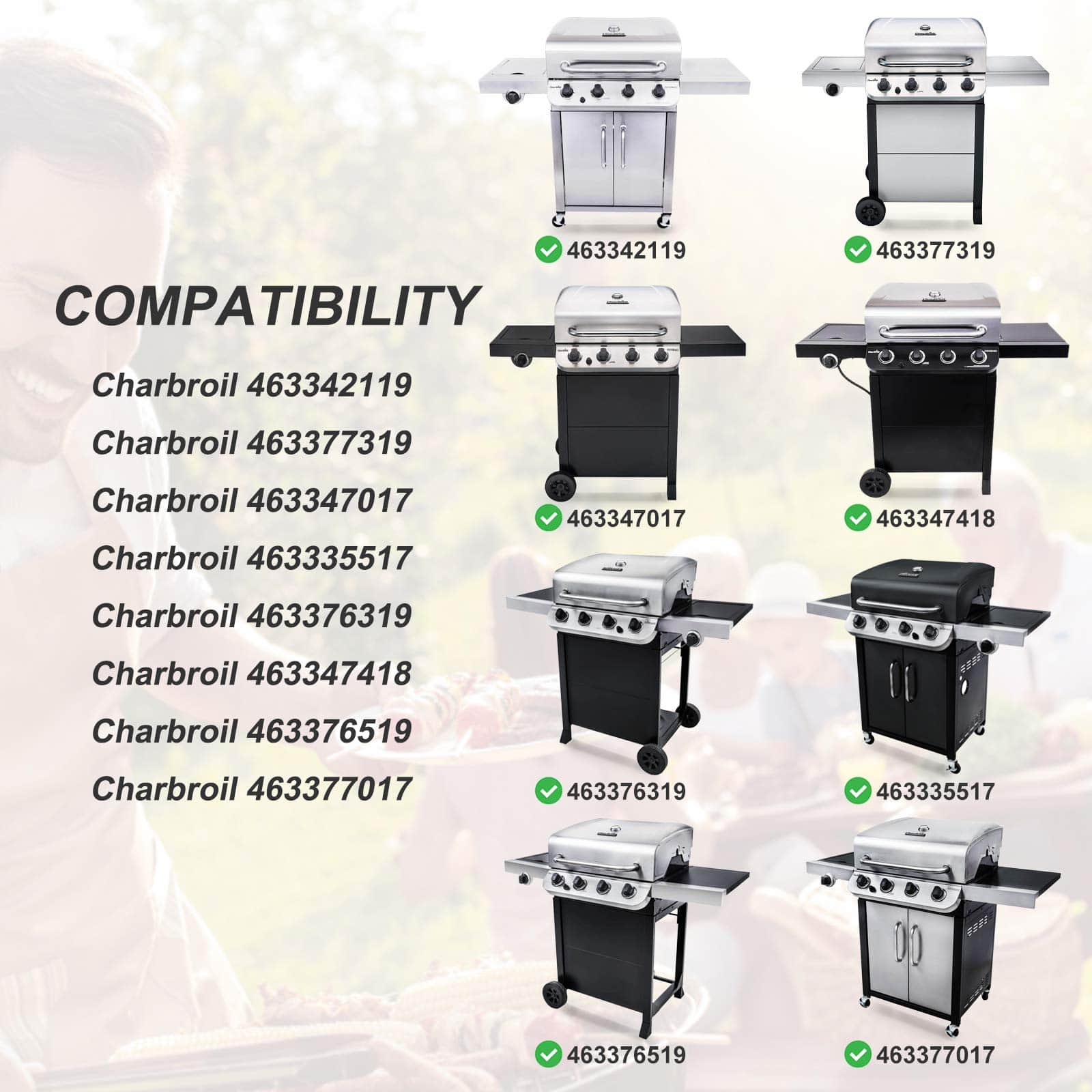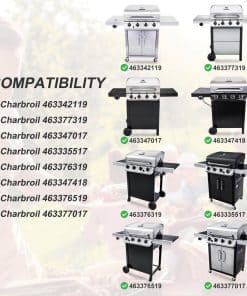 Compatible con parrillas Charbroil de 4 quemadores 463342119 463347017 463335517 463376017 463377319 463376319 463347418 463349917 463376519 463376217 463375619 463332718 463376017P1 463377017 463376419 463376819 463361017 463376117 463377117 463377217 463376619 466342119 463332719 463335519 463375719 466335517 466339417 466347019.