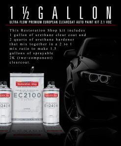 El Kit de Pintura para Automóviles Restoration Shop 1.5 Galones Ultra Flow Premium Clearcoat Europeo es la solución ideal para los talleres de carrocería de automóviles que buscan un clearcoat de calidad superior. Este kit incluye 1 galón de clear de uretano y 2 cuartos de acelerador de uretano que se mezclan en una relación de 2 a 1 para producir 1.5 galones de clearcoat 2K listo para rociar. Formulado con tecnología de resina de baja viscosidad y altos sólidos europea de vanguardia, este clearcoat ofrece una aplicación fácil, un flujo y nivelado excepcionales, una durabilidad excelente, un brillo y claridad excepcionales, y una distinción de imagen destacada. Es la elección preferida de los profesionales en acabados de carrocería de automóviles de alta gama y se utiliza tanto para aplicaciones de revestimiento general como para aplicaciones de manchas y paneles. Además, ofrece un rendimiento excepcional sobre todos los sistemas de base y se puede rociar tanto en entornos al aire libre como en entornos de horneado de corriente descendente. Con un bajo 2.1 VOC, cumple con la normativa nacional y con los requisitos de 2.1 VOC de California. Los productos de recubrimiento de calidad premium de Restoration Shop están fabricados en los EE. UU. con los ingredientes de la más alta calidad, lo que garantiza resultados profesionales consistentes y de alta calidad en todos los proyectos de pintura.