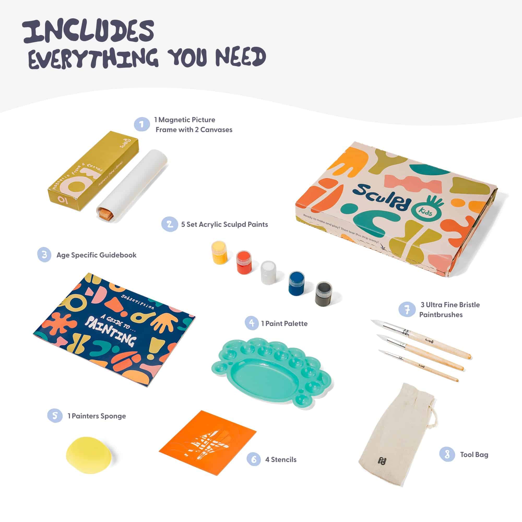 El kit de pintura para niños de Sculpd es perfecto para proyectos de pintura y manualidades, aumentando la percepción del color de su hijo, adecuado para el aprendizaje temprano de 4 a 6 años. Ayuda a sacar el máximo provecho de la imaginación de su hijo y dejar que su creatividad se desate. El kit contiene un marco magnético para fotos con 2 lienzos, set de 5 pinturas, paleta de pintura, 3 pinceles y esponja, 3 plantillas, formas de papel, papel de práctica y guía.