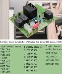 El kit de placa de relé de control 3106996.022 es compatible con aires acondicionados de RV de las series 579, 590, 595 y 600. Se adapta a los kits de placa de relé 3106997.004, 3106997.020, 3106997.012, 3316230.000, 3313189.000, 3316230.700, 3313191.000. Y se adapta al kit de termostato analógico Duo Therm 317541.009, 3107541.017, 3107541.025, 3107541.009, 3107546.008