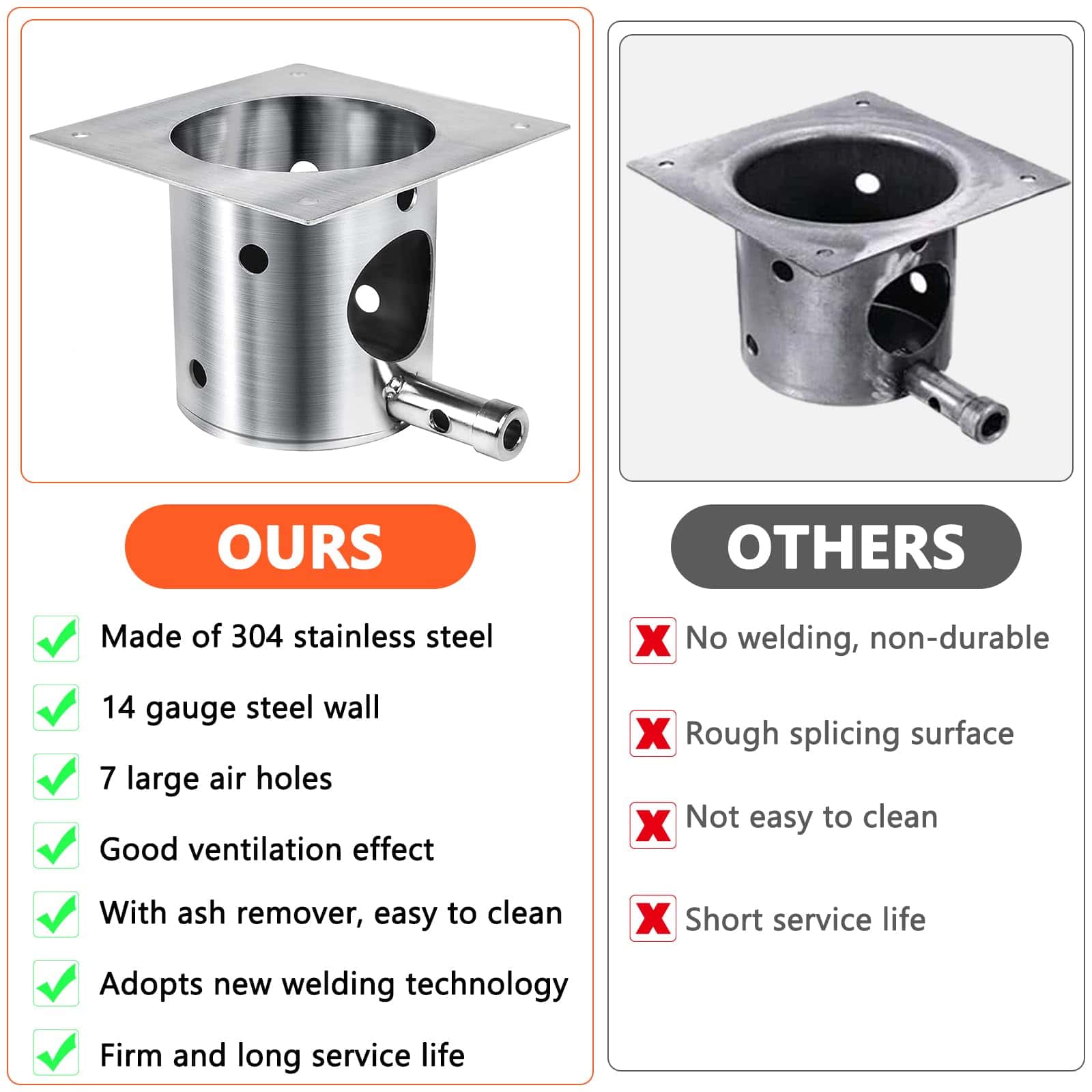 El potenciador de fuego de acero inoxidable 304 está diseñado para una mayor durabilidad y resistencia. Con dimensiones de 5″ x 3 1/2″ x 3 3/4″ y 7 orificios grandes de aire, garantiza una combustión eficiente. La varilla de encendido D2 de alta densidad ofrece un rendimiento potente con sus 80W/20V de potencia.