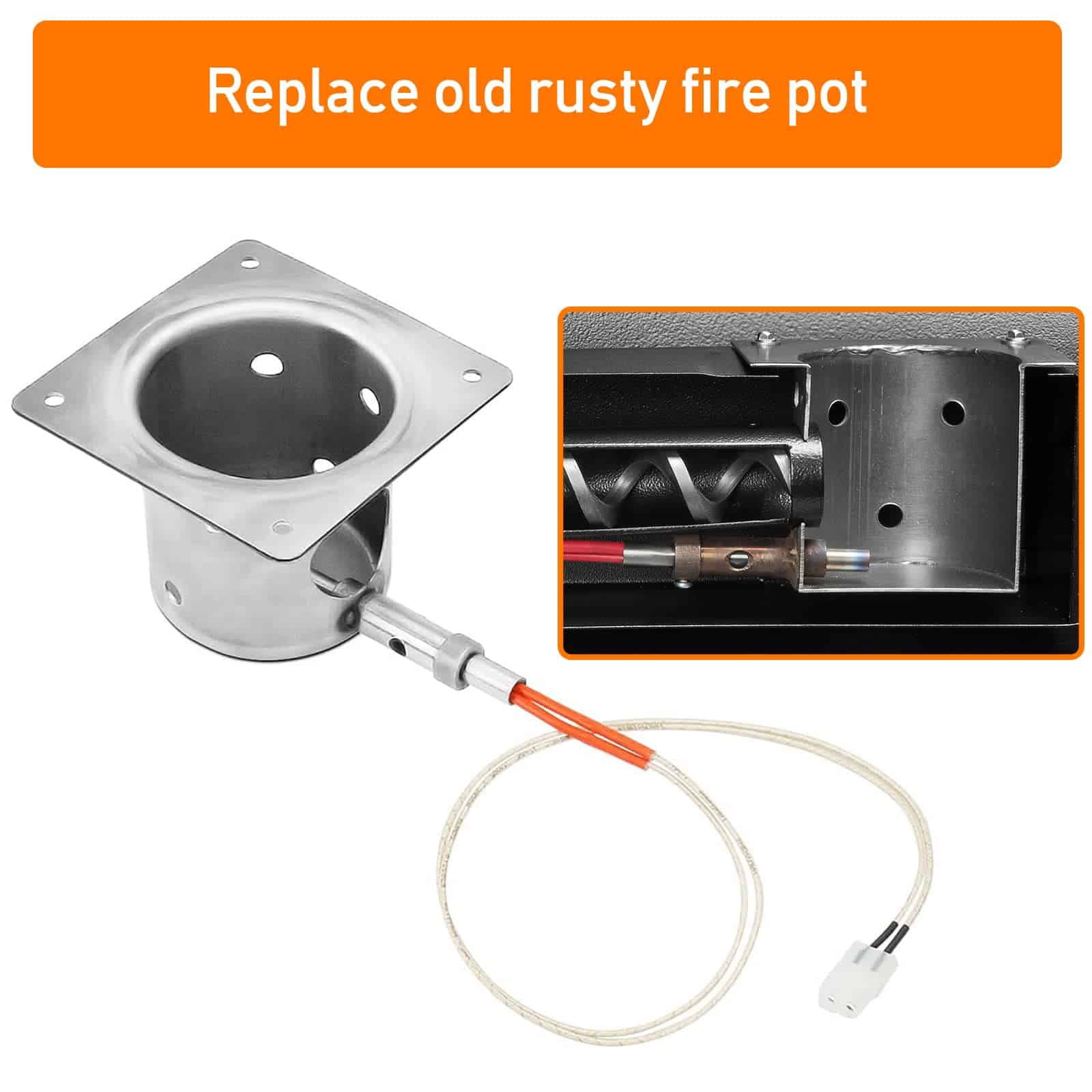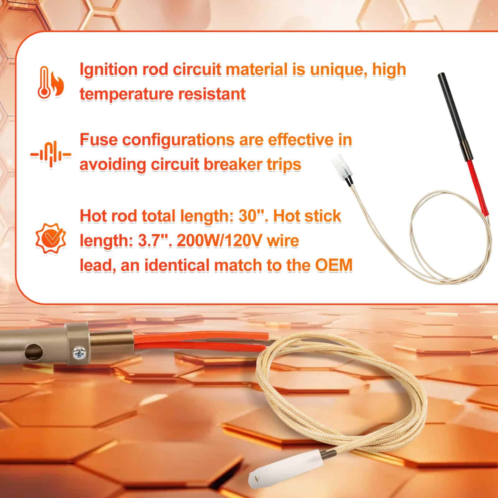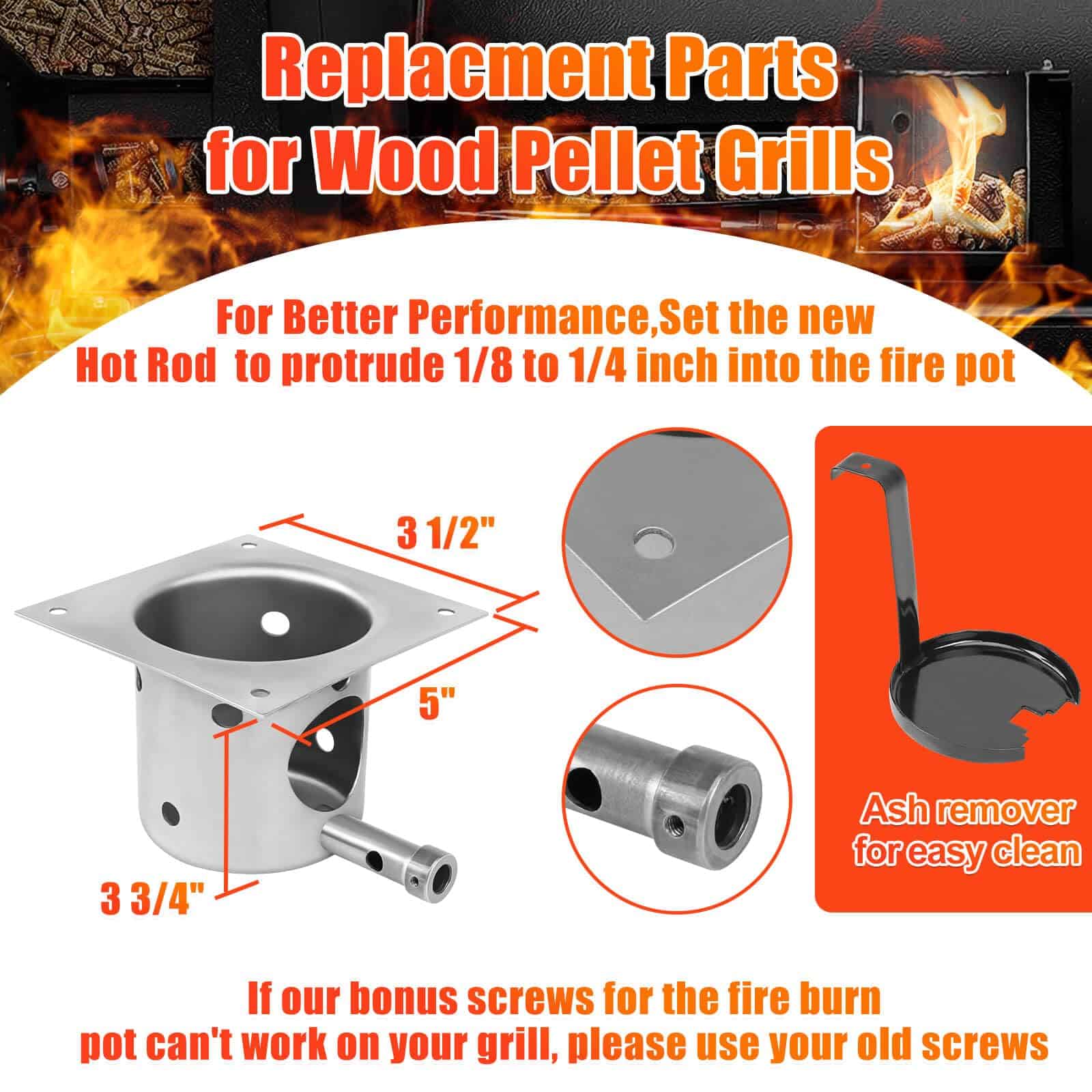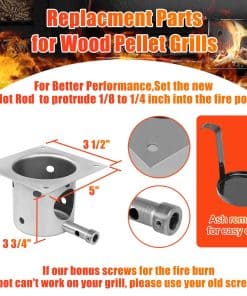 Piezas de reemplazo para parrilla de pellets que se ajustan a la mayoría de las parrillas de pellets Traeger y Pit Boss. No son compatibles con parrillas TR20 y Pit Boss 1150. El potenciador de fuego tiene dimensiones de 5″ x 3 1/2″ x 3 3/4″, 7 orificios grandes de aire y pared de acero calibre 14. La varilla caliente mide 30″ de largo con un bastón caliente de 3.7″. Elemento calefactor de cartucho de alta densidad, 200W/120V con cable de plomo, una coincidencia idéntica con la varilla caliente OEM. El paquete incluye 1 potenciador de fuego, 1 encendedor de varilla caliente, 1 fusible y juego de tornillos. Fácil de instalar, solo toma alrededor de 10 minutos. Las instrucciones de montaje están incluidas para una fácil instalación. Asegúrese de ajustar la varilla caliente a 1/8 a 1/4 de pulgada en el potenciador de fuego para un mejor rendimiento.
