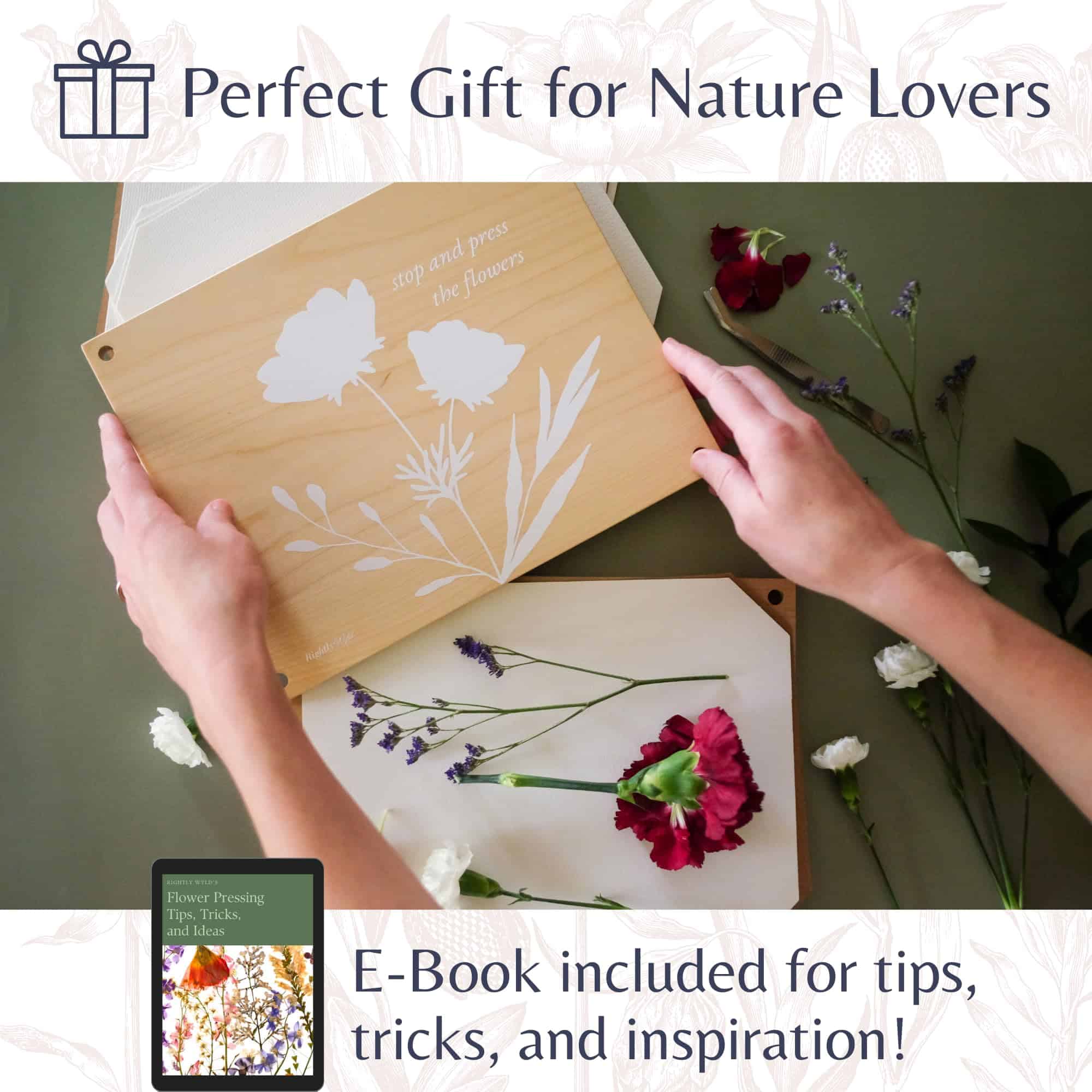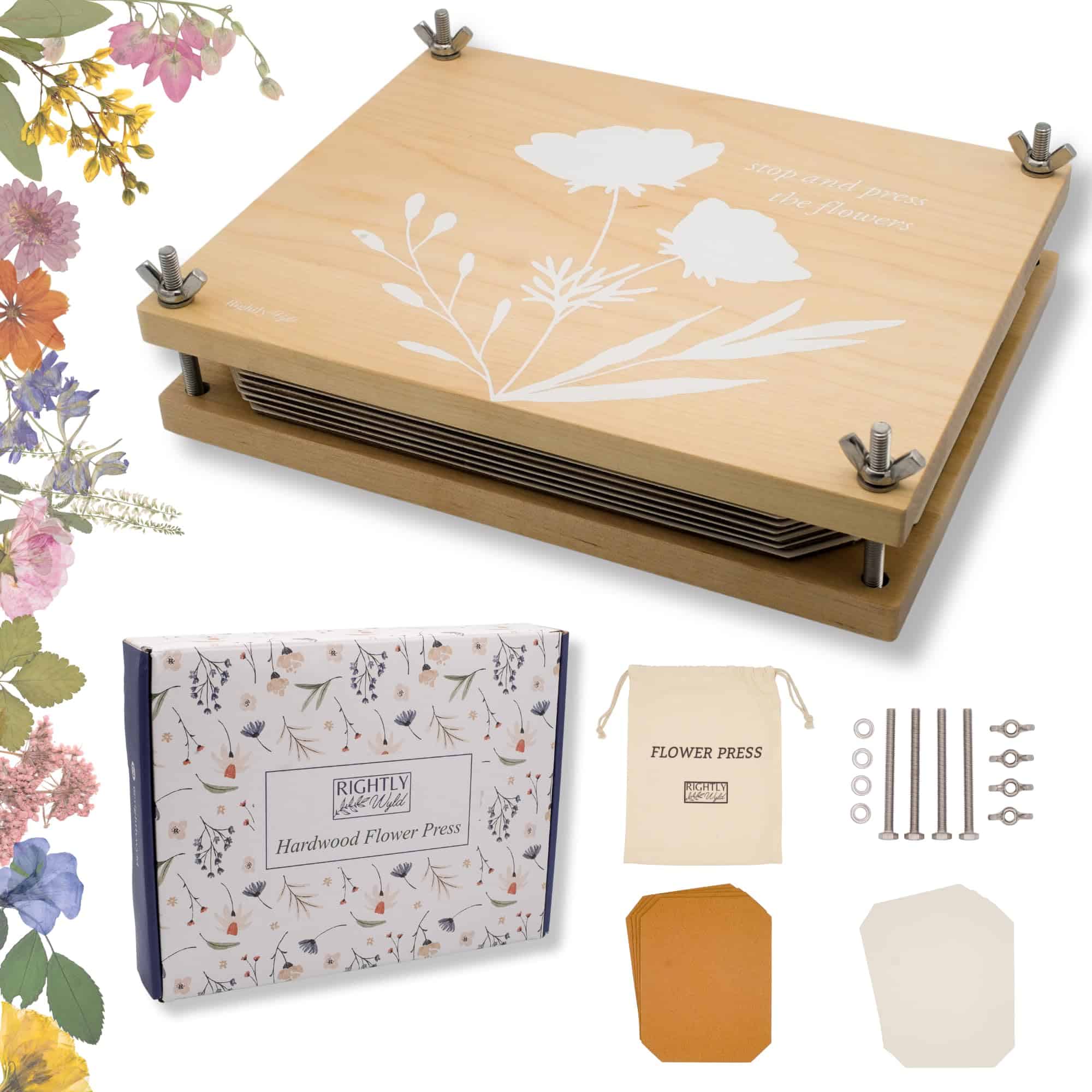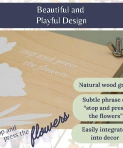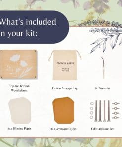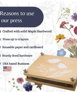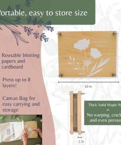 Kit de Prensa de Flores Rightly Wyld para Adultos: Explora la solución perfecta para preservar la belleza de la naturaleza con nuestro kit de flores prensadas secas para manualidades. Este kit de prensado de flores cuenta con un diseño original grabado con «detén y prensa las flores». Elaborado con tablones de madera sólida de arce y reforzado con pernos, tuercas y herrajes de acero, este kit de prensado de plantas asegura una presión constante para resultados superiores y una durabilidad de larga duración. Con nuestro kit de manualidades de flores, presiona sin esfuerzo hasta 8 capas de flores al mismo tiempo, cortesía de la generosa provisión de cartón reutilizable y papel absorbente proporcionado. Las dimensiones de la caja regalo de nuestro kit de manualidades de flores prensadas miden 9 L, 12 W y 2 H, mientras que la prensa de flores en sí mide 8 por 10 pulgadas, con tablones de madera que tienen un grosor de 0.5 pulgadas. Ya seas nuevo en la prensa de flores o un entusiasta experimentado, nuestros suministros de manualidades de prensado de flores para adultos tienen instrucciones fáciles de seguir y un e-book complementario que ofrece una gran cantidad de consejos e ideas para la creación de exquisitas creaciones de flores prensadas. Empaquetado en una exquisita bolsa de almacenamiento de lona, esta prensa de flores de calidad heredada es el regalo definitivo para amantes de la naturaleza, artesanos y cualquier persona que admire el encanto de las flores secas. Acerca de Nosotros: Rightly Wyld es un pequeño negocio familiar. Nos encanta diseñar productos convenientes y reflexivos que tú y tu familia puedan usar en la vida diaria. Este kit de prensado de flores para niños y adultos es un esfuerzo por hacer precisamente eso. Esperamos que ames nuestro kit de prensa de flores para adultos y niños tanto como nosotros. ¡Gracias por apoyar nuestro negocio familiar!