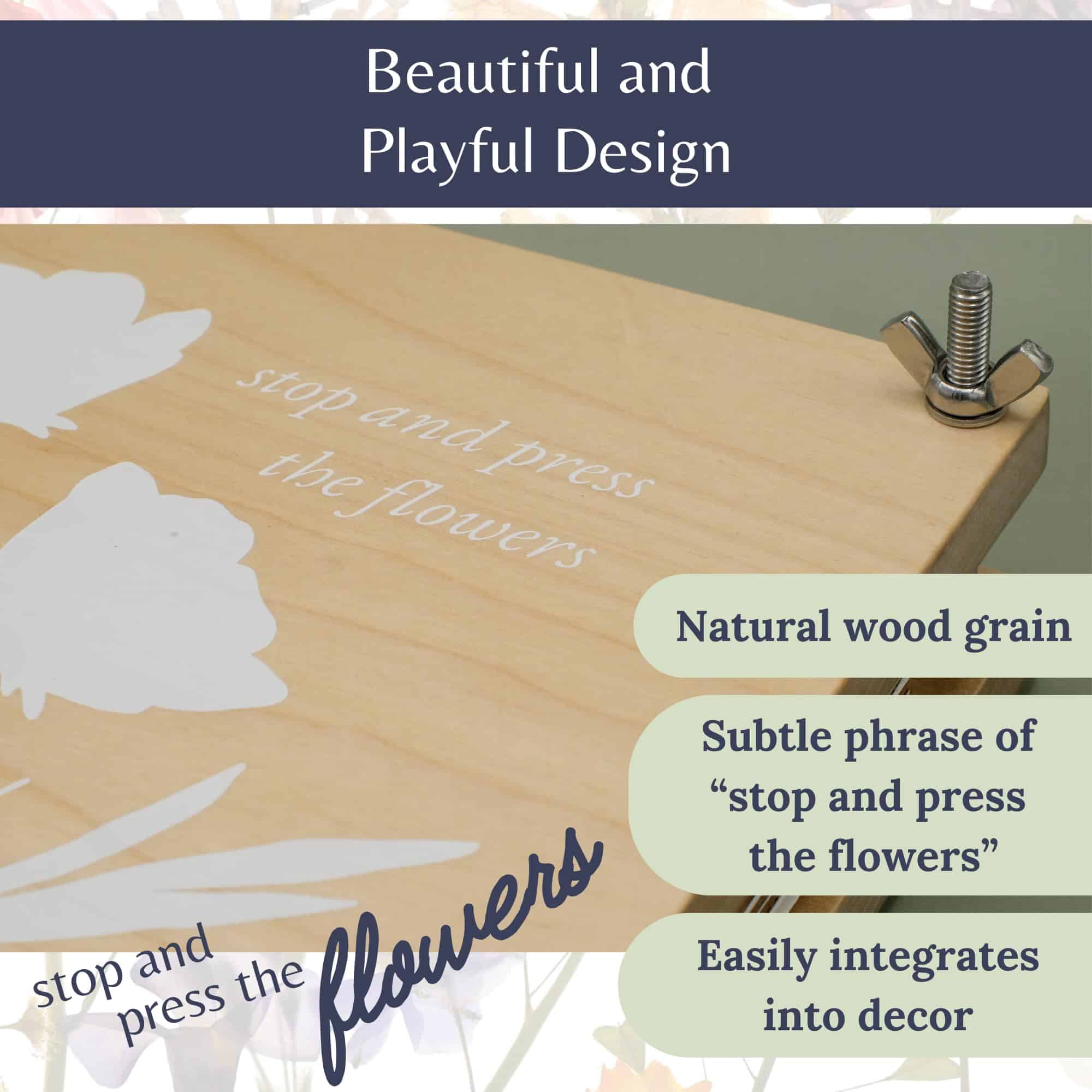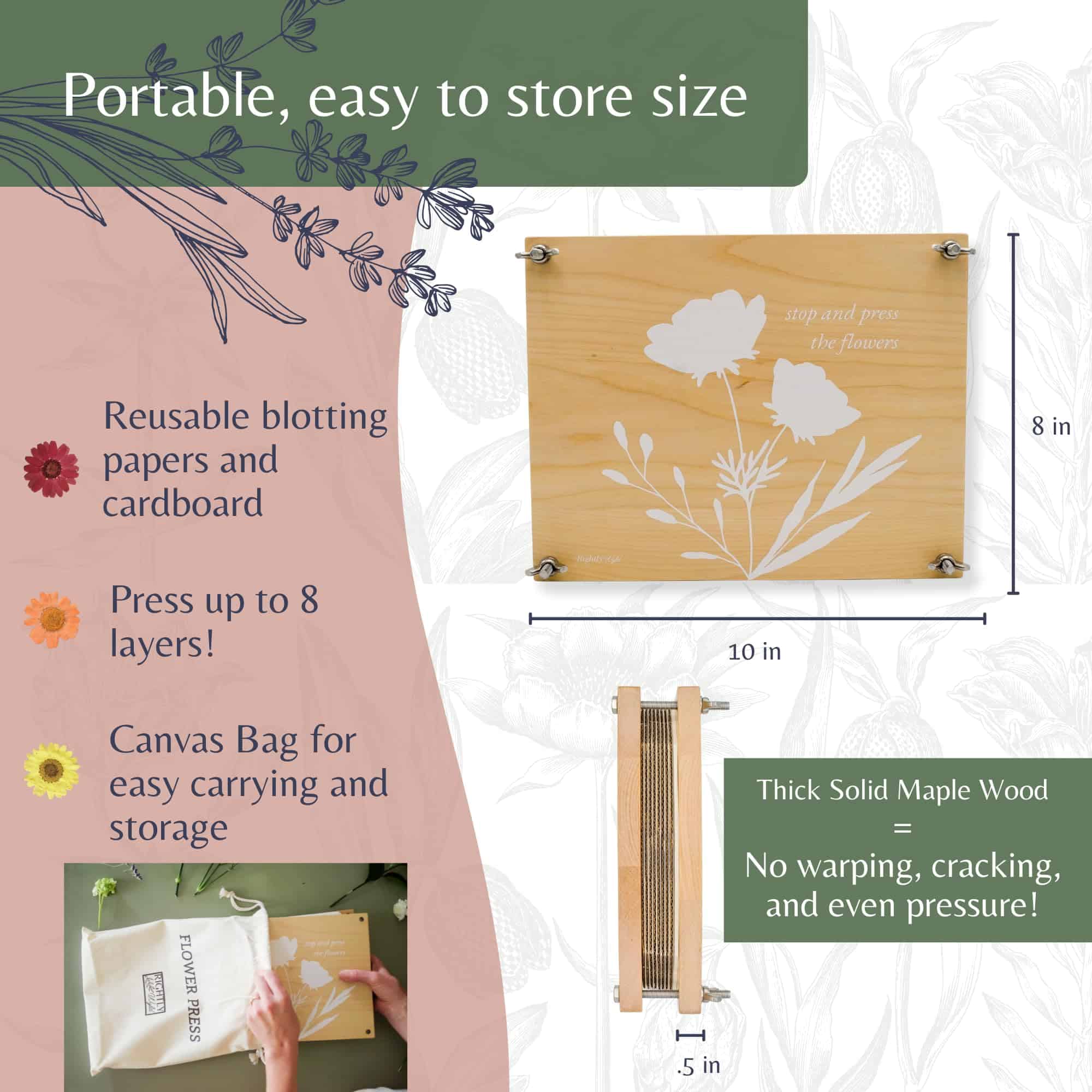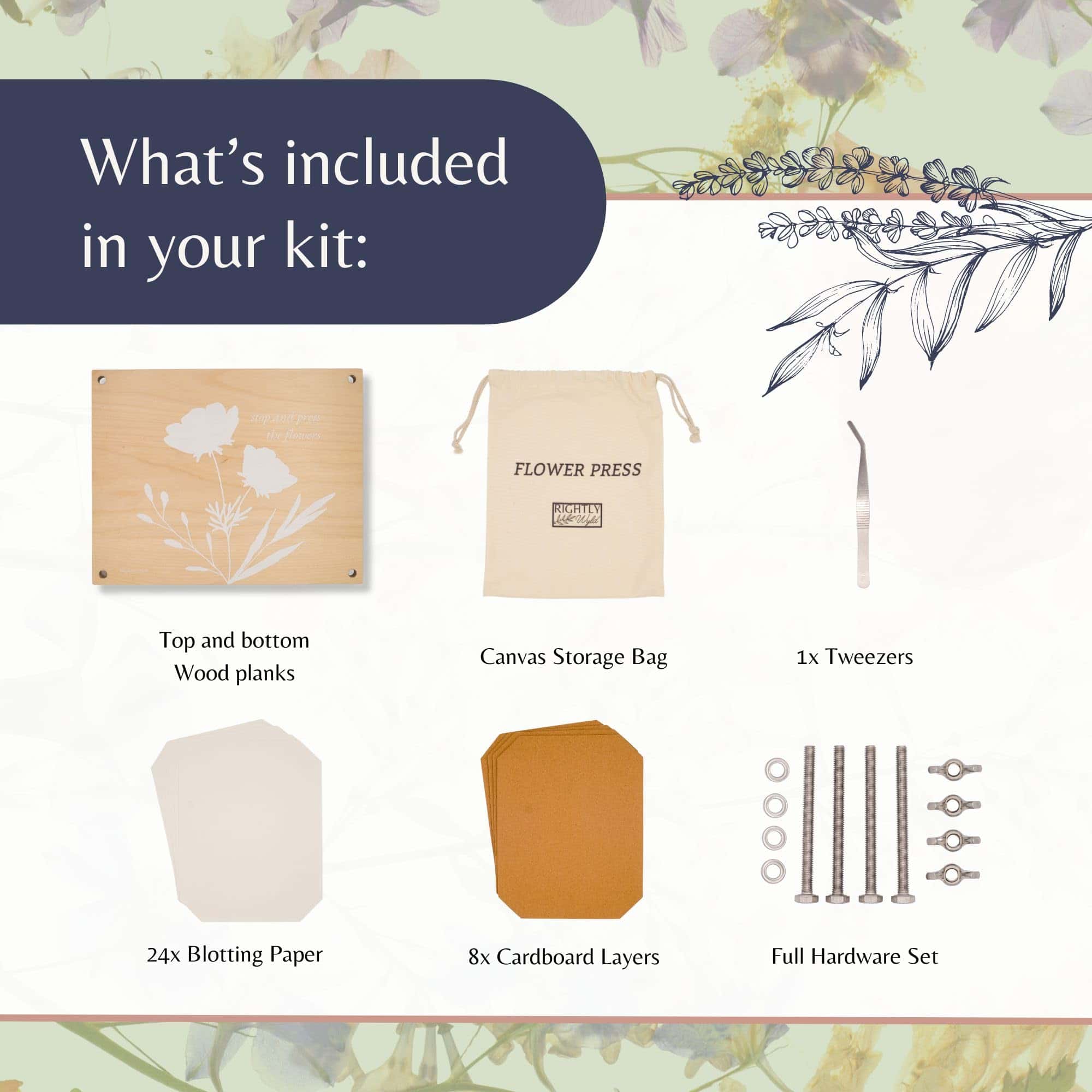 Kit de Prensa de Flores Rightly Wyld para Adultos: Explora la solución perfecta para preservar la belleza de la naturaleza con nuestro kit de flores prensadas secas para manualidades. Este kit de prensado de flores cuenta con un diseño original grabado con «detén y prensa las flores». Elaborado con tablones de madera sólida de arce y reforzado con pernos, tuercas y herrajes de acero, este kit de prensado de plantas asegura una presión constante para resultados superiores y una durabilidad de larga duración. Con nuestro kit de manualidades de flores, presiona sin esfuerzo hasta 8 capas de flores al mismo tiempo, cortesía de la generosa provisión de cartón reutilizable y papel absorbente proporcionado. Las dimensiones de la caja regalo de nuestro kit de manualidades de flores prensadas miden 9 L, 12 W y 2 H, mientras que la prensa de flores en sí mide 8 por 10 pulgadas, con tablones de madera que tienen un grosor de 0.5 pulgadas. Ya seas nuevo en la prensa de flores o un entusiasta experimentado, nuestros suministros de manualidades de prensado de flores para adultos tienen instrucciones fáciles de seguir y un e-book complementario que ofrece una gran cantidad de consejos e ideas para la creación de exquisitas creaciones de flores prensadas. Empaquetado en una exquisita bolsa de almacenamiento de lona, esta prensa de flores de calidad heredada es el regalo definitivo para amantes de la naturaleza, artesanos y cualquier persona que admire el encanto de las flores secas. Acerca de Nosotros: Rightly Wyld es un pequeño negocio familiar. Nos encanta diseñar productos convenientes y reflexivos que tú y tu familia puedan usar en la vida diaria. Este kit de prensado de flores para niños y adultos es un esfuerzo por hacer precisamente eso. Esperamos que ames nuestro kit de prensa de flores para adultos y niños tanto como nosotros. ¡Gracias por apoyar nuestro negocio familiar!