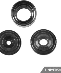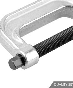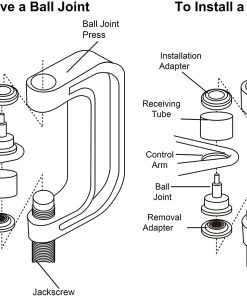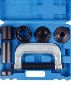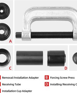 Kit de prensa de junta de rótula y herramienta de extracción de junta U DAYUAN con adaptadores 4×4 para la mayoría de coches y camionetas 2WD y 4WD. Incluye adaptador de extracción (1.148″ L x 1/2″ I.D. x 3″ O.D.), tornillo, copa de instalación (3.676″ L x 1-3/4″ I.D. x 2″ O.D.), adaptador de instalación (1.122″ L x 0.941″ I.D. x 3″ O.D.), prensa de tornillo de fuerza (Longitud interior: 6.22″/158mm), copa receptora (2-1/2″ L x 2″ I.D. x 2-1/4″ O.D.), tubo receptor (1-3/4″ L x 1-3/4″ I.D. x 2″ O.D.), tubo receptor (1-3/4″ L x 2-1/4″ I.D. x 2-1/2″ O.D.), tubo receptor (2-1/4″ L x 2.723″ I.D. x 3″ O.D.), adaptador de copa de instalación (0.845″ L x 1.879″ I.D. x 2-1/4″ O.D.). Para instalar una junta de rótula: 1. Limpie el brazo de control del vehículo y cubra el diámetro interior con un lubricante ligero. 2. Inserte la junta de rótula de reemplazo lo más recto posible en el brazo de control del vehículo. 3. Ensamble la Prensa de Junta de Rótula sobre el brazo de control del vehículo. Seleccione el tamaño correcto de Tubo Receptor y colóquelo encima del brazo de control del vehículo. 4. Coloque el Adaptador de Instalación entre el Tubo Receptor y la Prensa de Junta de Rótula. Luego, coloque el Adaptador de Extracción entre la junta de rótula y el Tornillo de Rosca. 5. Verifique la alineación de todas las partes del Kit de Junta de Rótula. Luego, apriete el Tornillo de Rosca hasta que la junta de rótula del vehículo esté sellada firmemente.