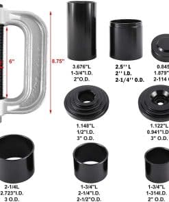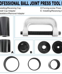 Característica: El Kit de Prensa de Rótulas Herramienta de Rótula / Herramienta de Extracción de Buje con Adaptador 4WD puede quitar eficazmente piezas a presión incluyendo rótulas, juntas universales, pasadores de anclaje de frenos y más en la mayoría de los vehículos 2WD y 4WD sin quitar el brazo de control del vehículo. Construido en acero forjado resistente con acabado de óxido negro en los adaptadores para una máxima resistencia y durabilidad que resiste el óxido y la corrosión. El juego de prensa de abrazadera forjada de servicio pesado es excelente para la extracción e instalación de piezas a presión como rótulas, junta universal y pasadores de anclaje de frenos de camiones. El paquete incluye: 3x Tubo Receptor, 1x Adaptador de Extracción, 1x Adaptador de Instalación, 1x Tornillo, 1x Adaptador de Copa de Instalación, 1x Prensa de Tornillo, 1x Copa Receptora, 1x Copa de Instalación. Guía de Operación: 1. Retire todos los retenedores de anillo de bloqueo de los pasadores de anclaje de frenos. 2. Coloque la prensa en C sobre el freno de tambor. 3. Apriete el tornillo forzado hasta que el pasador de anclaje se haya eliminado.