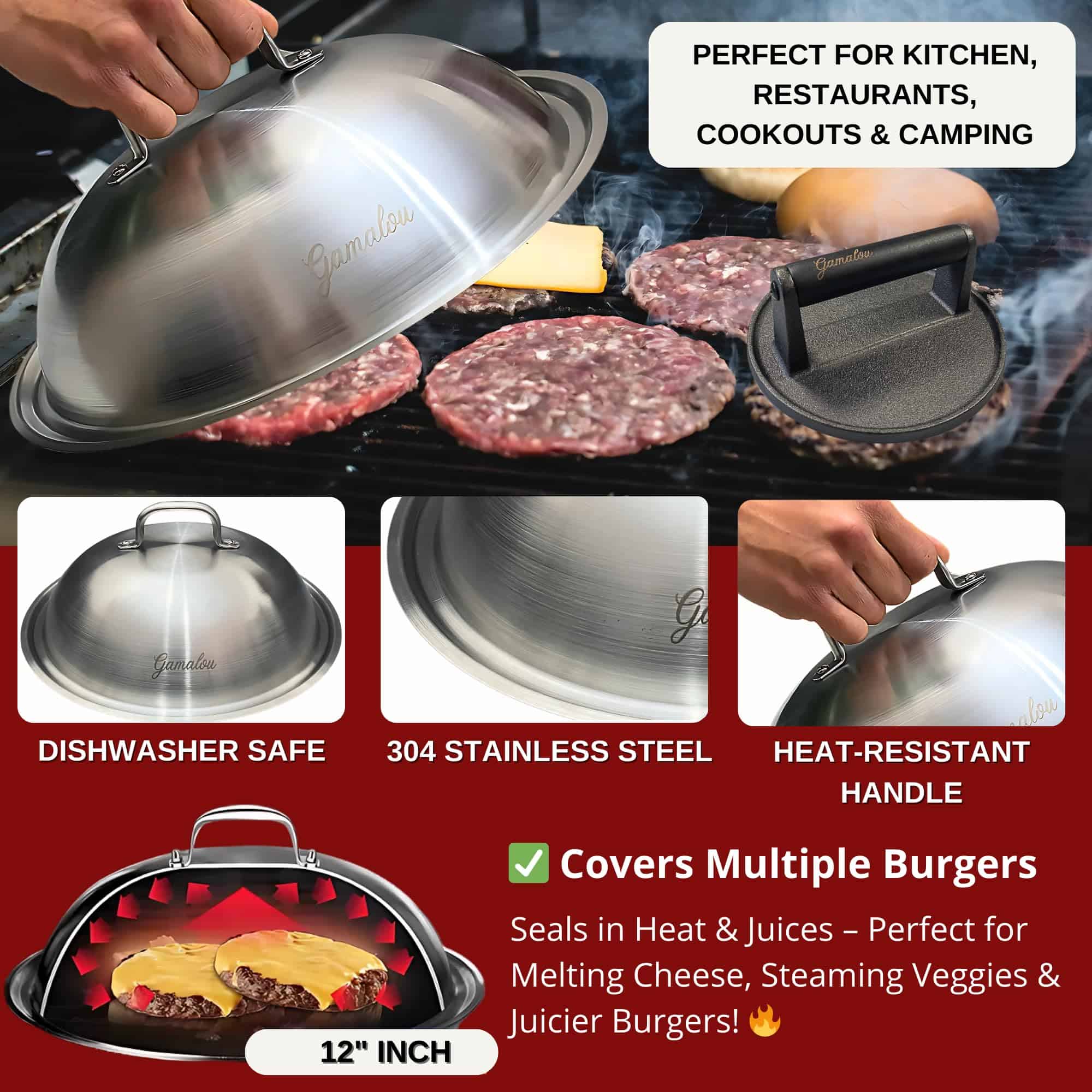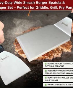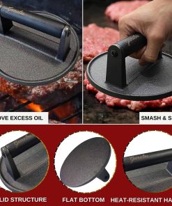 Kit de prensa para hamburguesas de hierro fundido pesado para hamburguesas aplanadas perfectas — La prensa plana de 7 pulgadas garantiza una distribución uniforme del calor y un sellado superior. Obtenga hamburguesas crujientes y jugosas cada vez con esta herramienta esencial. La cúpula de fusión de acero inoxidable de 12″ atrapa el calor para un derretimiento de queso más rápido, vaporización eficiente y una cocción más uniforme. Perfecta para usar con planchas Blackstone y otras planchas, eleva tu juego de hamburguesas y vegetales al nivel de restaurante. Incluye una espátula de hamburguesas ergonómica y un raspador de parrilla, ambos fabricados en acero inoxidable resistente con mangos ergonómicos de tacto frío. Perfecto para voltear, aplanar y limpiar. Cada componente de acero inoxidable es apto para lavavajillas. La prensa de hierro fundido debe lavarse a mano, secarse completamente y aceitarse ligeramente para evitar la oxidación y garantizar una durabilidad a largo plazo.