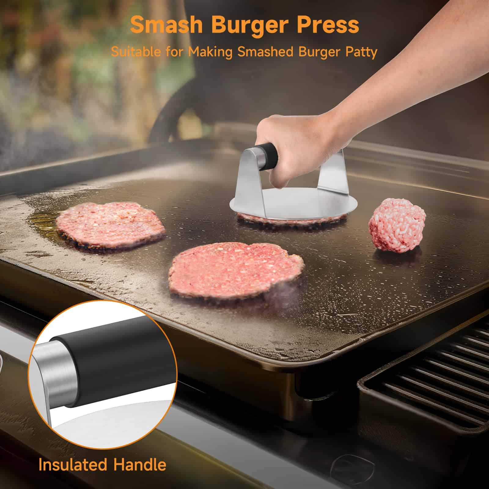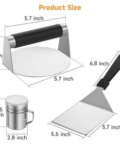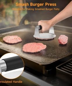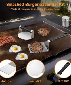 2. Material de Acero Inoxidable: Fabricados en acero inoxidable duradero grado alimenticio, estos utensilios para hamburguesas son resistentes al óxido y sólidos, garantizando una fiabilidad duradera. El kit Smash para hamburguesas es antiadherente, fácil de limpiar y apto para lavavajillas para un mantenimiento sin esfuerzo.