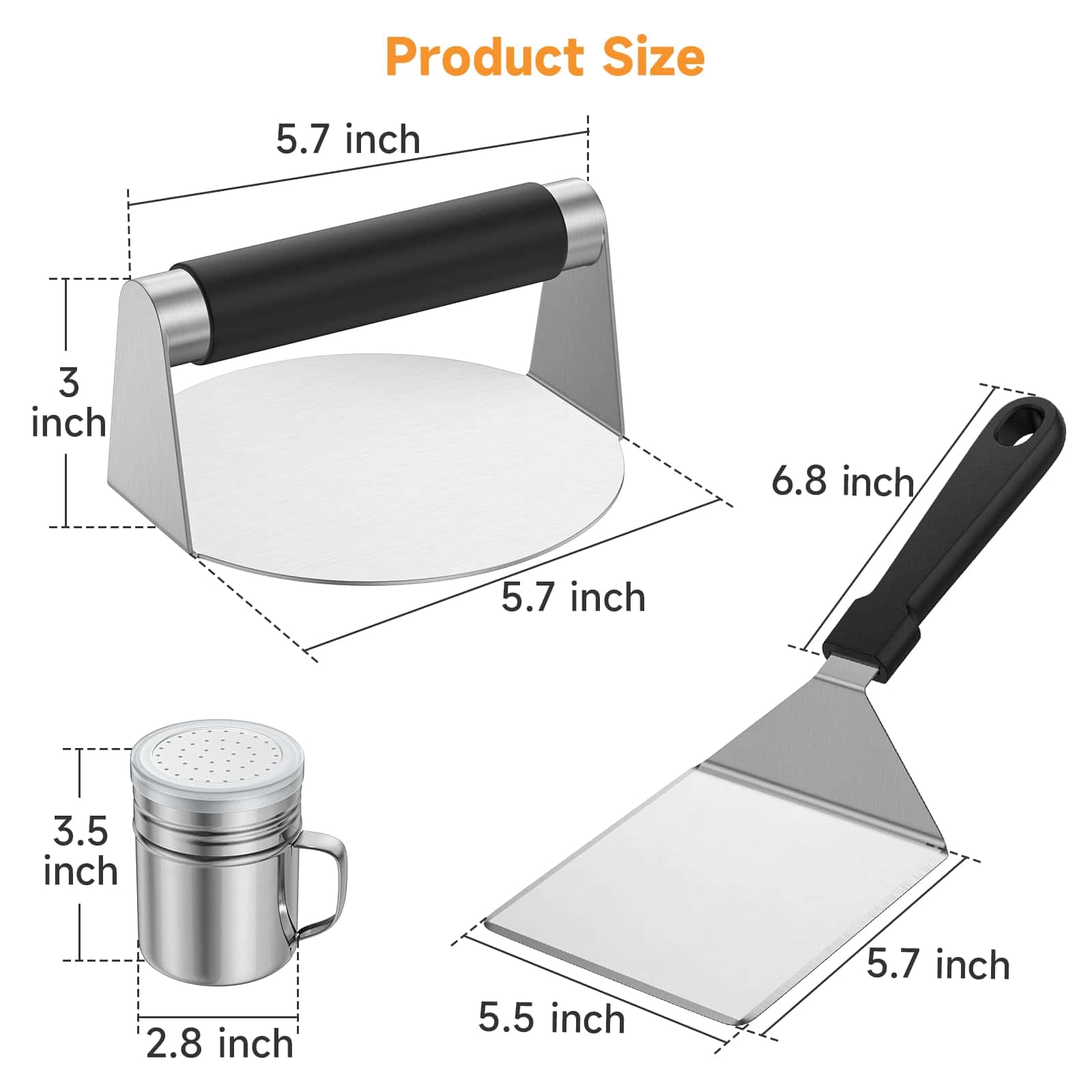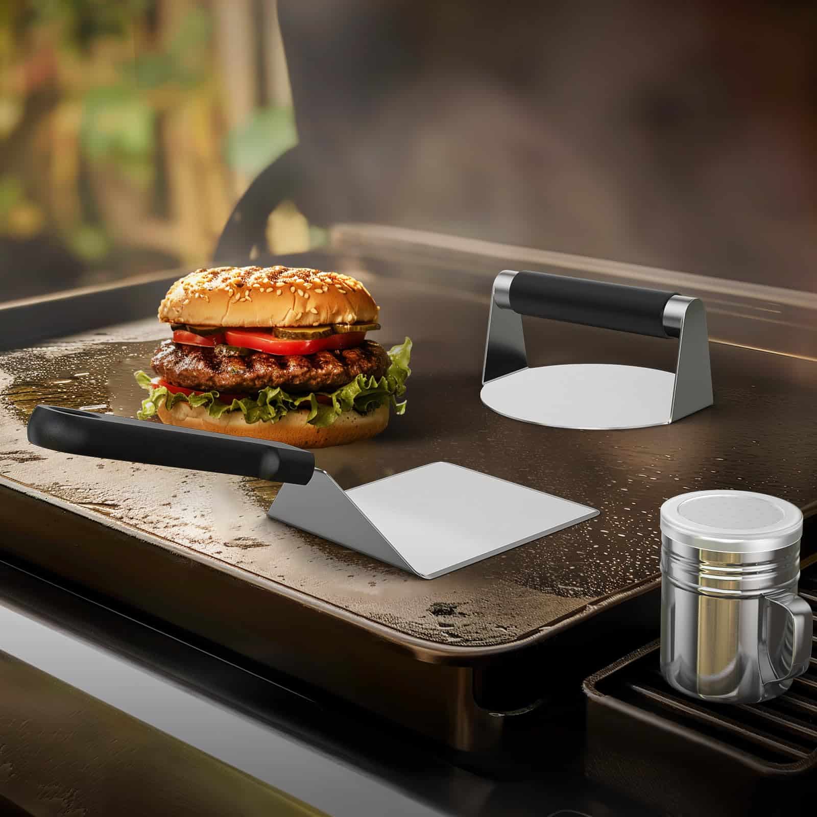 1. Kit de 3 Piezas para Hamburguesas: Crea deliciosas hamburguesas caseras sin esfuerzo con nuestra prensa redonda para hamburguesas, espátula para plancha grande y agitador de condimentos. Solo sigue nuestro sencillo proceso de 3 pasos: presiona, agrega condimentos y voltear. ¡El kit de prensa para hamburguesas Smash es perfecto para cocinar en casa o en barbacoas al aire libre para impresionar a tus amigos y familia en poco tiempo!.