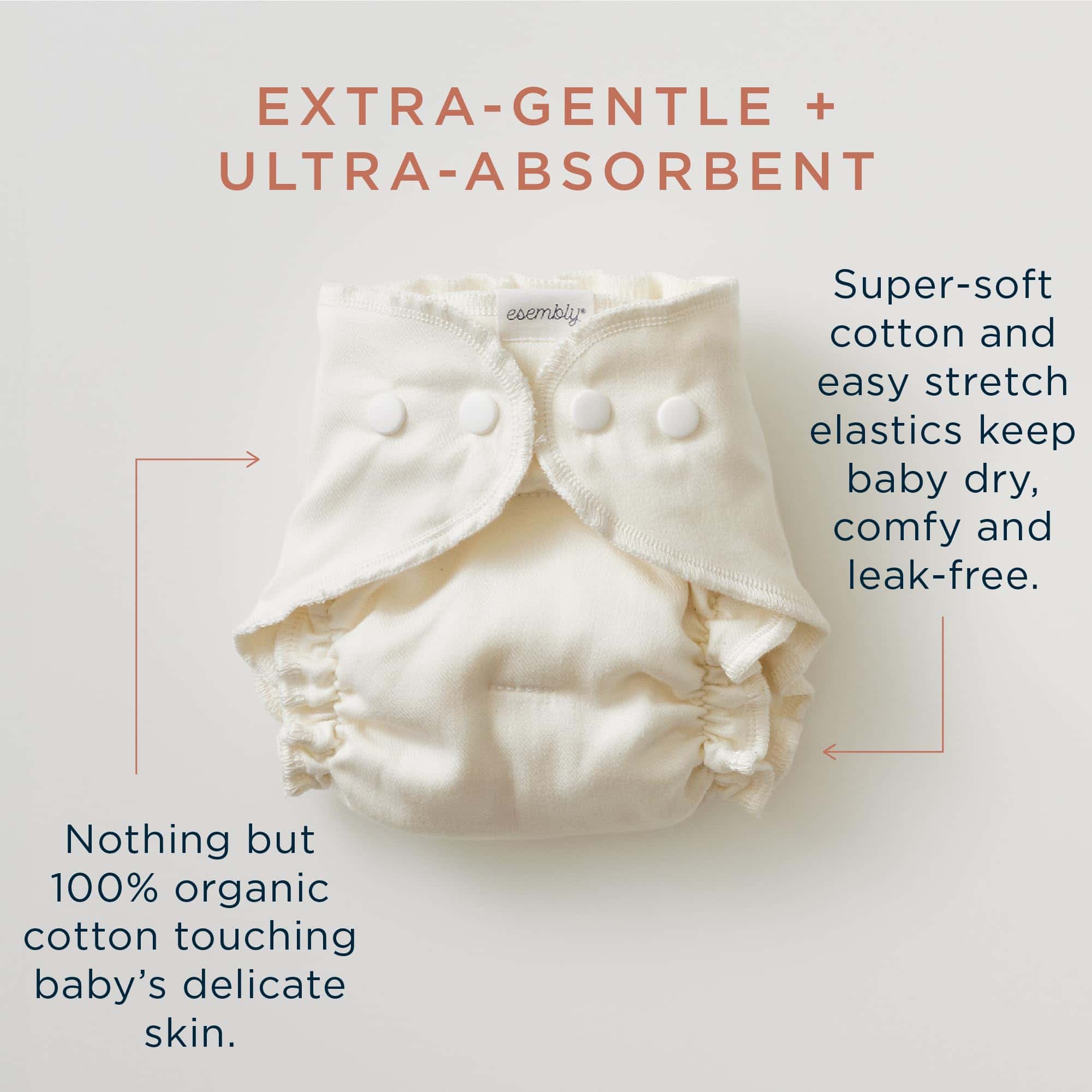 Los pañales de tela Esembly están hechos de algodón orgánico certificado y botellas de plástico recicladas. Todos los tejidos están certificados según el estándar 100 OEKO-TEX. ¡Sin rellenos sanitarios, resistentes a los derrames y muy absorbentes! Los pañales reutilizables en este kit pueden evitar que se tiren más de 1,000 pañales a la basura cada año. Regalo perfecto para un amigo consciente del medio ambiente. Estos pañales de tela vienen en dos tallas ajustadas, Talla 1 (7-17 libras) y Talla 2 (18-35 libras), para llevar al bebé desde el nacimiento hasta el entrenamiento para ir al baño. ¿Intimidado por la idea de lavar pañales? ¡No te preocupes! Los fundadores de Esembly pasaron más de una década lavando pañales de tela para su servicio de pañales en la ocupada ciudad de Nueva York y saben exactamente cómo hacer que el lavado de pañales sea lo suficientemente fácil como para que cualquier padre cansado lo domine. Todo lo que se necesita son 2 cargas de lavandería por semana siguiendo sus instrucciones súper simples y paso a paso (incluidas con cada kit).