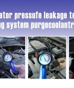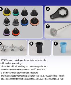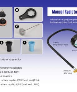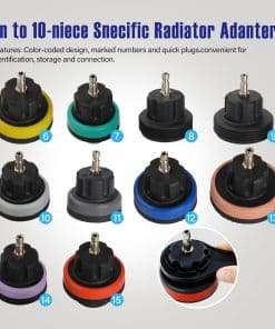 Kit de prueba de presión del radiador universal que incluye bomba de prueba de presión con manguera, adaptadores de prueba de tapón de radiador azul y negro, 20 tapones de prueba de colores codificados para facilitar su uso, kit de purga y relleno de sistema de refrigeración de tipo vacío, válvula de alivio, manómetro de vacío, adaptador universal, medidor de temperatura, manual de usuario y entrada de aire. Caja de herramientas resistente para un fácil almacenamiento y transporte.