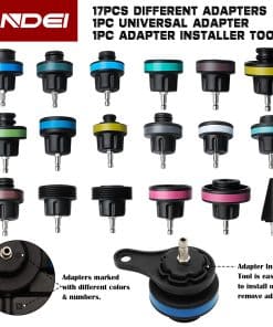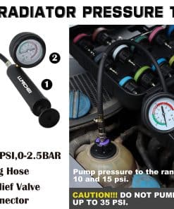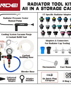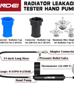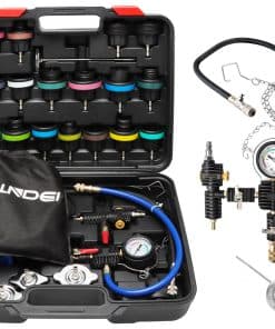 Kit de Prueba de Presión del Radiador y Vacío para Refrigerante LLNDEI 28PCS – Este kit completo de pruebas de fuga del sistema de enfriamiento de LLNDEI ofrece funciones de detección de fugas, medición de temperatura, llenado de líquido y más. El probador de presión del radiador facilita la resolución rápida y sencilla de cualquier problema relacionado con la presión del radiador, lo que hace que su trabajo sea más fácil y rápido.