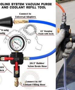 El kit incluye una variedad de herramientas, como la herramienta de purga de vacío neumático del sistema de enfriamiento con conectores rápidos de aire de América, probador de presión manual del radiador, termómetro, herramienta de mango para instalar y quitar adaptadores, mangueras claras, adaptadores de prueba de color para radiador, tapa de radiador de aluminio, adaptador cónico de goma, conectores azules y negros, anillos O de repuesto, conector de aire europeo, manual de usuario y estuche de transporte.