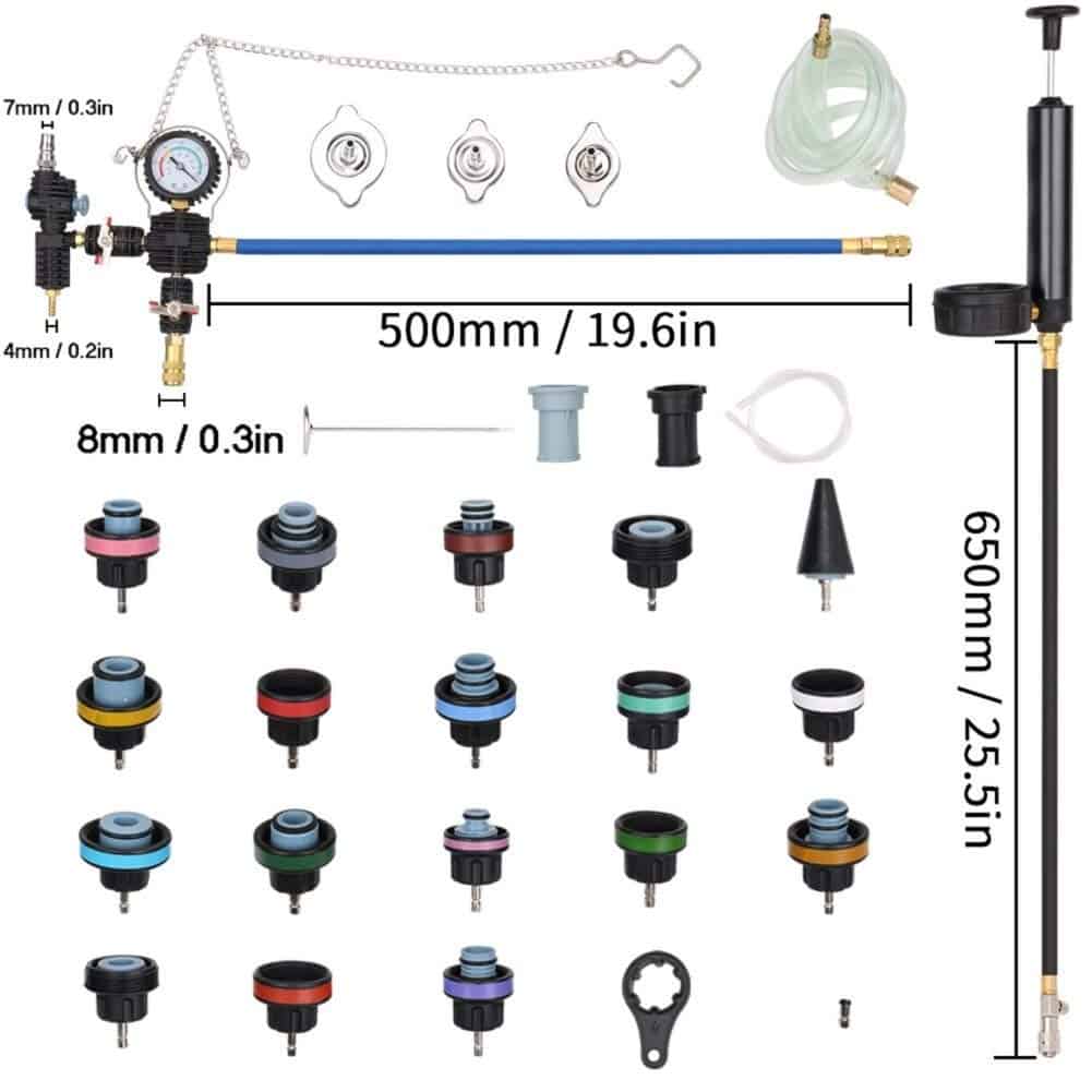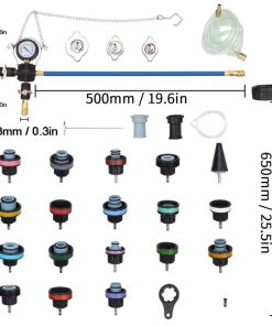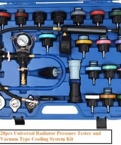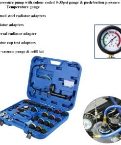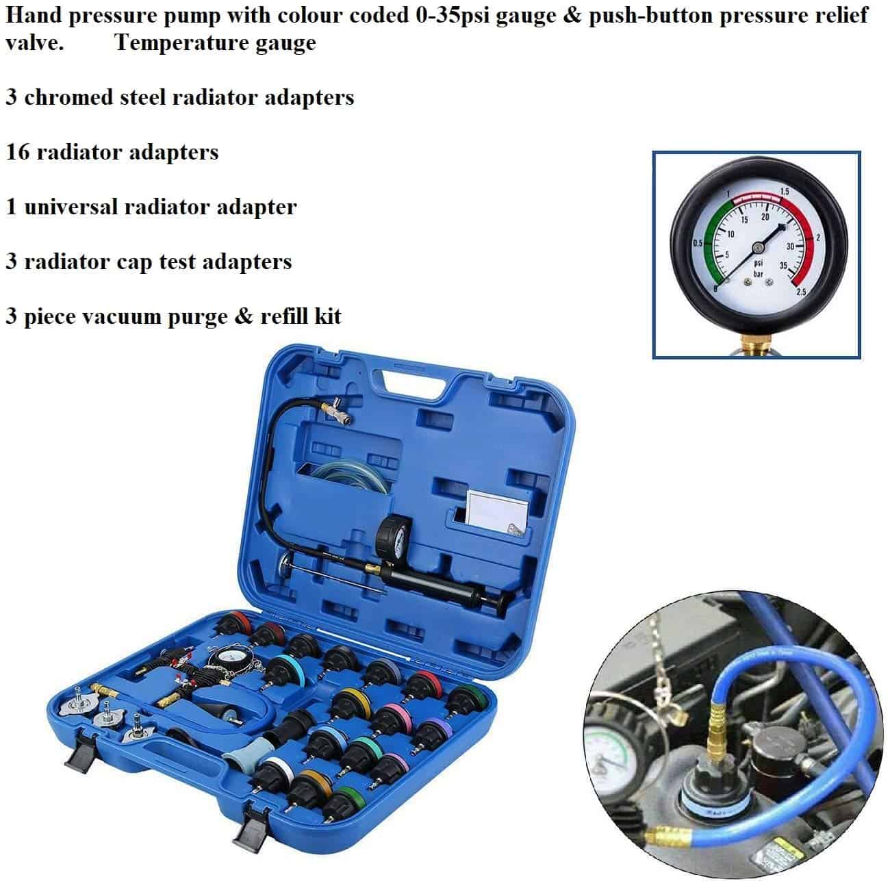 Kit incluye: Bomba de mano con manómetro codificado por colores de 0-35 psi y válvula de alivio de presión con botón; Termómetro; 3 adaptadores de radiador de acero cromado; 16 adaptadores de radiador; 1 adaptador de radiador universal; 3 adaptadores de prueba de tapa de radiador; 3 piezas de kit de purga y rellenado de vacío. Aplicación para cada herramienta: 1: Bomba de mano con manómetro 2: Unidad de llenado 3: Termómetro 4: Adaptador universal 5: Compatible con Mercedes Benz W123, W126, W124, W201, Buick, Chrysler, Chevrolet, Dodge, Jeep, Oldsmobile, Pontiac 6: Manguera de llenado 7: Compatible con Acura, Chevrolet, Chrysler, Dodge, Ford, GM, Honda, Hyundai, Infiniti, Isuzu, Kia, Lexus, Mazda, Mercury, Mitsubishi, Mercedes Benz, Nissan, Subaru, Suzuki, Peugeot 8: Compatible con Acura, Chevrolet, Dodge, Eagle, Honda, Lexus, Mercedes Benz, M-Klasse, Mitsubishi, Suzuki 9: Compatible con Cadillac, Daewoo, Ford, GM, Jaguar, Jeep, Land Rover, Mercedes Benz, Mercury, Pontiac, Porsche, Saab, Saturn 10: Compatible con Alfa Romeo, Citroën, Fiat, Mini Cooper, Peugeot, Renault, Saab, Sterling, Jeep, Volvo 11: Compatible con VW Vento, T4, Passat 1996, Golf Beatle, Sharan 12: Compatible …