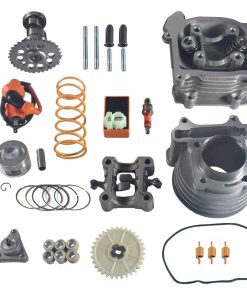 Kit de Reconstrucción de Cilindro de Gran Diámetro GY6 de 69 mm. Ajuste para scooters de 49cc 50cc de 4 tiempos como Agility 50, People S50 4T, Baotian BT49QT-2, Eton 49cc 50cc 4 tiempos, Roketa 49cc 50cc y muchos más. Características como el proceso reticulado que brinda un buen sellado, aumenta la superficie de contacto, el almacenamiento de aceite y la función de lubricación, y reduce el desgaste y el consumo de combustible. Fácil de instalar y duradero. Incluye varios componentes como cilindro, cabeza del cilindro, levas, kits de piñones, juntas, bomba de aceite, resortes, juegos de rodillos de cobre, CDI de Encendido de Carreras de 6 pines, bobina de encendido y bujía de encendido de carreras de 3 electrodos.