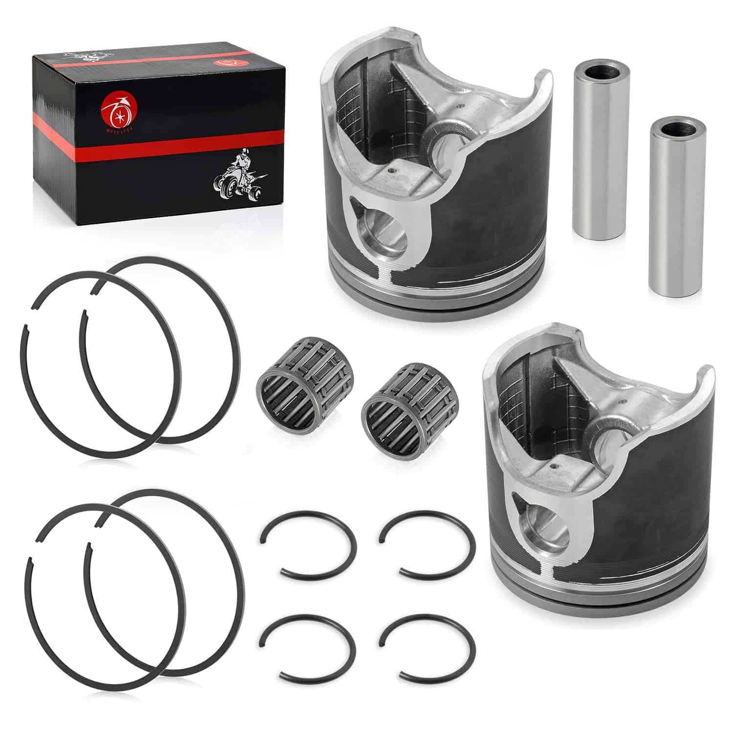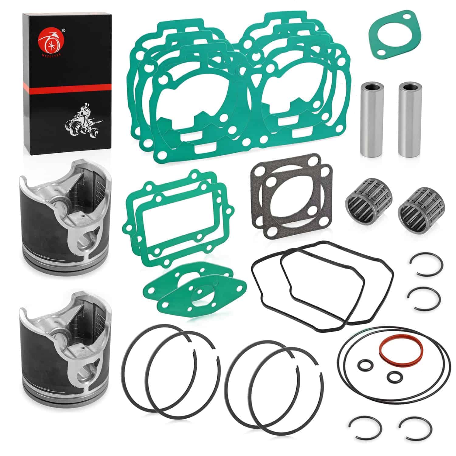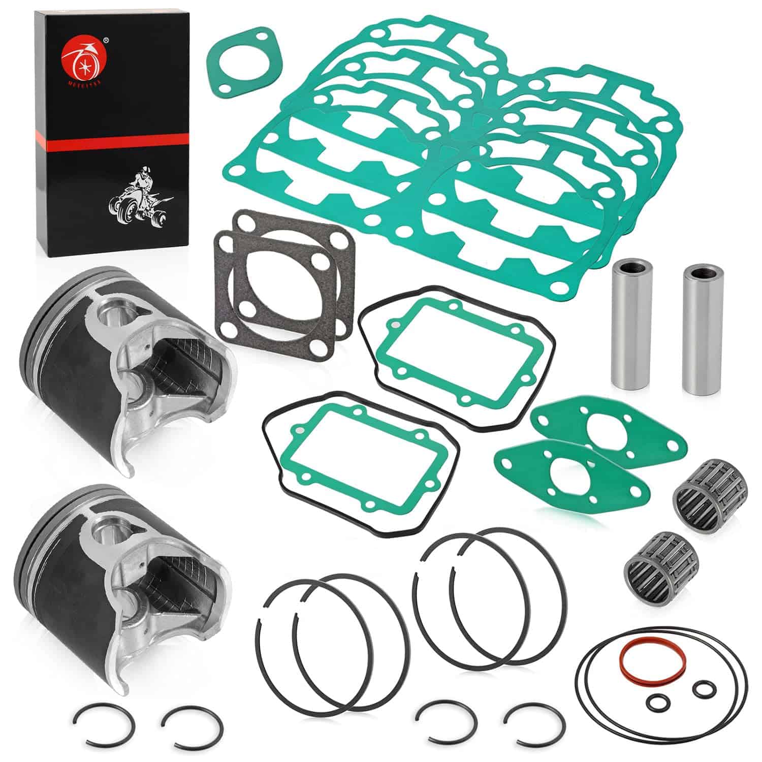 Paquete: 2x DUAL Ring, 2x Pistons, 2x Pin Bearings, 2x Pins, 4x Circlips, 2x O-rings, 2x Rubber Ring, 4x Gasket