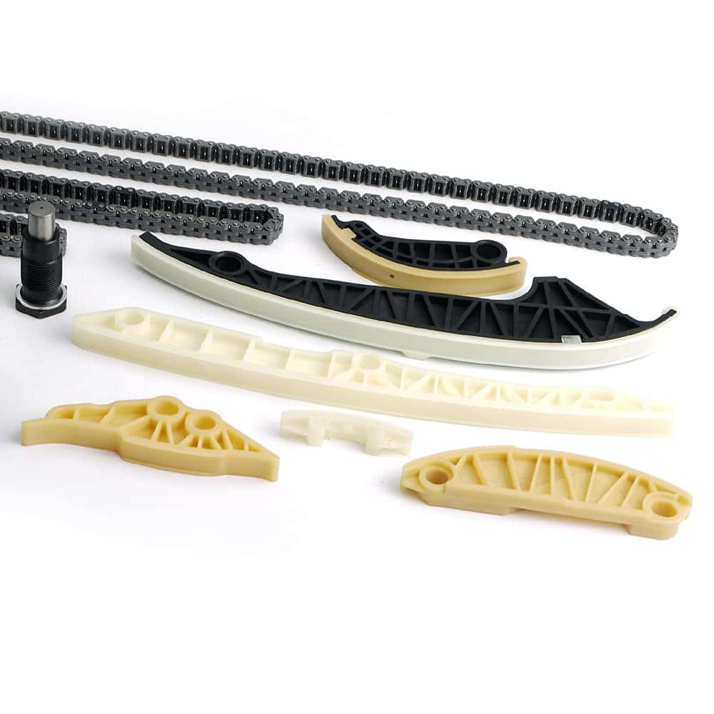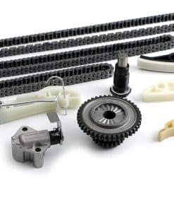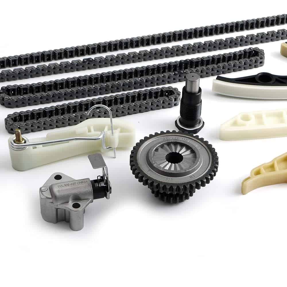 Componentes del kit de cadena de distribución: tensor, cadenas largas y cortas, engranaje, juego de guías, cadena de bomba de aceite y tensor.