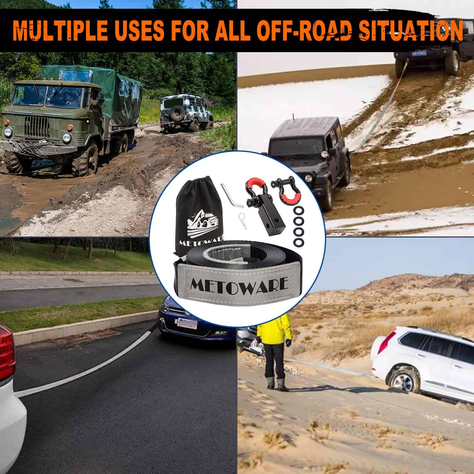 4. APLICACIONES VERSÁTILES – Con resistencia y calidad superior, el kit de recuperación de correa de remolque funciona bien con camionetas de tamaño completo, ATV, SUV, UTV e incluso botes! Es una cuerda de recuperación ideal para remolcar camiones grandes, tirar equipo pesado y una herramienta esencial para todoterrenos, personal de emergencia, granjeros o cualquier persona que necesite transportar objetos pesados.