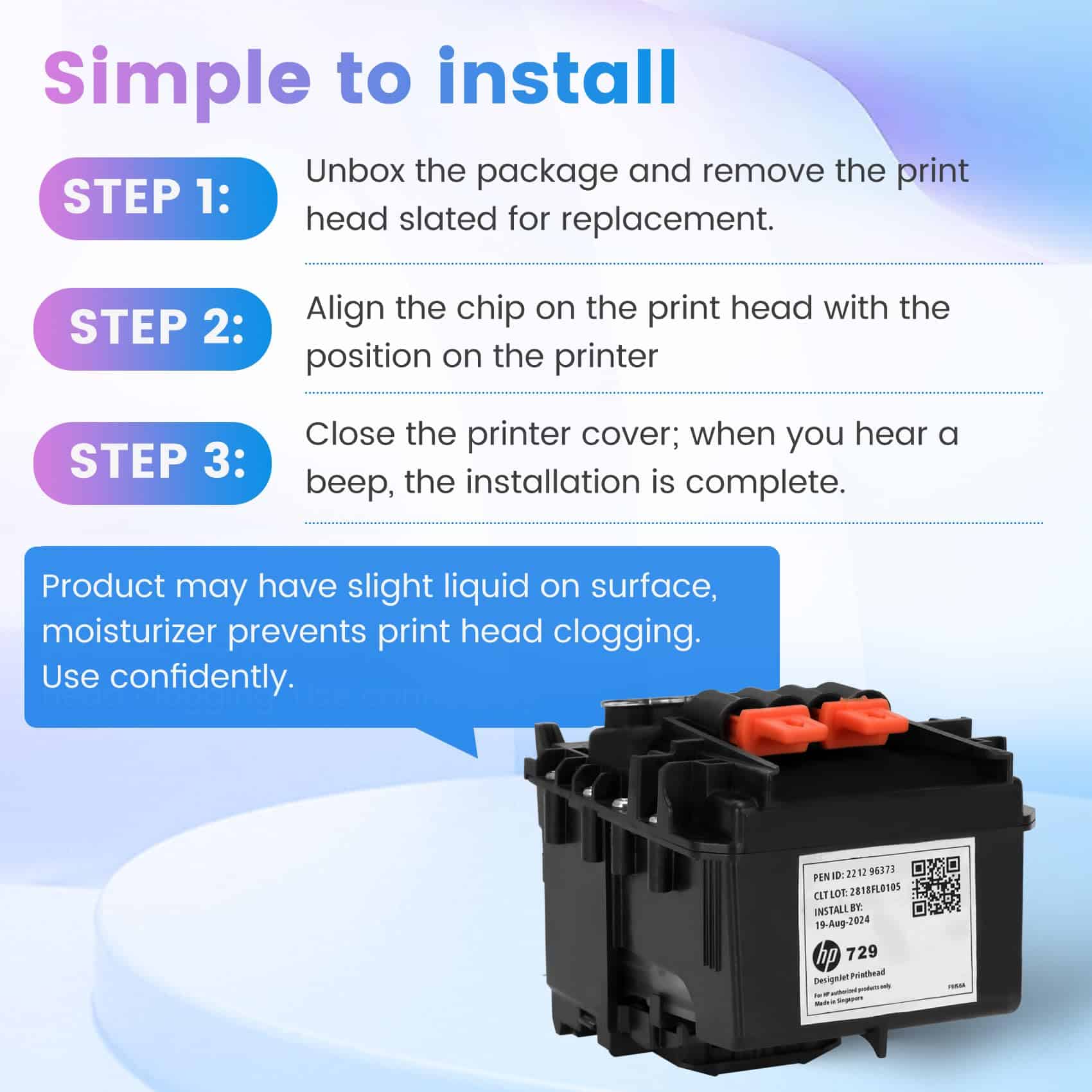 5. Consejos de uso Este cabezal de impresión 729 adopta una estructura integrada sin costuras para una instalación fácil y un bajo mantenimiento. Evite el contacto directo con los contactos metálicos del chip durante el manejo. Si se producen errores de compatibilidad, retire el cabezal de impresión, limpie suavemente los contactos del chip con una goma de borrar de dibujo para eliminar la oxidación, y vuelva a instalarlo para una operación normal.