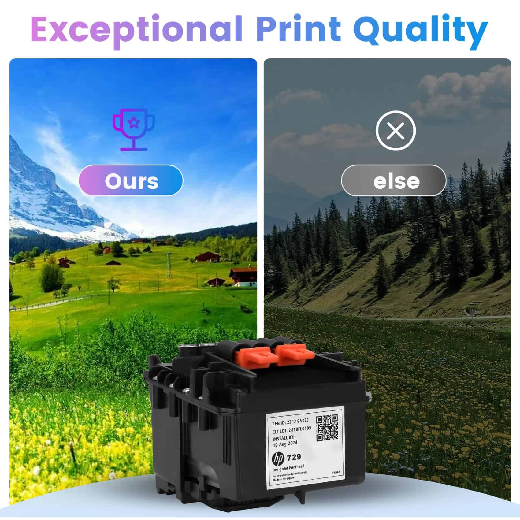 4. Resultados de impresión excepcionales El cabezal de impresión 729 es reconocido al instante por su impresora y ofrece un rendimiento impecable. Amplía la cobertura del espectro de color de las fotos al 98% de sRGB, produciendo documentos de oficina excepcionalmente claros y vibrantes, fotos de viajes y textos con líneas continuas. Probado en laboratorio durante 2,000 horas de impresión continua, el cabezal de impresión muestra una tasa de desgaste un 42% menor que los puntos de referencia de la industria.