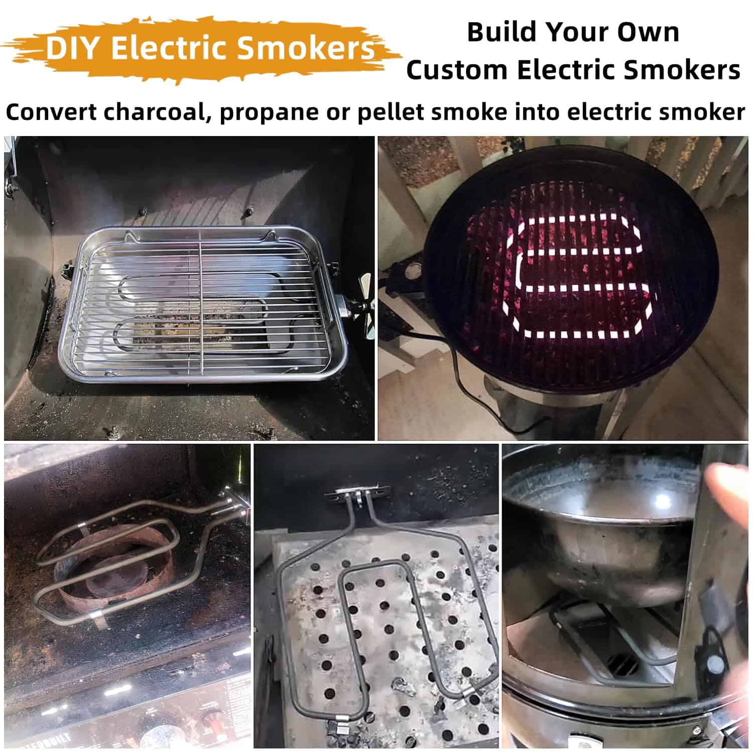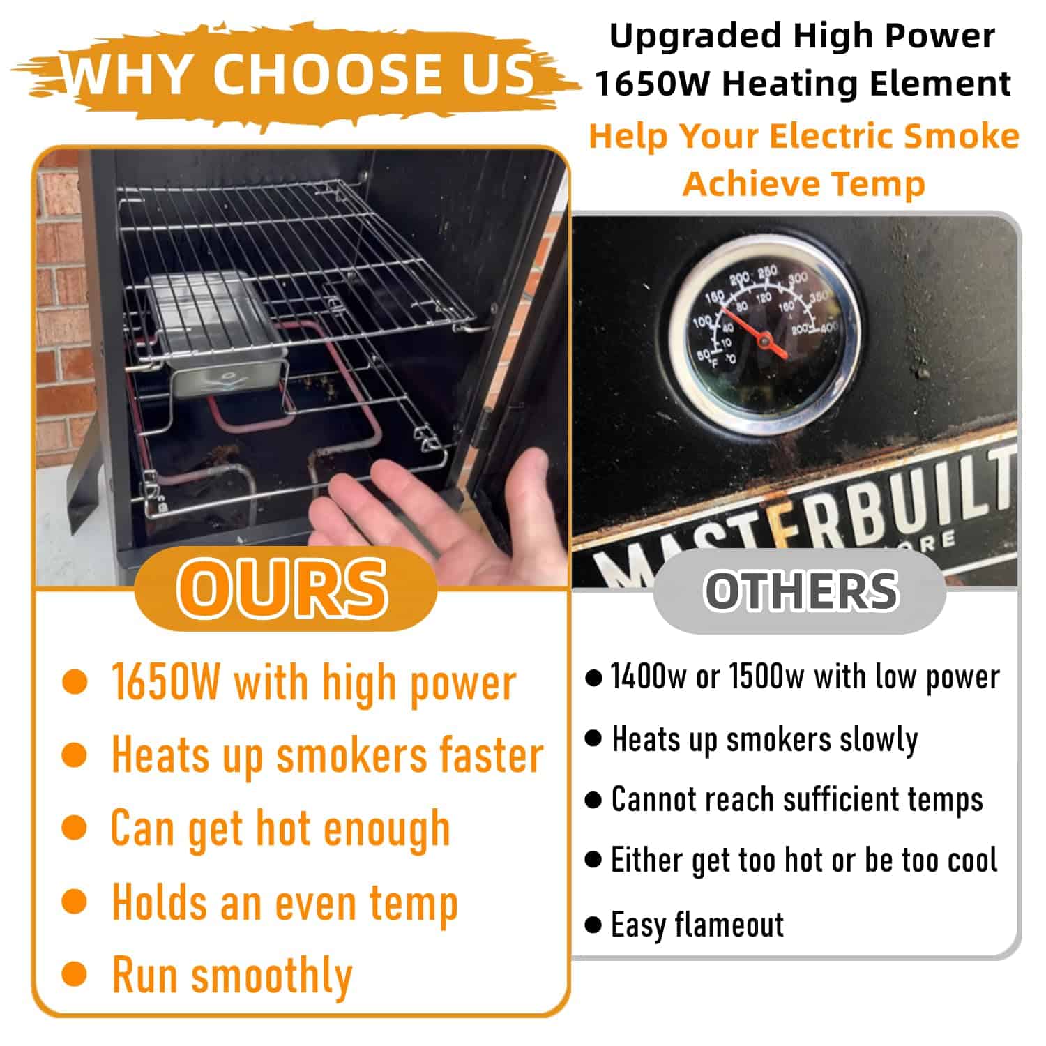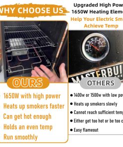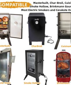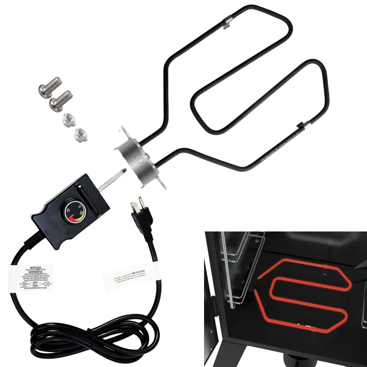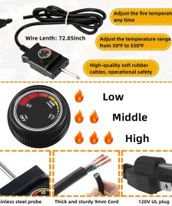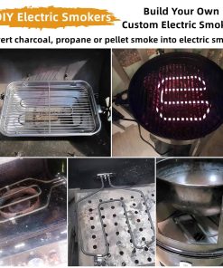 Kit de reemplazo de elemento calefactor de 1650W para ahumador eléctrico. Perfecto para aquellos ahumadores eléctricos que luchan por alcanzar la temperatura deseada. Este kit calienta su ahumador más rápido y mantiene temperaturas más altas que la unidad original. La sonda de acero inoxidable tiene un diámetro de 1.8″ y el control de temperatura de 300W 120V tiene una perilla marcada con baja, media y alta temperatura. El cable es de calibre 14 AWG. Fácil de instalar en solo 5 minutos. Viene con patitas para colocar firmemente en su lugar.