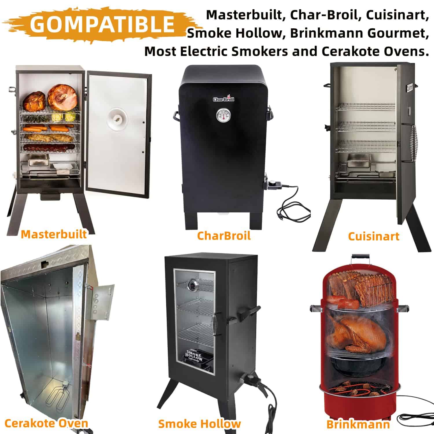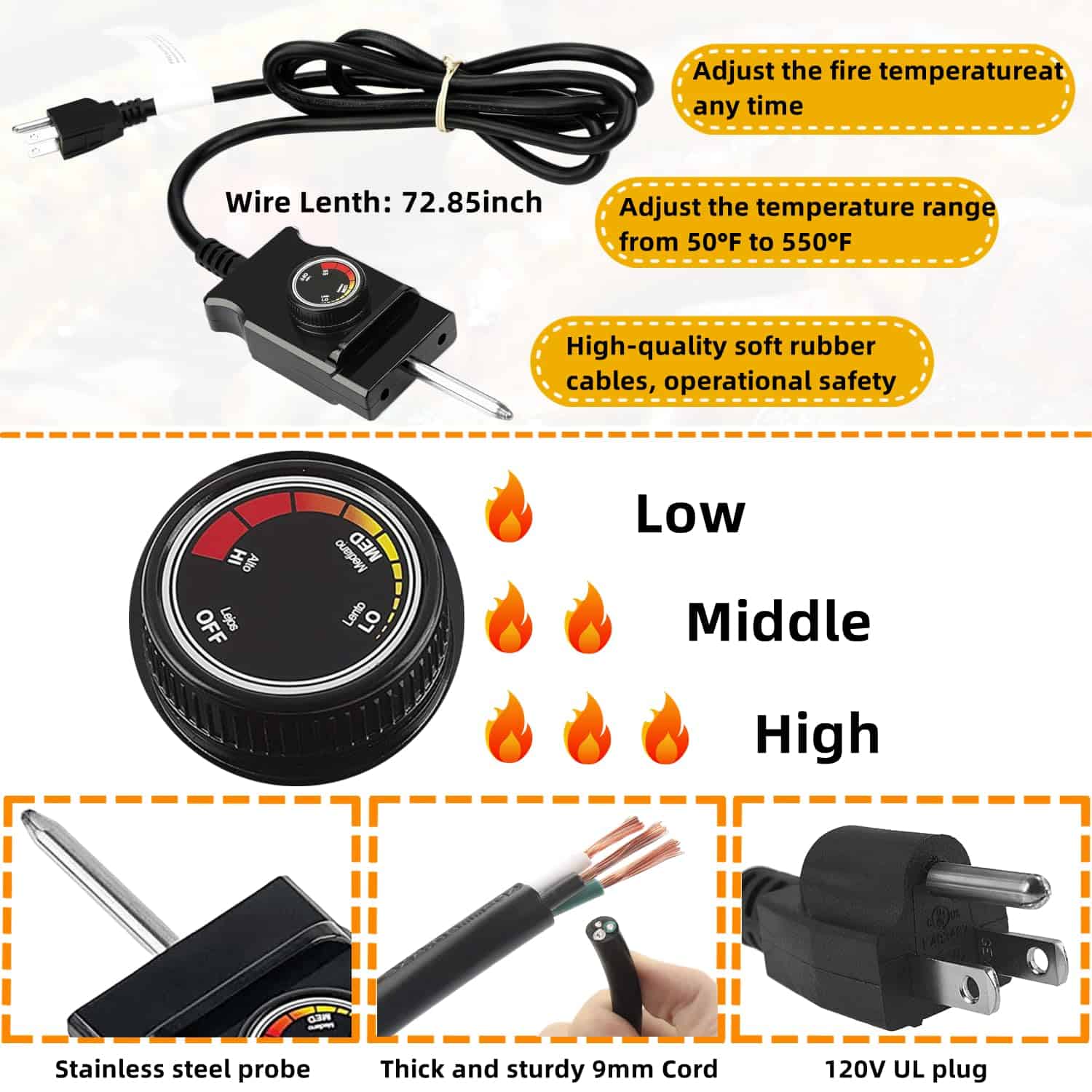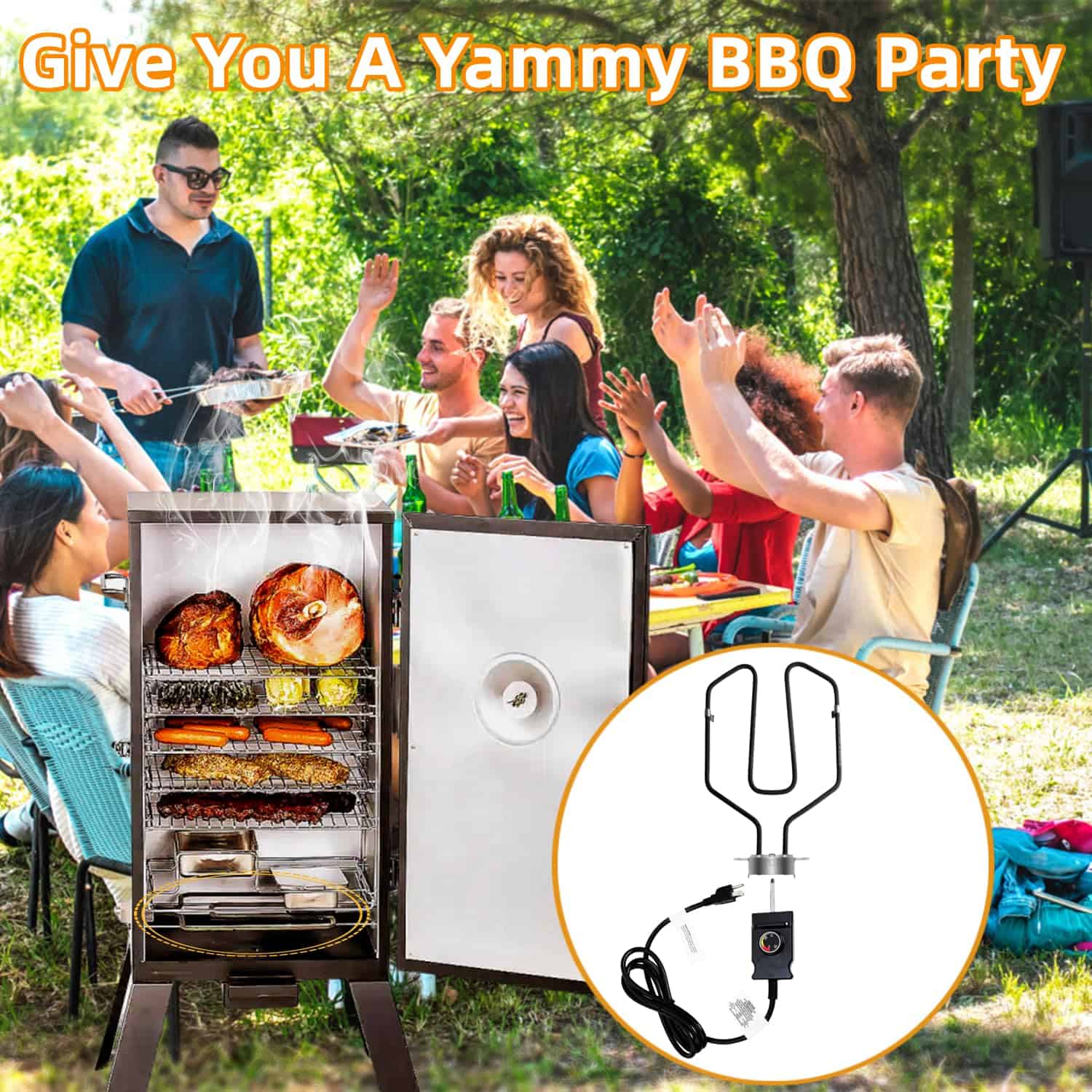 Kit de reemplazo de elemento calefactor de 1650W para ahumador eléctrico. Perfecto para aquellos ahumadores eléctricos que luchan por alcanzar la temperatura deseada. Este kit calienta su ahumador más rápido y mantiene temperaturas más altas que la unidad original. La sonda de acero inoxidable tiene un diámetro de 1.8″ y el control de temperatura de 300W 120V tiene una perilla marcada con baja, media y alta temperatura. El cable es de calibre 14 AWG. Fácil de instalar en solo 5 minutos. Viene con patitas para colocar firmemente en su lugar.