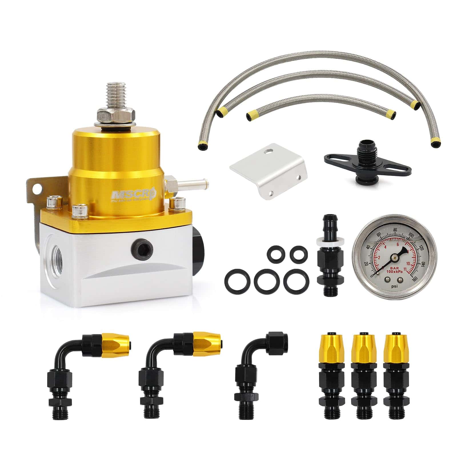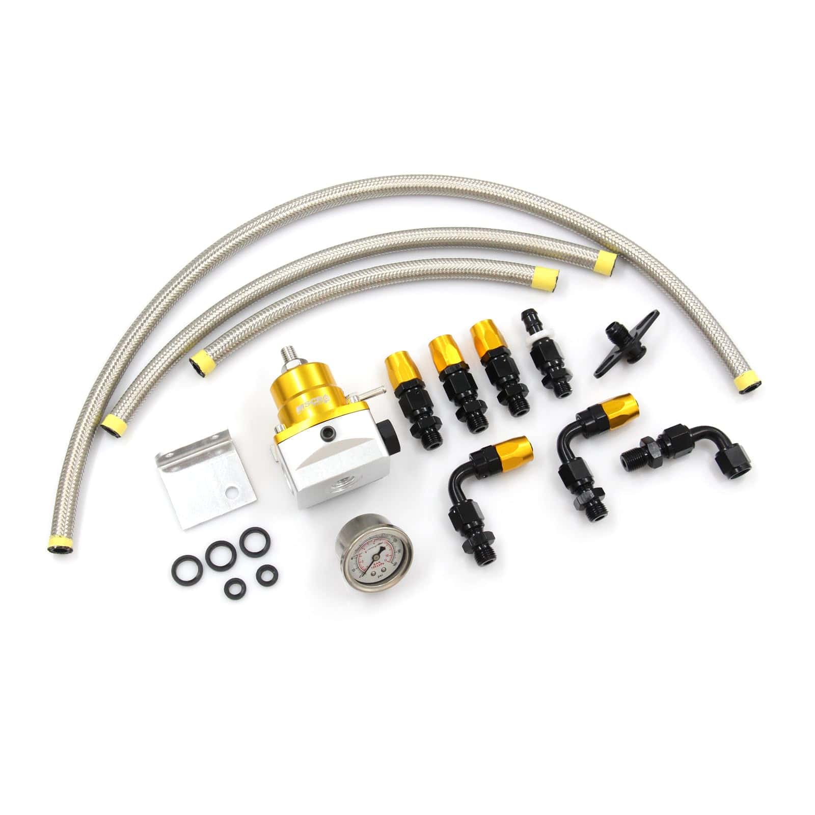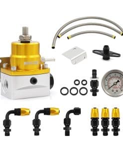 Kit de Regulador de Presión de Combustible EFI Ajustable Universal con Manómetro de Presión de Combustible de 0-160psi y Conectores de Manguera de Línea de Combustible AN6-6AN (DORADO). Este kit de regulador de presión de combustible EFI ajustable universal incluye un manómetro de presión de combustible de 0-160psi y conectores de manguera de línea de combustible AN6-6AN. Es compatible con la mayoría de los sistemas EFI de automóviles y está fabricado en aleación de aluminio de alta calidad para proporcionar un rendimiento, confiabilidad y una larga vida útil superiores. Capaz de admitir aplicaciones de hasta 1000 HP, este regulador de presión de combustible EFI es ideal para vehículos de alto rendimiento. Nota: Se recomienda encarecidamente la instalación profesional sin instrucciones incluidas.