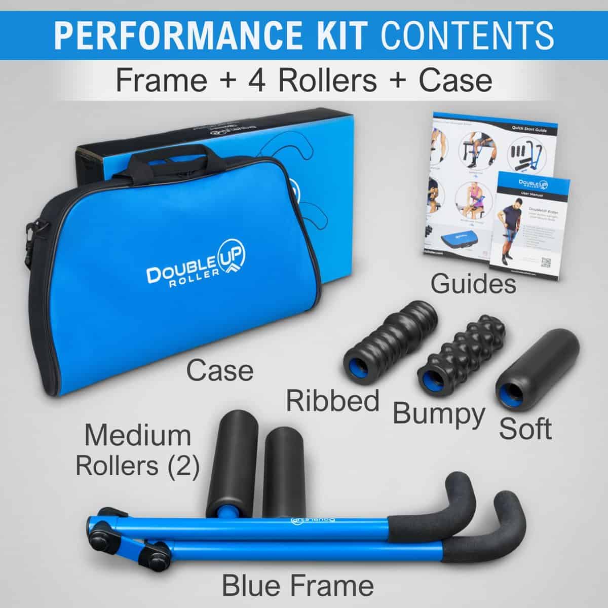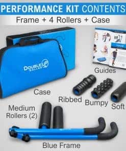 1. ¿QUÉ SE INCLUYE? El Kit de Rendimiento incluye nuestro marco de metal patentado DoubleUP, 5 rodillos de cambio rápido (2 Medios, 1 Suave, 1 Estriado/Firme, 1 Rugoso/Firme) más un estuche premium de viaje y almacenamiento.