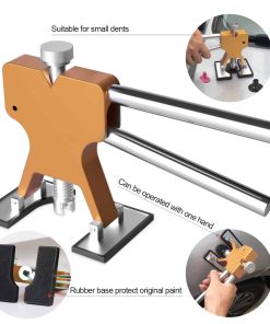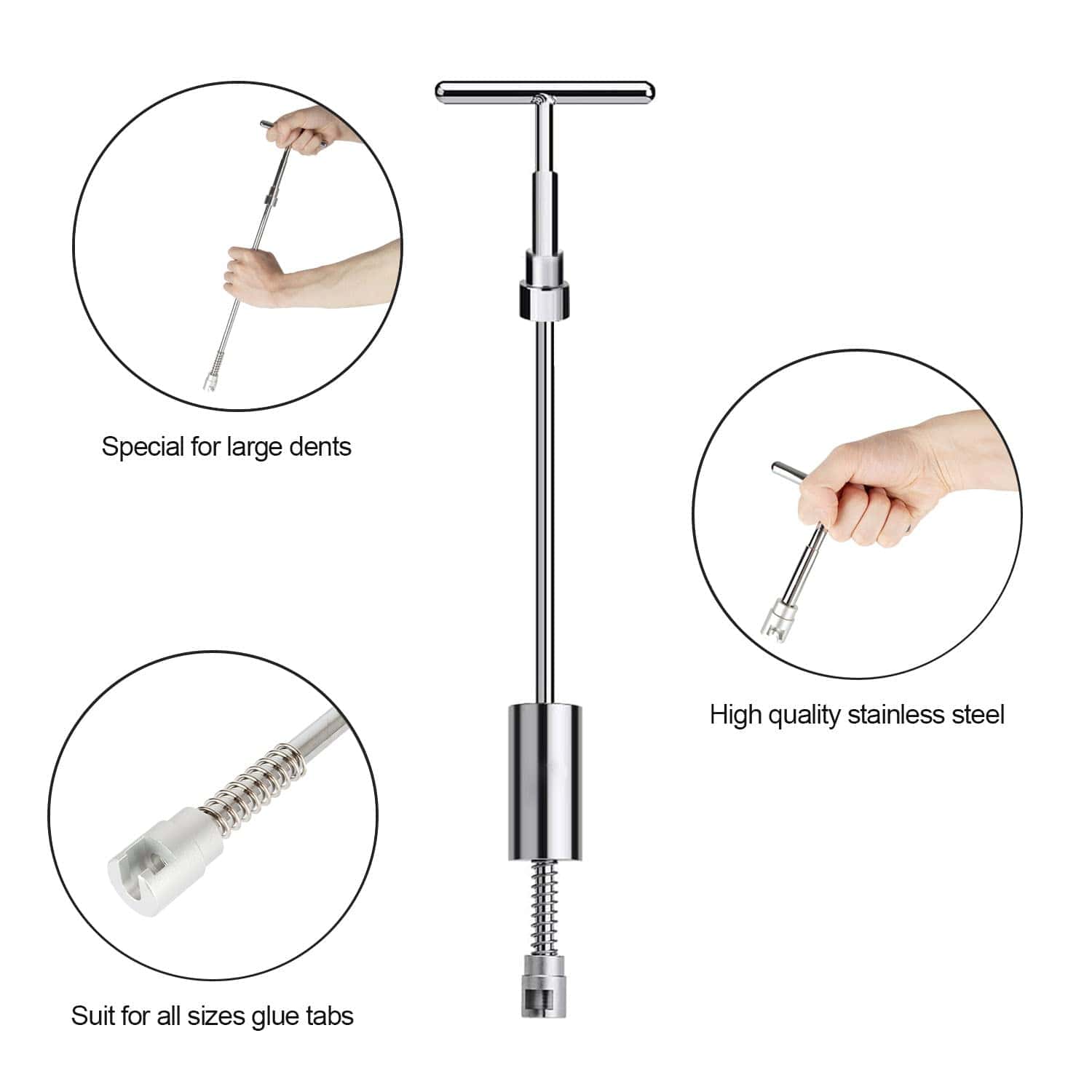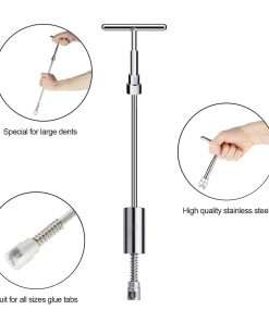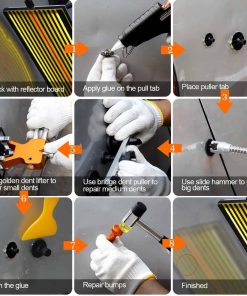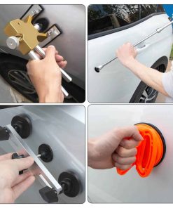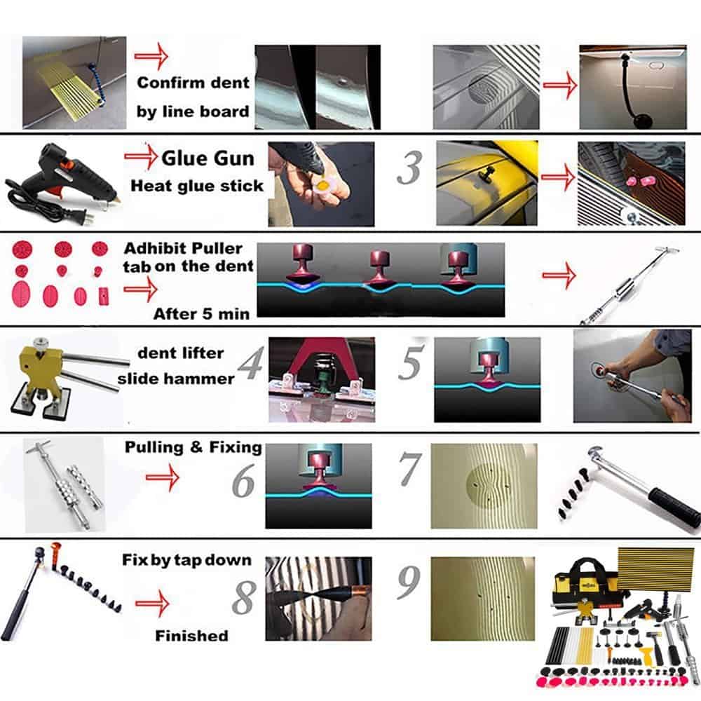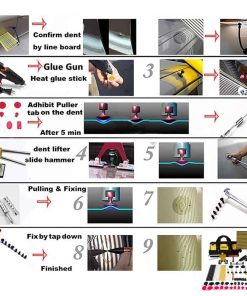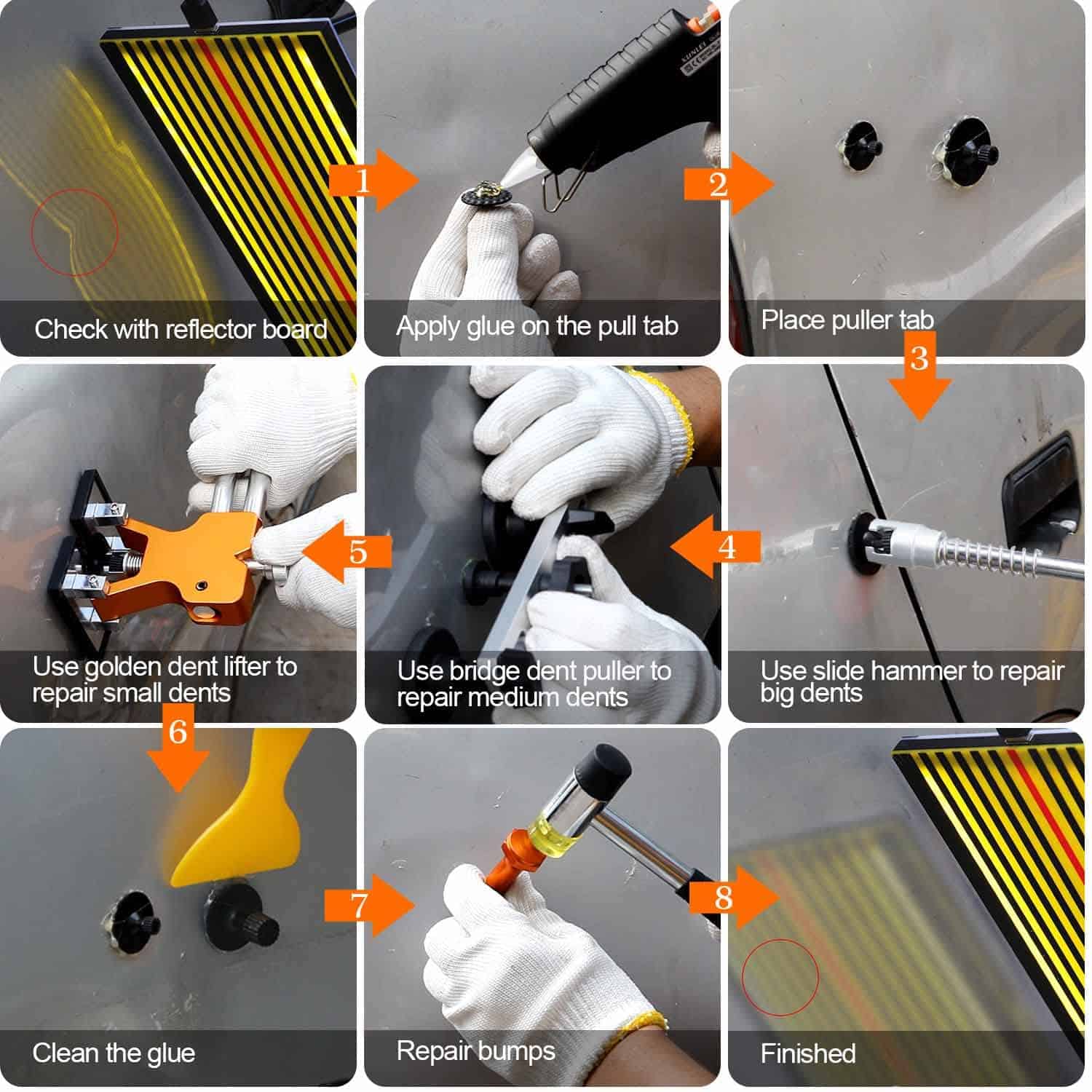 ¡Desata tu estilo libre! Las herramientas de reparación de abolladuras de carrocerías de coche de Mookis ¿Tu coche tiene muchas abolladuras debido al daño causado por granizo o carritos de compras? ¿Estás molesto con estas feas abolladuras en tu coche? ¿Sigues negándote a arreglarlas por ti mismo incluso cuando te ayudará a ahorrar mucho dinero? Las herramientas de reparación de abolladuras de Mookis están diseñadas para eliminar abolladuras y golpes de coche. Muchos talleres de carrocería utilizan estas herramientas también, pero te cobrarán veces el precio de este kit. Si intentas hacerlo por ti mismo, no solo puedes ahorrar mucho dinero, sino que también adquirirás habilidades de eliminación de abolladuras después de prácticar. Así que no dudes en hacerlo ahora cuando el precio es tan asequible. Lista de empaque 1 x Instrucciones (con gráfico de operaciones) 1 x Pistola de Pegamento (con interruptor) 1 x Elevador de Abolladuras Dorado 1 x Extractor de Puente Pops-a-dent (con 5 ventosas reemplazables) 1 x Tablero de Línea LED (flexible) 1 x Martillo Deslizante (desmontable) 1 x Ventosa T-Bar Roja 1 x Martillo de Goma 1 x Pestaña abatible (con 2 lados) 1 x Martillo rojo (con 5 cabezas reemplazables) 1 x Raspador de plástico amarillo 1 x Botella de Alcohol (vacía) 5 x Barras de Pegamento Blanco (máxima viscosidad, para abolladuras más grandes) 5 x Barras de Pegamento Amarillo (para abolladuras de 1.5 cm-10 cm) 5 x Barras de Pegamento Negro (para abolladuras de 1.5 cm-5 cm) 28 x Pestañas de Pegamento Profesionales (diferentes tamaños)