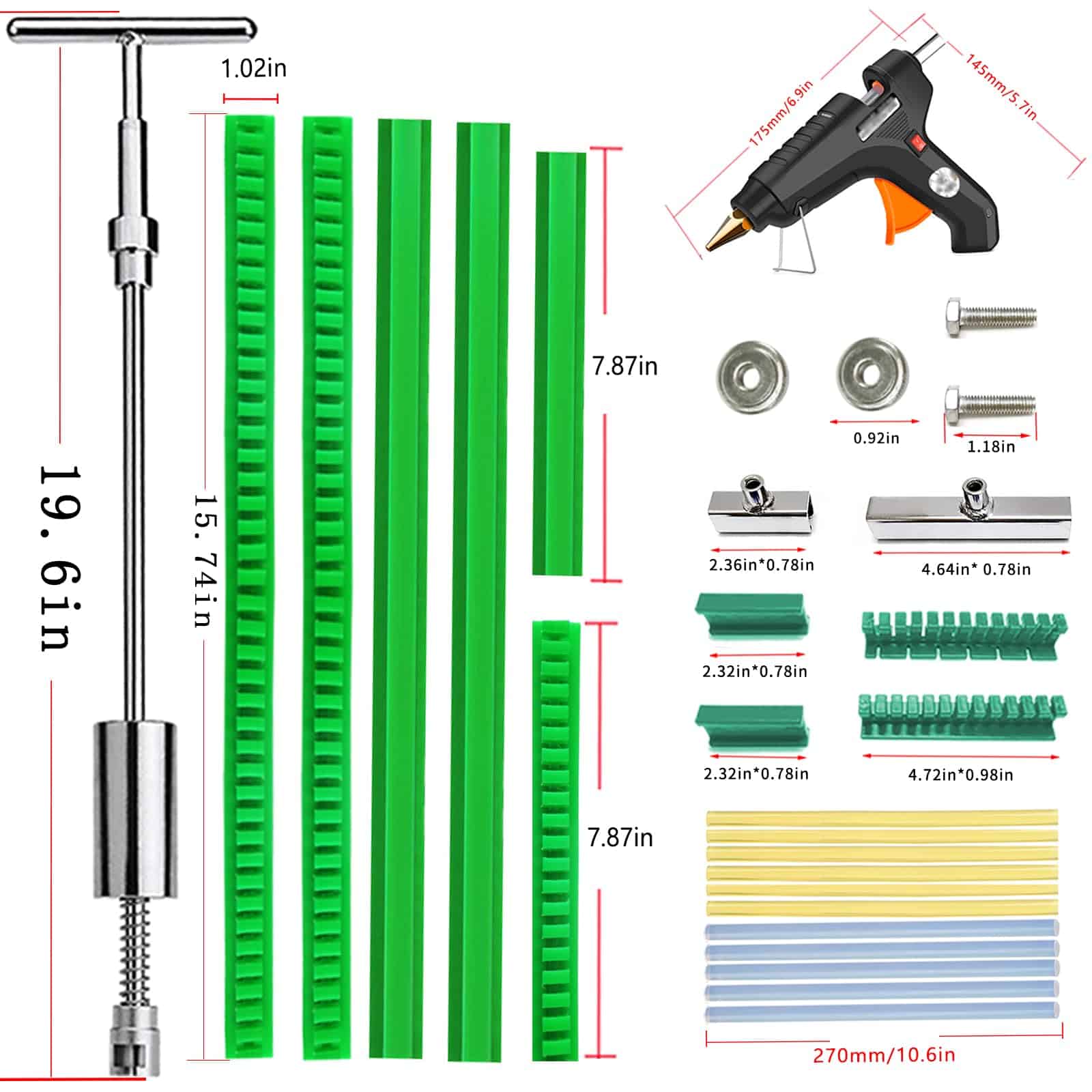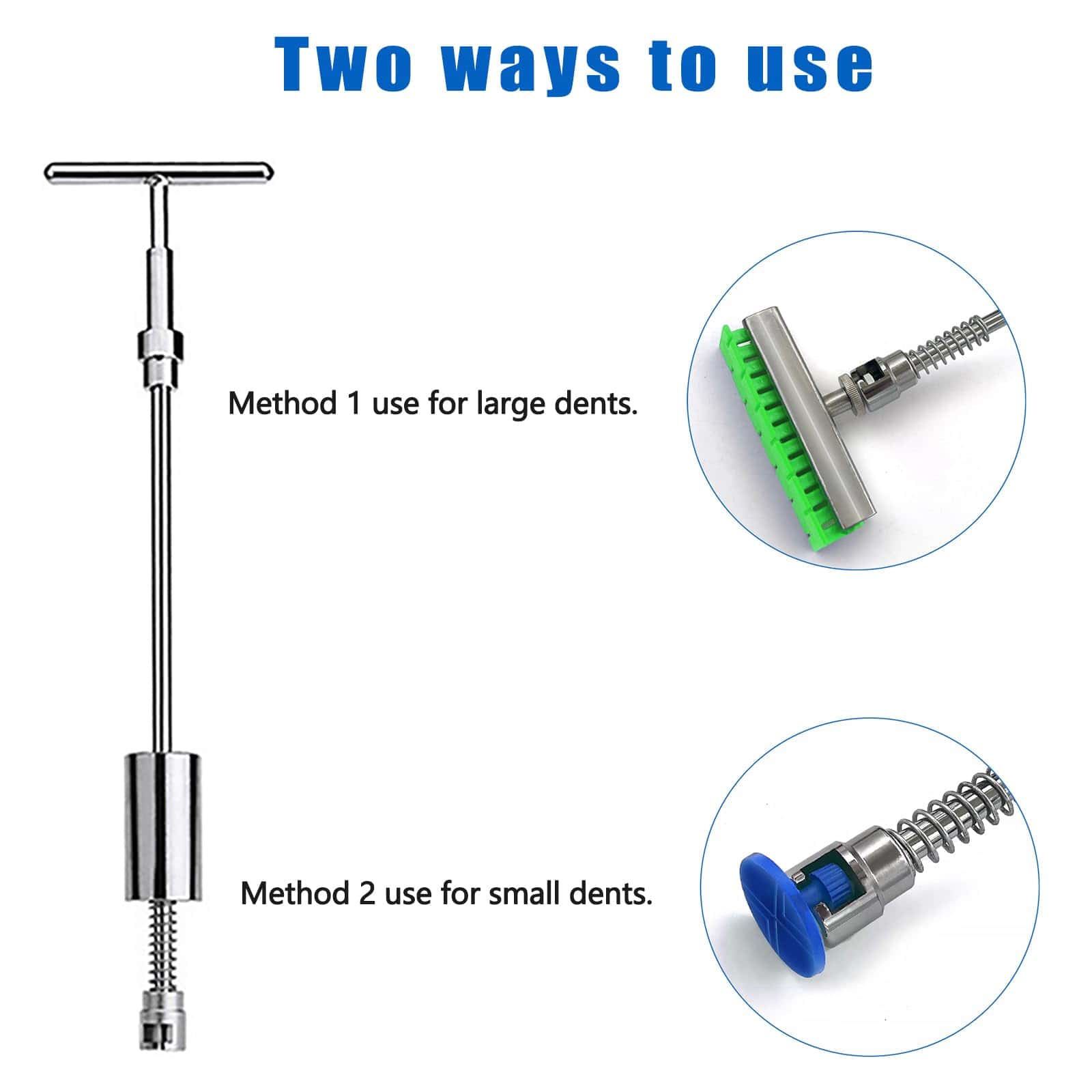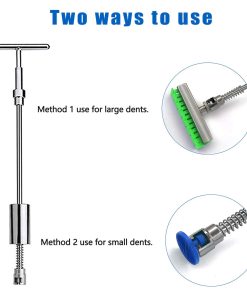 ¿Buscas una solución económica y efectiva para reparar las abolladuras del carro sin la molestia de visitar un taller de carrocería? ¡Nuestro Kit de Reparación de Abolladuras sin Pintura es tu opción ideal! Diseñado para principiantes y profesionales, este kit integral presenta un Martillo T-Bar para Extracción de Abolladuras y accesorios esenciales, facilitando la restauración de la superficie de tu carro suave y sin abolladuras.