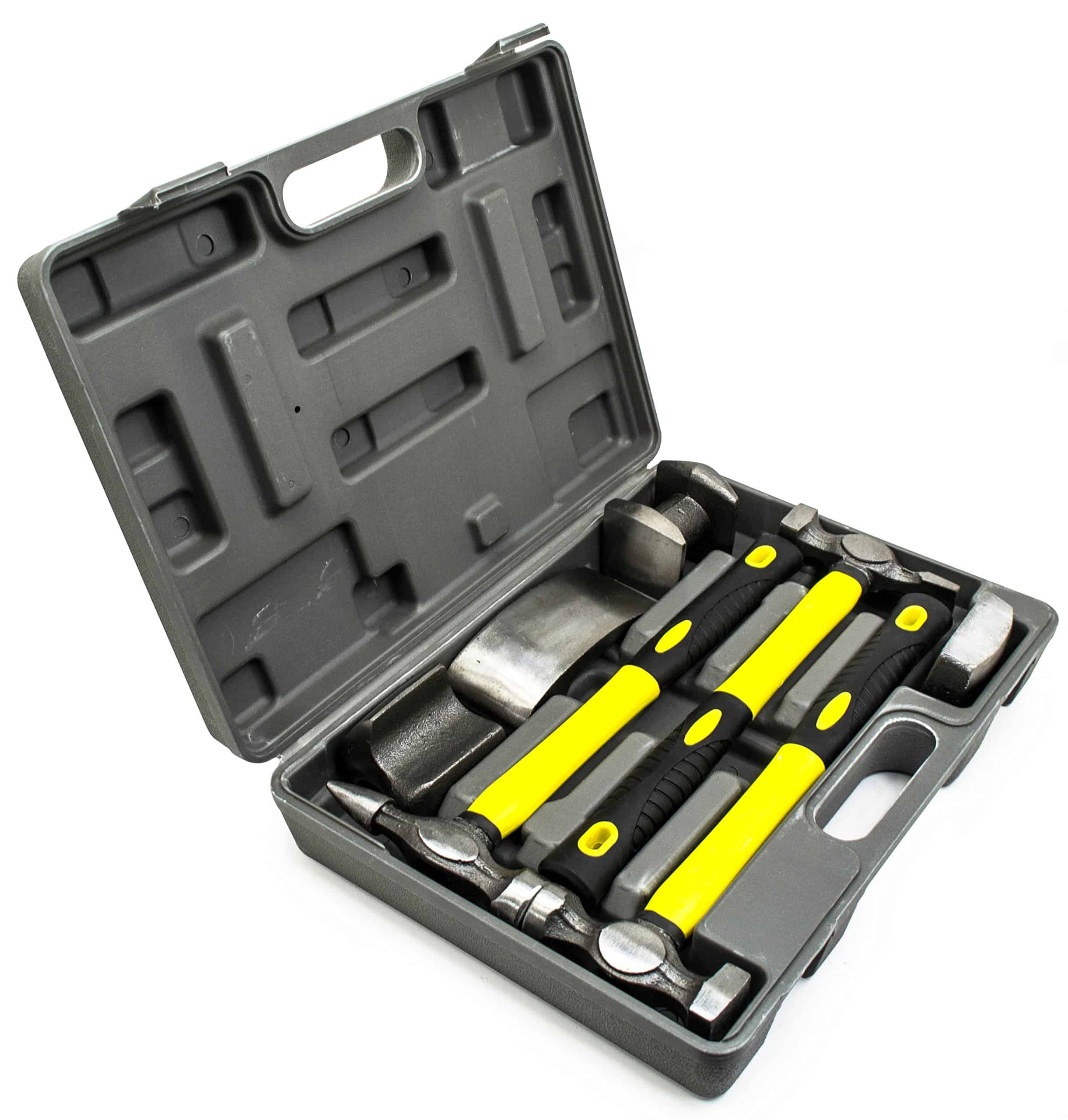 Kit de Herramientas de Mano de Alta Calidad de Bastex Incluye: Pick Hammer: Esta herramienta liviana está diseñada para quitar pequeños abollones en áreas de aletas altas evitando la necesidad de quitar paneles. Cross Chisel Hammer: Este martillo está ranurado en cruz con una cara extra ancha. Este martillo se utiliza para el encogimiento en proyectos de áreas grandes. El extremo del cincel es ideal en esquinas afiladas difíciles de alcanzar. Shrinking Body Hammer: También conocido como el martillo vertical de cara redonda utilizado para encogimiento tiene ranuras maquinadas en la cara redonda para proporcionar precisión y equilibrio durante el golpe. Heel Dolly Block: Hace posible llegar fácilmente a esquinas afiladas y áreas de radio ancho como una reparación de barco. General Purpose Dolly: Esta herramienta es un bloque de acero pesado en forma sostenido detrás del panel con varias curvaturas superficiales diferentes. Se usa para cambiar la velocidad a la que se moverá el metal. Double Ended Dolly: Dolly de acero de alto carbono duro donde un lado es una superficie circular plana y borde cuadrado, mientras que el otro lado es una corona baja con una superficie coronada más alta alrededor del borde. Wedge Dolly: Dolly en forma de coma que permite la capacidad de trabajar entre paneles colocados cerca, como los que se encuentran en autos. Esta herramienta funciona particularmente bien con archivos de golpes (NO INCLUIDOS) Estuche resistente a impactos: Viene con un estuche de transporte resistente a impactos y a la intemperie de alta calidad diseñado con recortes específicamente moldeados para sostener sus herramientas de forma segura en su lugar. Perfecto para el lugar de trabajo o solo almacenamiento simple en el que puede confiar. Garantía de Satisfacción