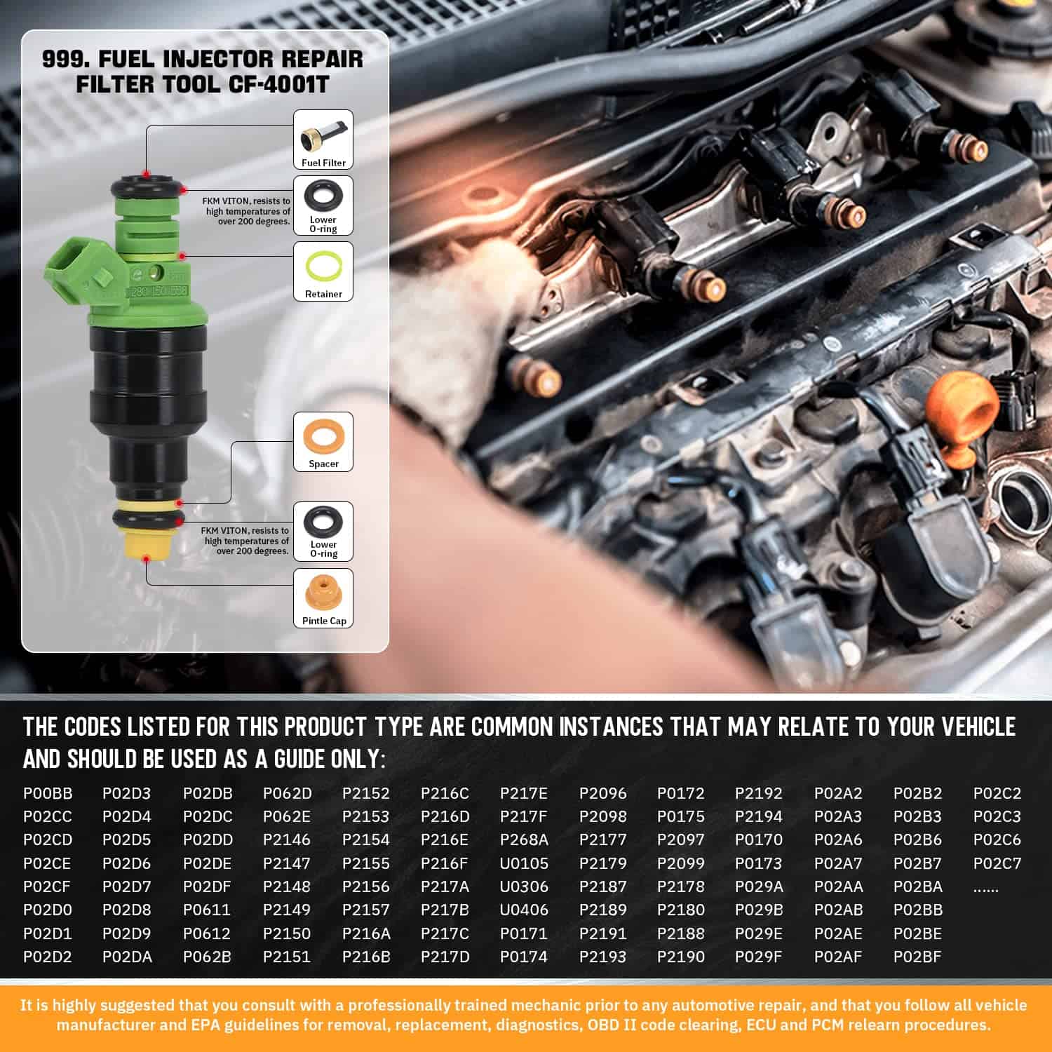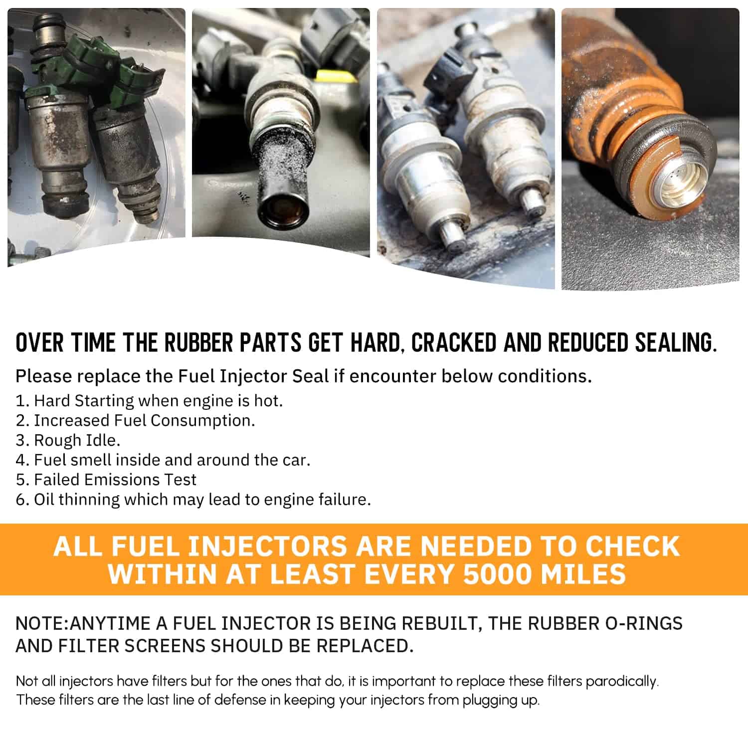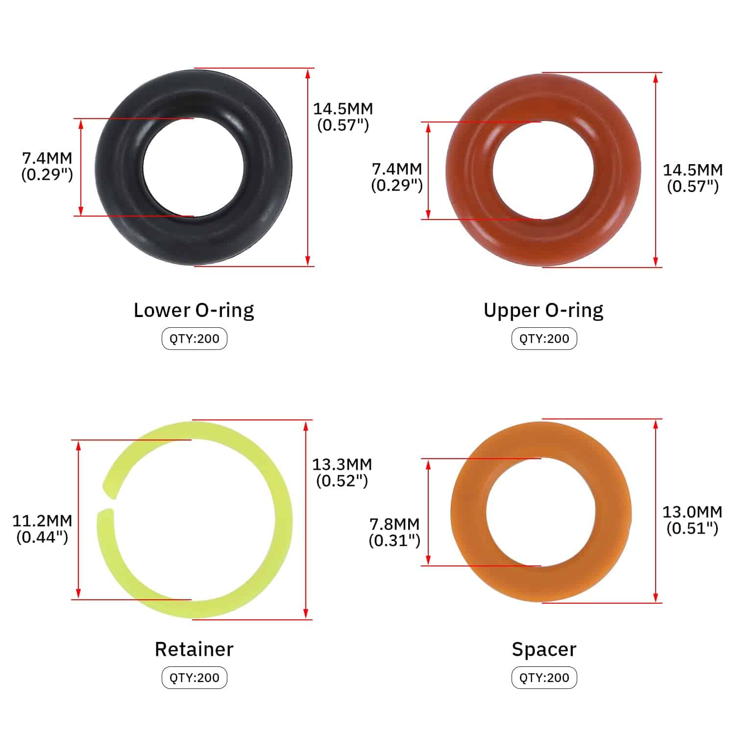 Este kit contiene una herramienta de extracción y 6 tipos de piezas universales de repuesto (filtros, anillos en O, sellos/espaciadores, tapas de pincel) que se aplican a la mayoría de los inyectores comúnmente utilizados.