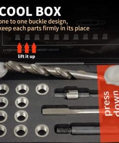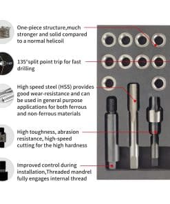 M12X1.5X9.2MM Kit de Reparación de Rosca con Broca, Macho, Escariador, Adaptador de Instalación y 10 Insertos de Acero Inoxidable M12X1.5X9.2MM. Este kit de reparación de rosca profesional es ideal para reparar o reemplazar roscas internas dañadas o desgastadas. Incluye una broca, un escariador, un macho, un adaptador de instalación y 10 insertos de acero inoxidable duraderos de M12X1.5X9.2MM. Los insertos de acero sólido son más fuertes y duraderos que los helicoils, proporcionando una rosca interna más resistente. El escariador de diseño especial ayuda a cortar un labio empotrado que toma el reborde de los insertos, mejorando la calidad y la precisión del trabajo. El kit viene en un estuche personalizado de EVA que ofrece un almacenamiento seguro y organizado, así como una portabilidad fácil. Adecuado para una amplia gama de usos, este kit es especialmente recomendado para reparaciones de motores y diversas aplicaciones automotrices.