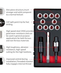 Este kit de reparación de roscas SAE 7/16-14 de SENNMONN es una herramienta profesional de calidad ideal para reparar o reemplazar roscas internas dañadas o desgastadas. El kit incluye una broca, un escariador, un macho de roscar, un soporte de instalación y 10 insertos de acero inoxidable de 7/16-14X0.600 pulgadas, todos dentro de una caja de EVA personalizada para un almacenamiento seguro y organizado. Los insertos de acero inoxidable duraderos crean una rosca interna más fuerte y duradera que el helicoil, brindando una restauración de precisión. El escariador de diseño especial corta un labio empotrado que toma el reborde de los insertos, mejorando notablemente el trabajo. Este kit es perfecto para una amplia gama de aplicaciones, especialmente para reparaciones de motores y otras aplicaciones automotrices. ¡Hazte con este kit de reparación de roscas SAE 7/16-14 y realiza tus proyectos con profesionalismo y calidad!