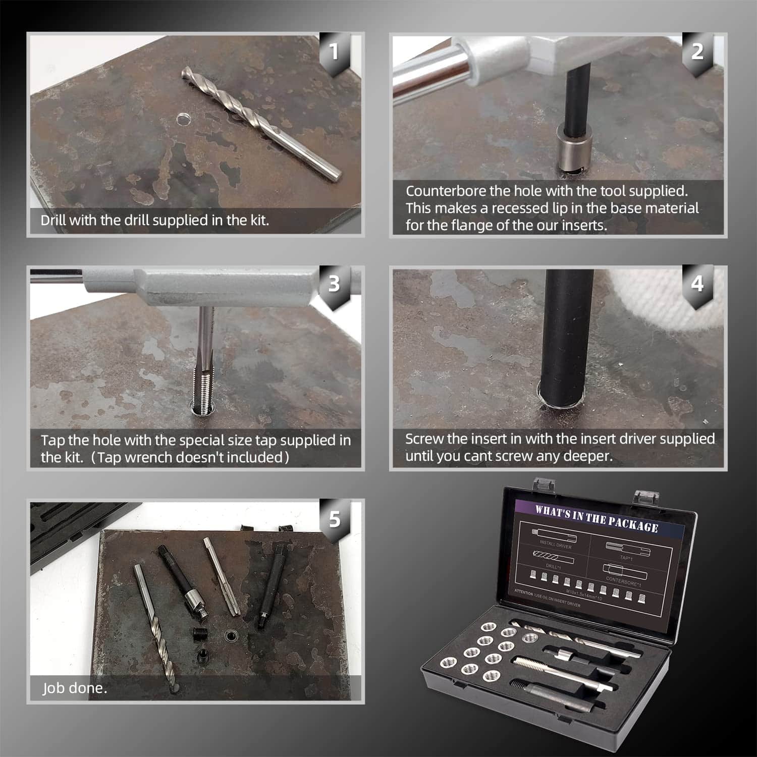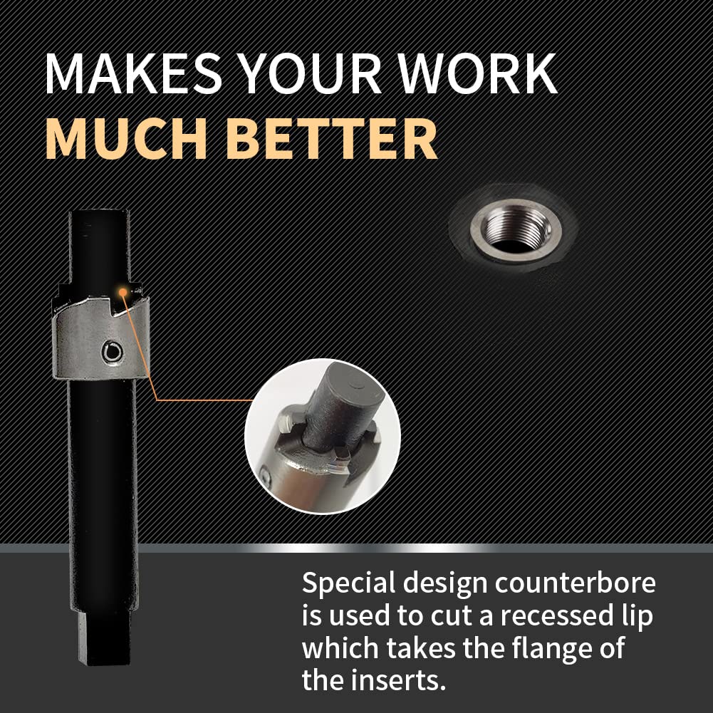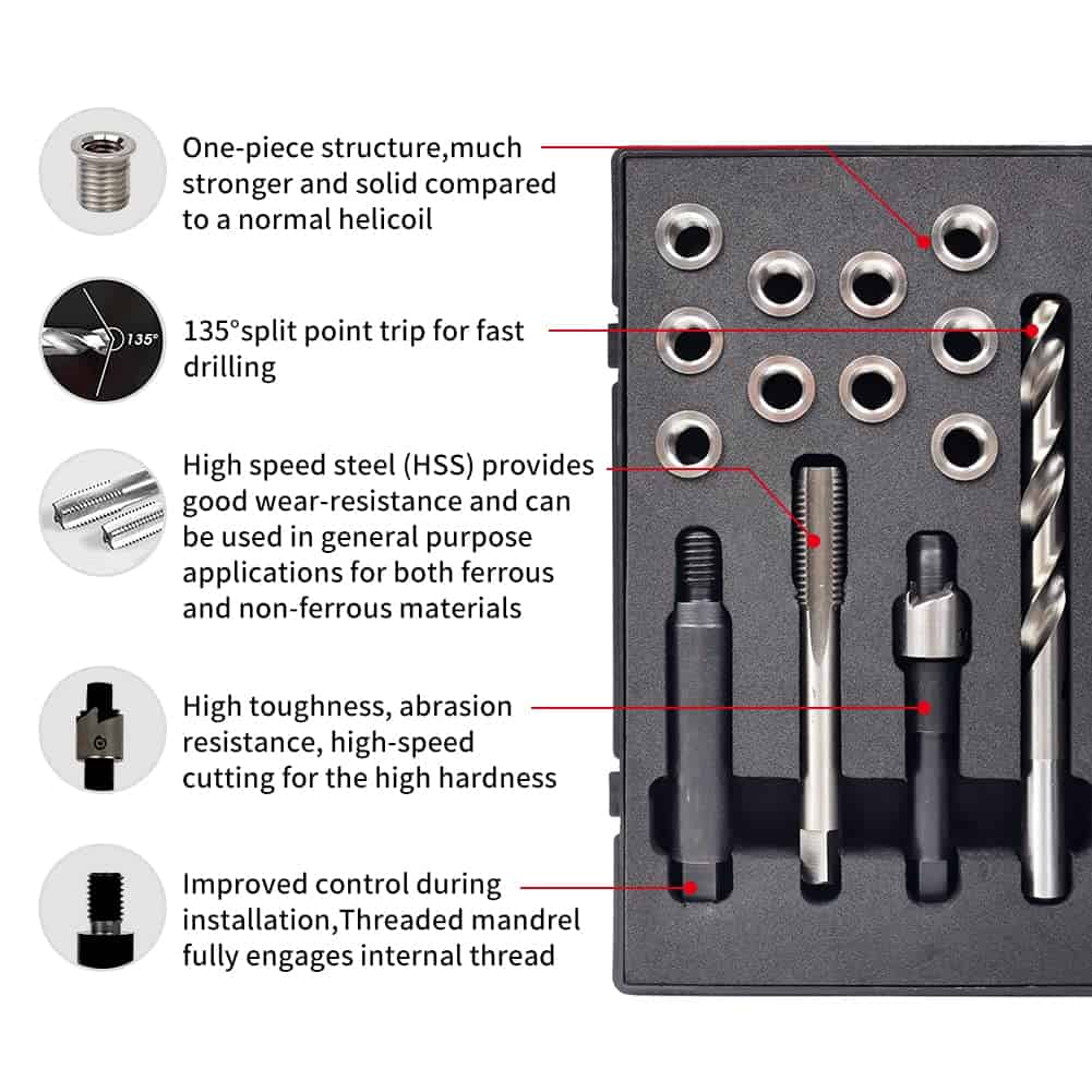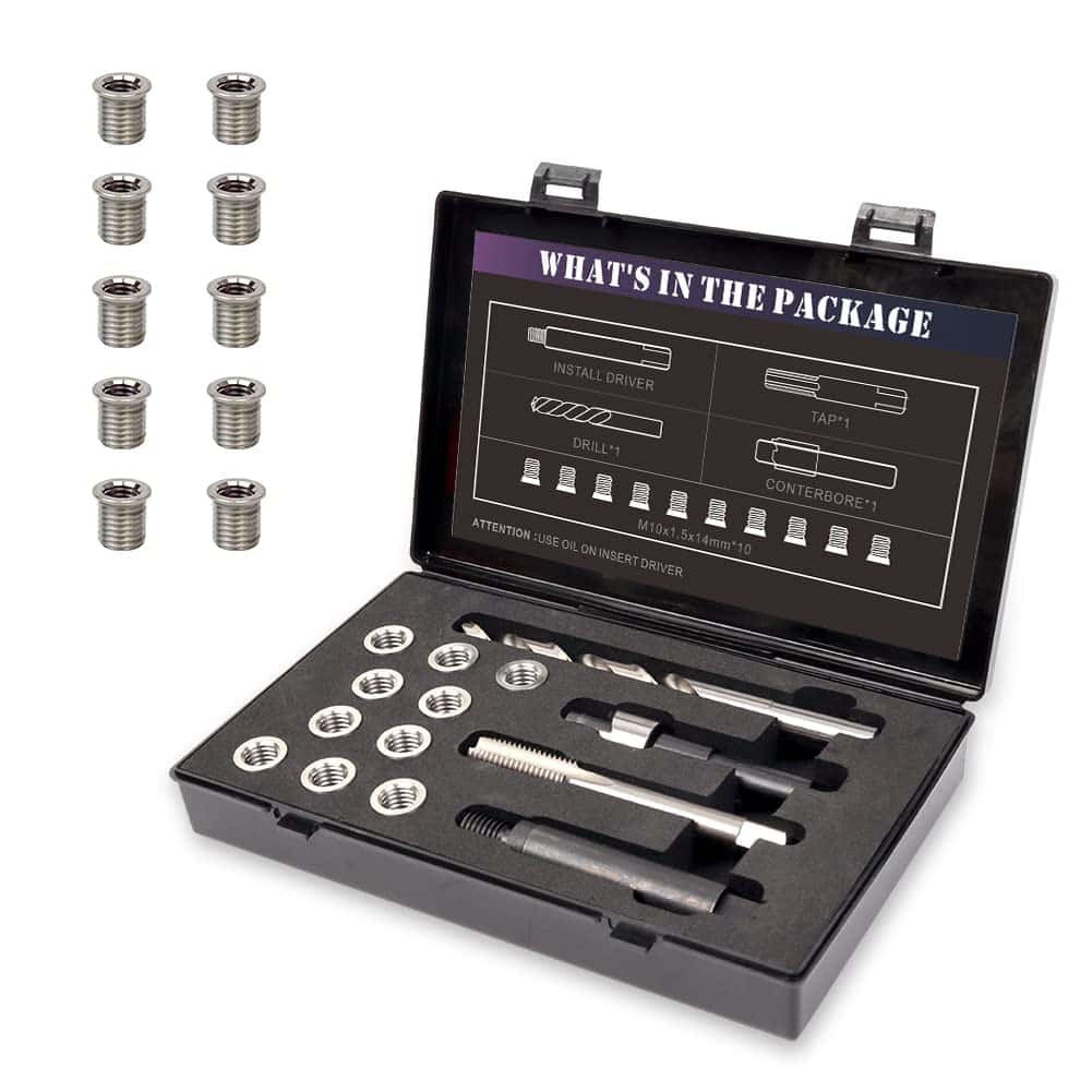 ¡Este es un kit completo que incluye: broca, herramienta de escariado, macho, herramienta de inserción y 10 insertos!