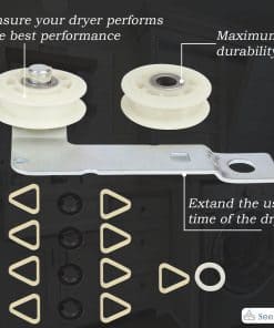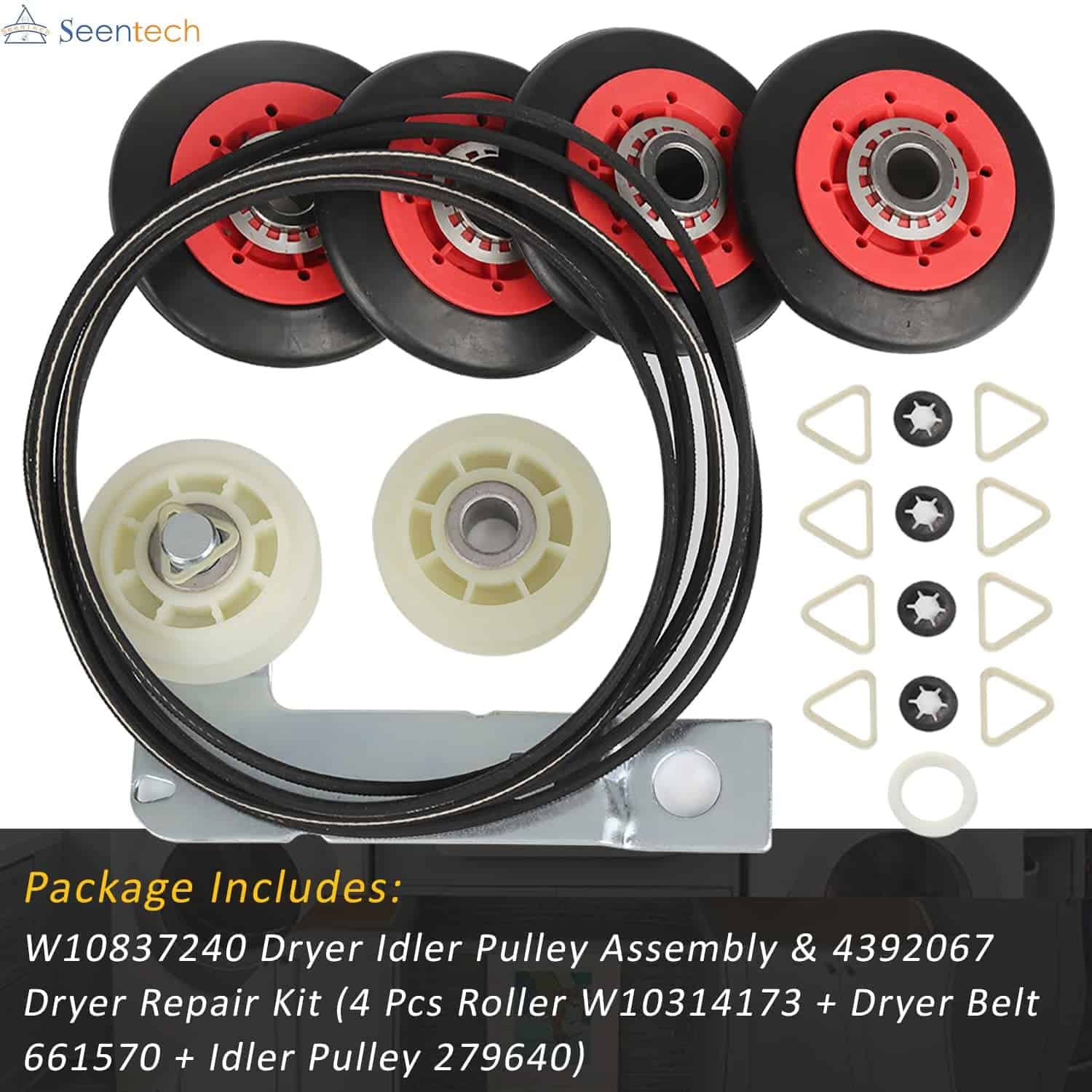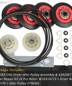 Incluye: Polea de Tensión de Secadora W10837240 y Kit de Reparación de Secadora 4392067 (Rodillo W10314173 – Correa 661570 – Polea de Tensión 279640) – Reemplaza Números de Parte 4392067, 4392067VP, 80047, 587637, AP3109602, PS373088, EAP373088, PD00002451 – W10837240 Reemplaza Números de Parte W10547290 W10118754 W10118756 W10547287.