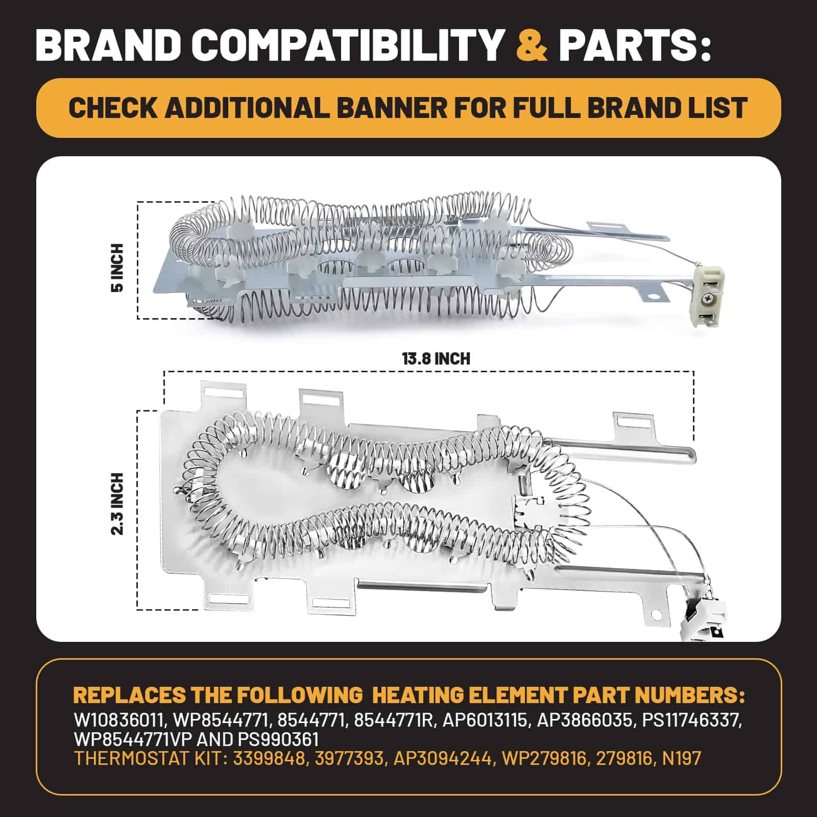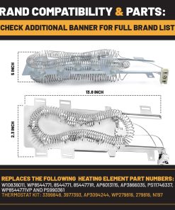 ¿Tu secadora tarda demasiado en secar la ropa? Este elemento calefactor de secadora de alta calidad está fabricado con metales y cerámicas duraderos, con un contenido de níquel-cromo superior al 85% para un calentamiento más rápido y una vida útil prolongada. Este elemento calefactor está diseñado para soportar altas temperaturas y un uso frecuente, garantizando un rendimiento confiable durante años. Importante: Siempre desconecta la fuente de energía y usa guantes antes de la instalación. Esta pieza de repuesto ha sido rigurosamente probada por el fabricante. Reemplaza los siguientes números de pieza: Kit de Termostato: 3399848, 3977393, AP3094244, WP279816, 279816, N197, 8544771. Elemento calefactor de secadora reemplaza la pieza: W10836011, WP8544771, 8544771, 8544771R, AP6013115, AP3866035, PS11746337, WP8544771VP y PS990361. ¡Haz que tu secadora vuelva a funcionar ordenando tu elemento calefactor de repuesto hoy mismo!