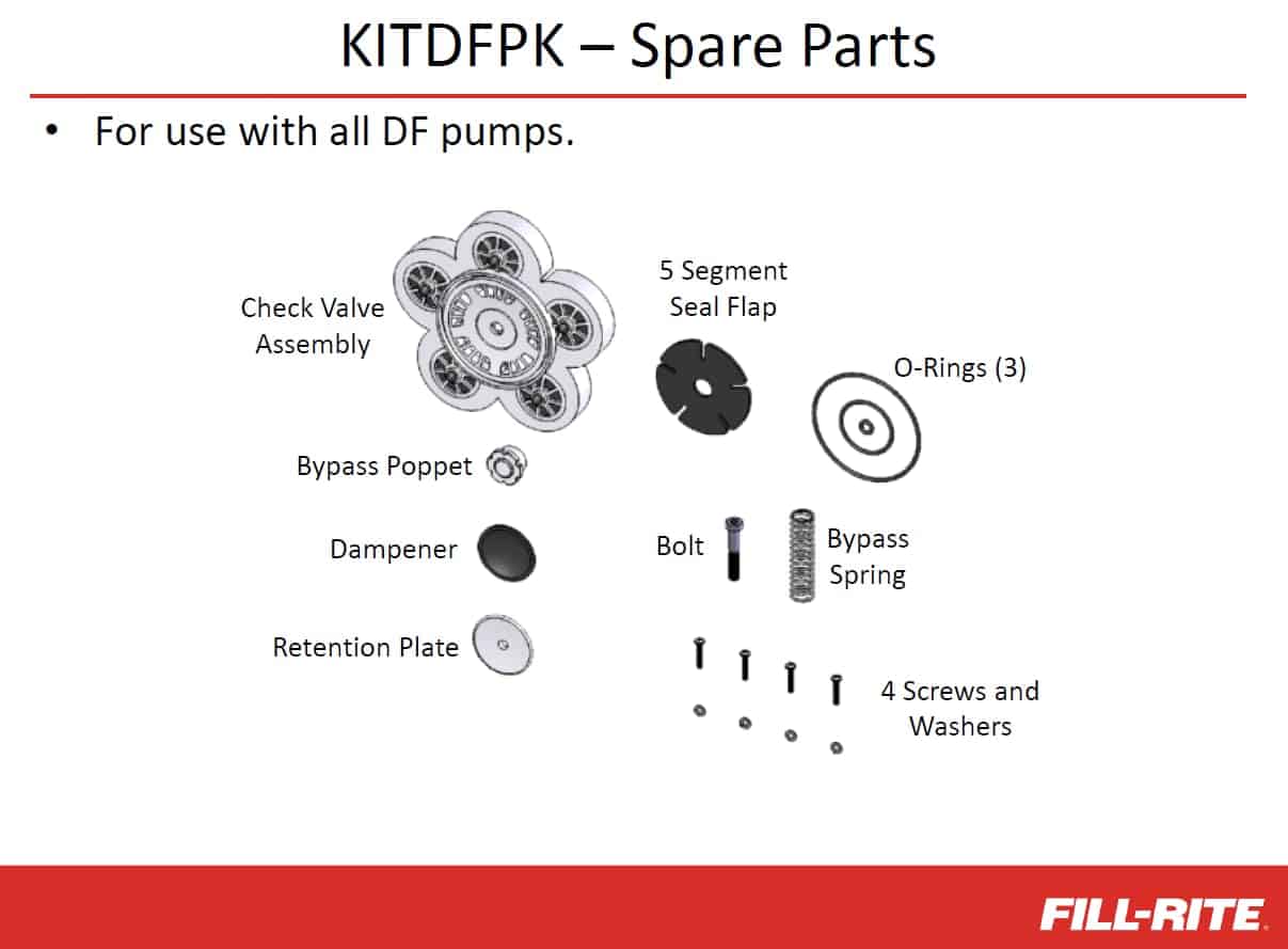 Las bombas Fill-Rite son productos fáciles y simples de reparar, y los kits son una alternativa de bajo costo para extender la vida útil de su bomba. Con nuestras piezas OEM certificadas, puede solucionar su problema y volver a operar con muy poco tiempo de inactividad. El kit de reparación Fill-Rite KITDFPK es el kit principal de revisión para todas las bombas de la serie DF. Otros kits de la serie DF disponiles son KITDFHF, KITDFFK, KITDFDB, KITDFCB.