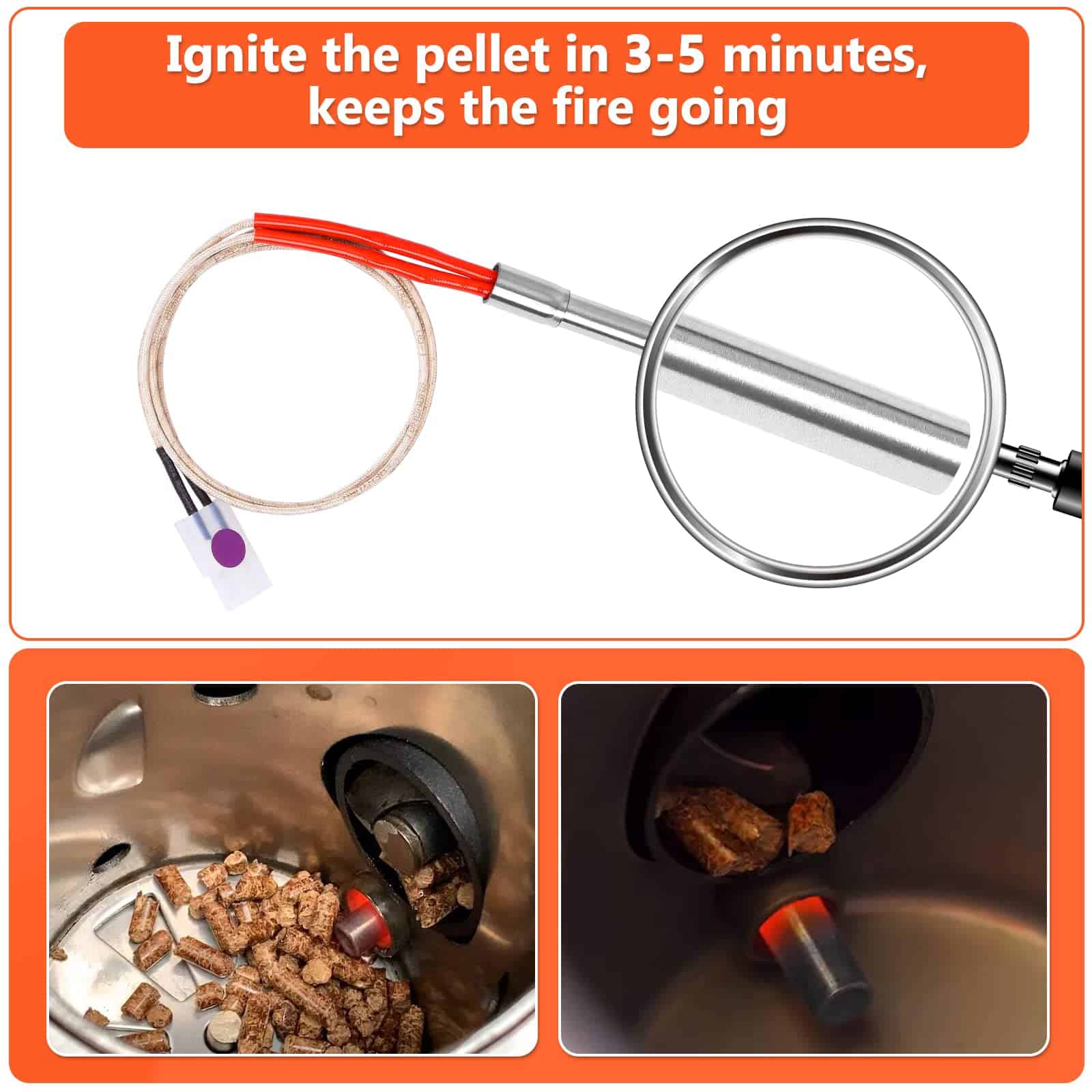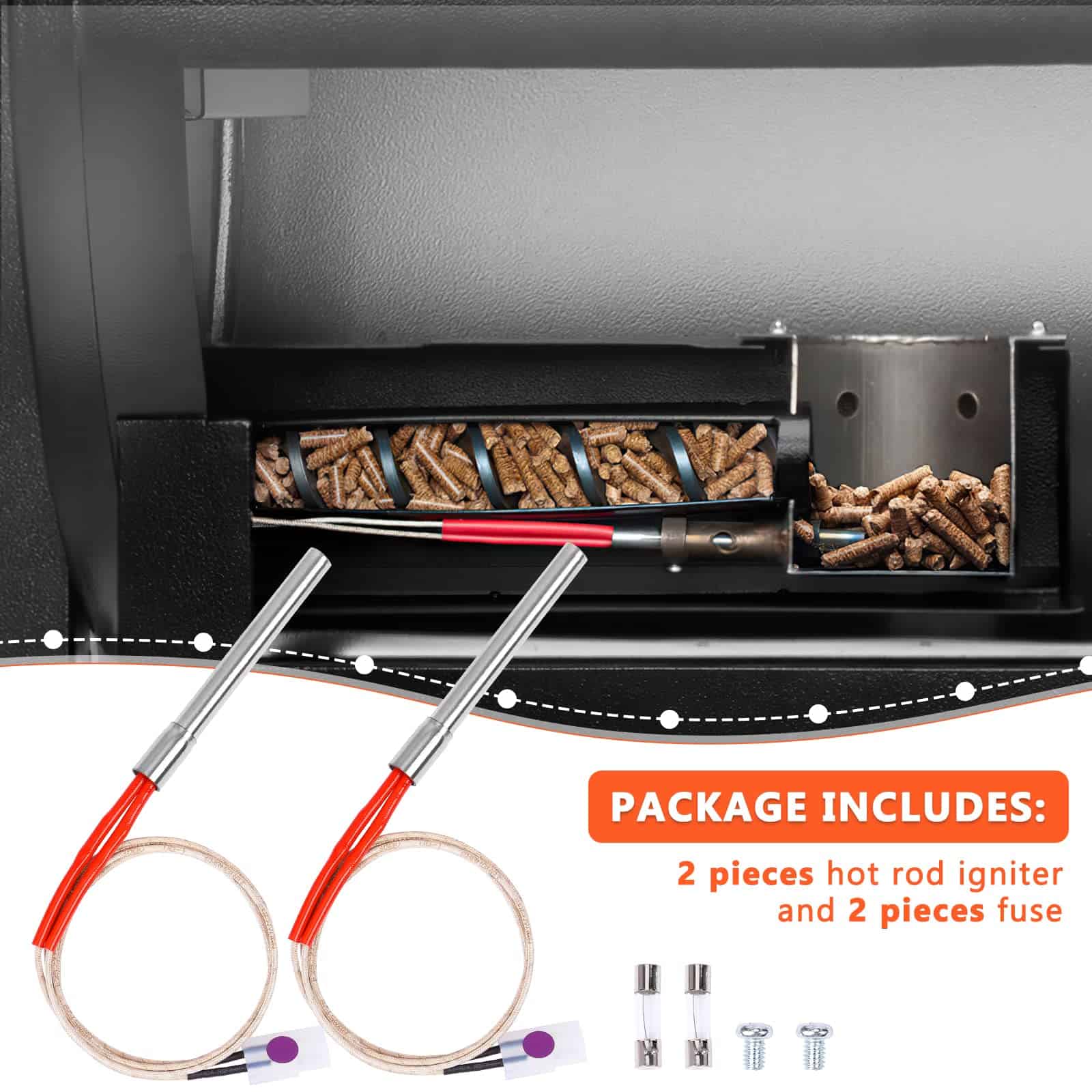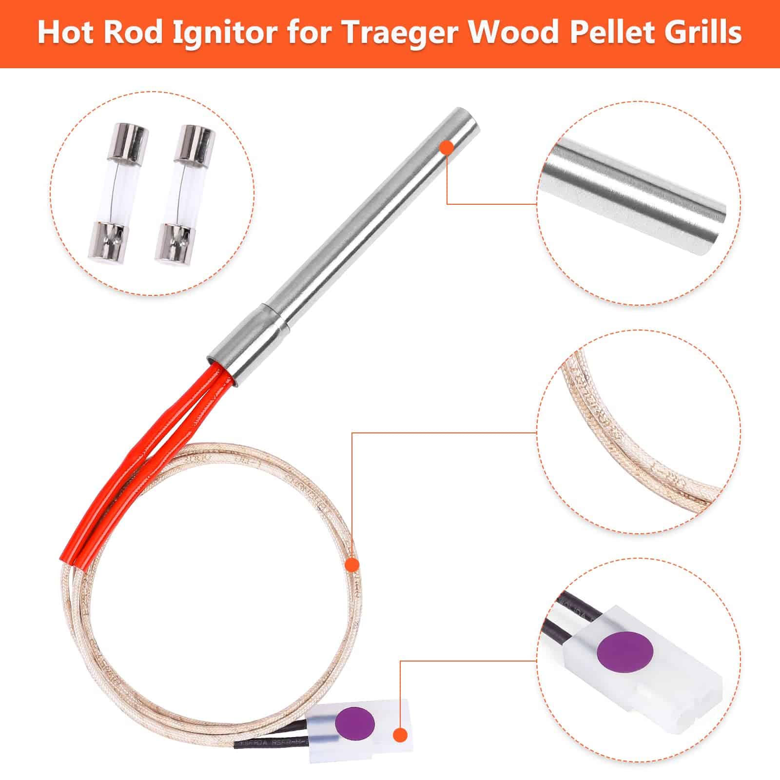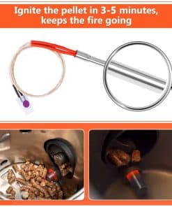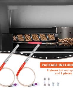 Cada juego viene con 2 encendedores de vara caliente de alta calidad y 2 fusibles a juego. Entendemos que su tiempo es precioso, por lo que hemos agrupado cuidadosamente estos componentes esenciales juntos. Ya no tendrá que correr buscando el tamaño correcto del fusible. Diseñado con la conveniencia del usuario en mente, este encendedor eléctrico de barbacoa facilita el encendido de su parrilla. La vara caliente es una potencia, capaz de encender el combustible de pellets en un tiempo súper rápido de 3-5 minutos. Además, mantiene una llama sólida y robusta, asegurando una temperatura de cocción constante. Ya sea que esté sellando filetes o ahumando lentamente costillas, nuestro encendedor proporciona la ignición confiable que necesita para una barbacoa perfecta cada vez. La instalación de nuestro kit de encendedor de parrilla es un proceso sencillo. Simplemente inserte la vara caliente para que aproximadamente 1/8-1/4 pulgada sobresalga en la olla de combustión, y estará en camino a un rendimiento mejorado de la parrilla. La vara caliente, que mide 30 pulgadas (76 cm) de longitud total, está elaborada con estándares exigentes. Una vez instalado, notará una mejora inmediata en la velocidad de ignición y la funcionalidad general de su parrilla. Si aún tiene preguntas sobre la vara caliente de repuesto para fumadores de pellets, o si encuentra algún problema en el proceso de uso, no dude en contactarnos. Contamos con un equipo de postventa profesional que le brindará la solución más efectiva.