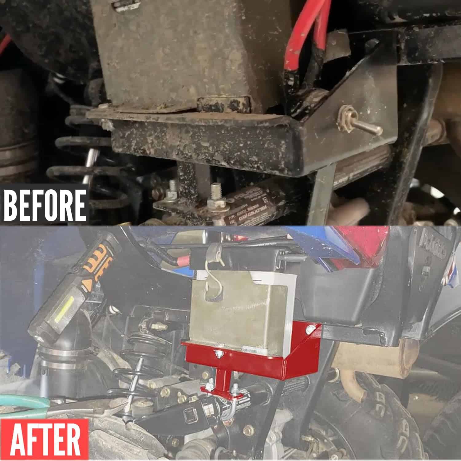 5. Hicimos una caja de batería de aluminio 6061 {Sin acero} que se monta en el chasis y en el tubo de la barra estabilizadora. Luego reutiliza tu caparazón, cubierta y correa de batería originales para montar la batería. Nota: Este kit NO incluye una nueva batería. No es compatible con los modelos X2 o 6×6 debido a la cama. Además, los modelos 2014 utilizan una correa metálica que deberá actualizarse a un hardware de montaje más nuevo.