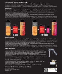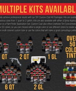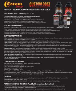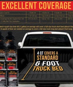 Kit de 1 galón (4 cuartos) de Revestimiento para Cama de Camioneta Custom Coat para Aplicar con Rodillo, Brocha o Pistola. Incluye: 4 latas de 24 fl. oz. de Base para Revestimiento de Cama de Camioneta Negro, 4 latas de 8 fl. oz. de Endurecedor estándar Custom Coat y 1 Kit de Aplicador de Pintura con Rodillo de 7 piezas de Custom Coat que incluye 2 Rodillos, Marco, 2 Brochas y Bandeja con liner. Cobertura estimada es de 110 a 130 pies cuadrados @ 10 mils de espesor de película húmeda. Custom Coat es un revestimiento protector texturizado premium duradero de larga duración que puede tolerar condiciones climáticas extremas. Es resistente al calor, a los rayos UV e impermeable, por lo que protege las superficies recubiertas del óxido. Úsalo para ayudar a amortiguar sonidos y vibraciones. Custom Coat fue desarrollado para proporcionar una superficie texturizada duradera y flexible con un gran aspecto y es un revestimiento de uretano de 2 partes de alta resistencia que es fácil de aplicar. Proporciona la máxima protección de superficie para casi cualquier aplicación. A diferencia de otros revestimientos protectores y de cama, Custom Coat es un material flexible que resistirá el astillado, al mismo tiempo que proporciona protección contra impactos y resistencia a la abrasión. Estas características y beneficios lo convierten en perfecto para su aplicación más popular como revestimiento de cama de camioneta. Custom Coat es un producto muy versátil que se puede utilizar en una cantidad infinita de aplicaciones. Úsalo en camas de camionetas, exteriores completos de vehículos, chasis, parachoques, vehículos comerciales, equipos y remolques. También es ideal para uso doméstico como revestimiento antideslizante para pisos, incluyendo pisos de garaje, concreto, madera, escalones, pasarelas, cubiertas de madera, muelles, bañeras, pisos de sótanos, paredes, cajas de herramientas y compartimentos de motores. Alcanza fácilmente resultados profesionales con nuestros Kit de Bricolaje Custom Coat. Los kits están disponibles en varios tamaños, desde 1 cuarto hasta 2 galones. También están disponibles kits con una Pistola Aplicadora de Aerosol o un Juego de Aplicación de Pintura con Rodillo. Custom Coat también ofrece Concentrado de Tinte de Uretano en más de 50 colores, por lo que puedes elegir un solo color o usar diferentes colores para crear tu propio aspecto personalizado multicolor o usar los colores que crearán un gran patrón de camuflaje.