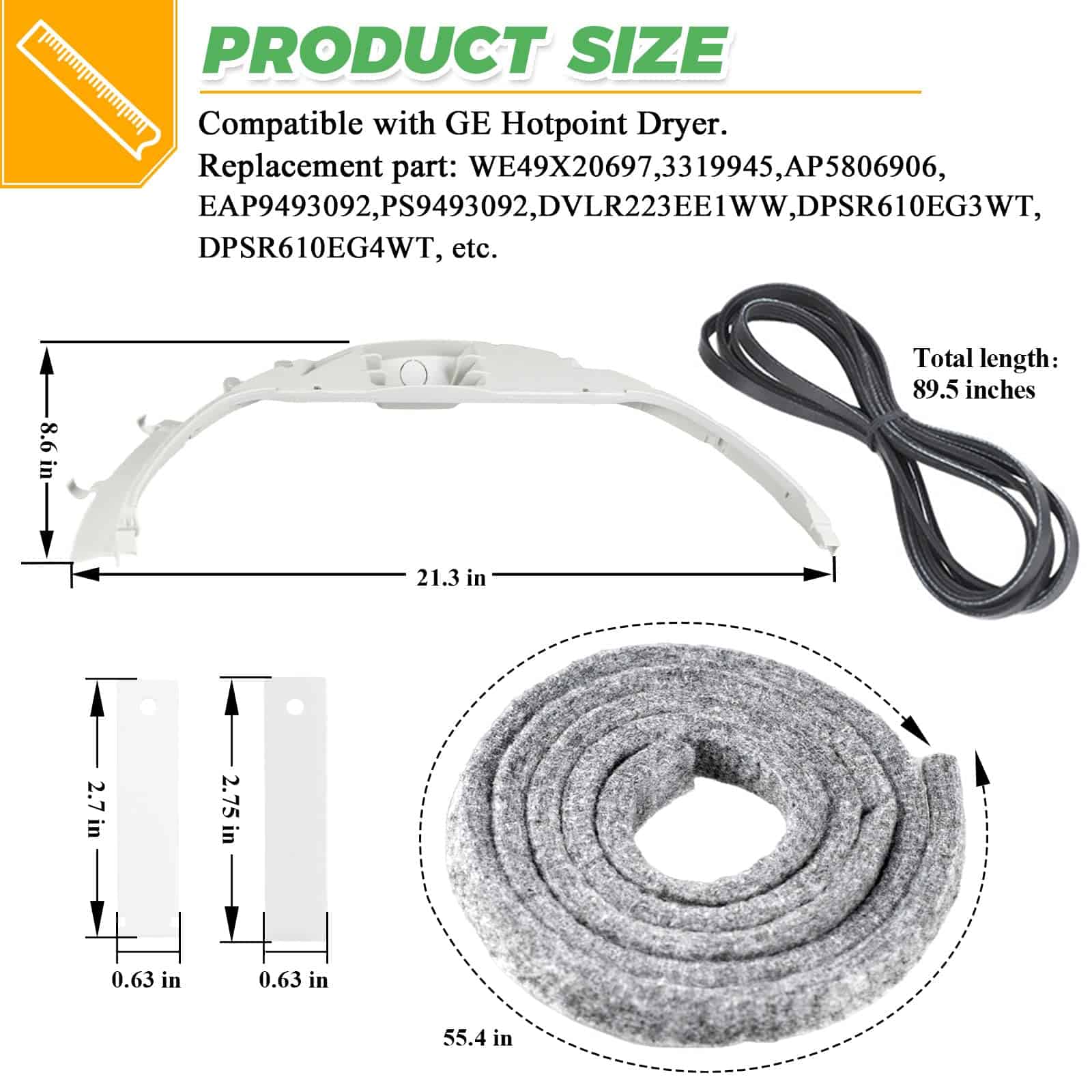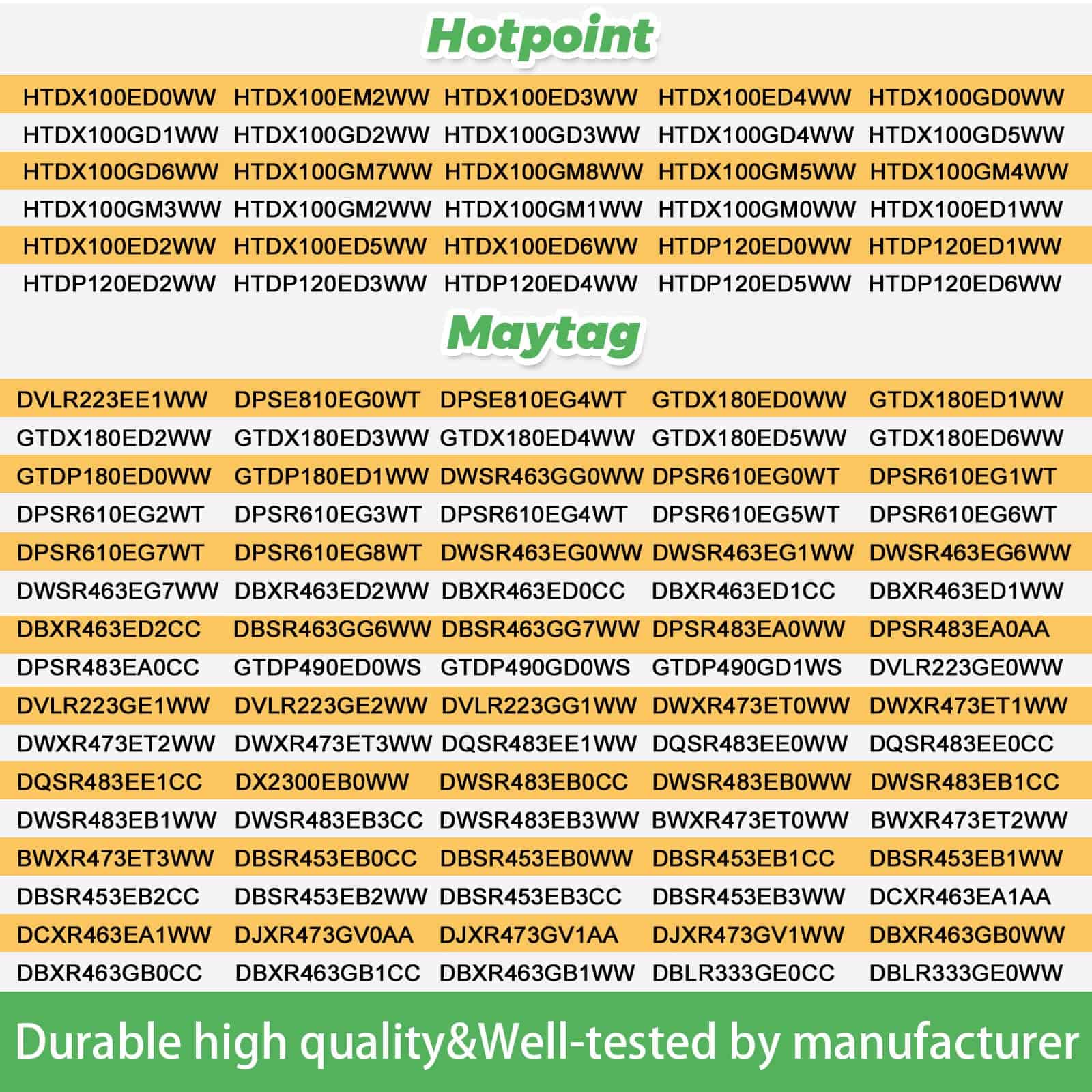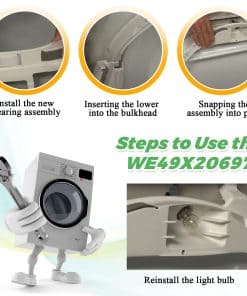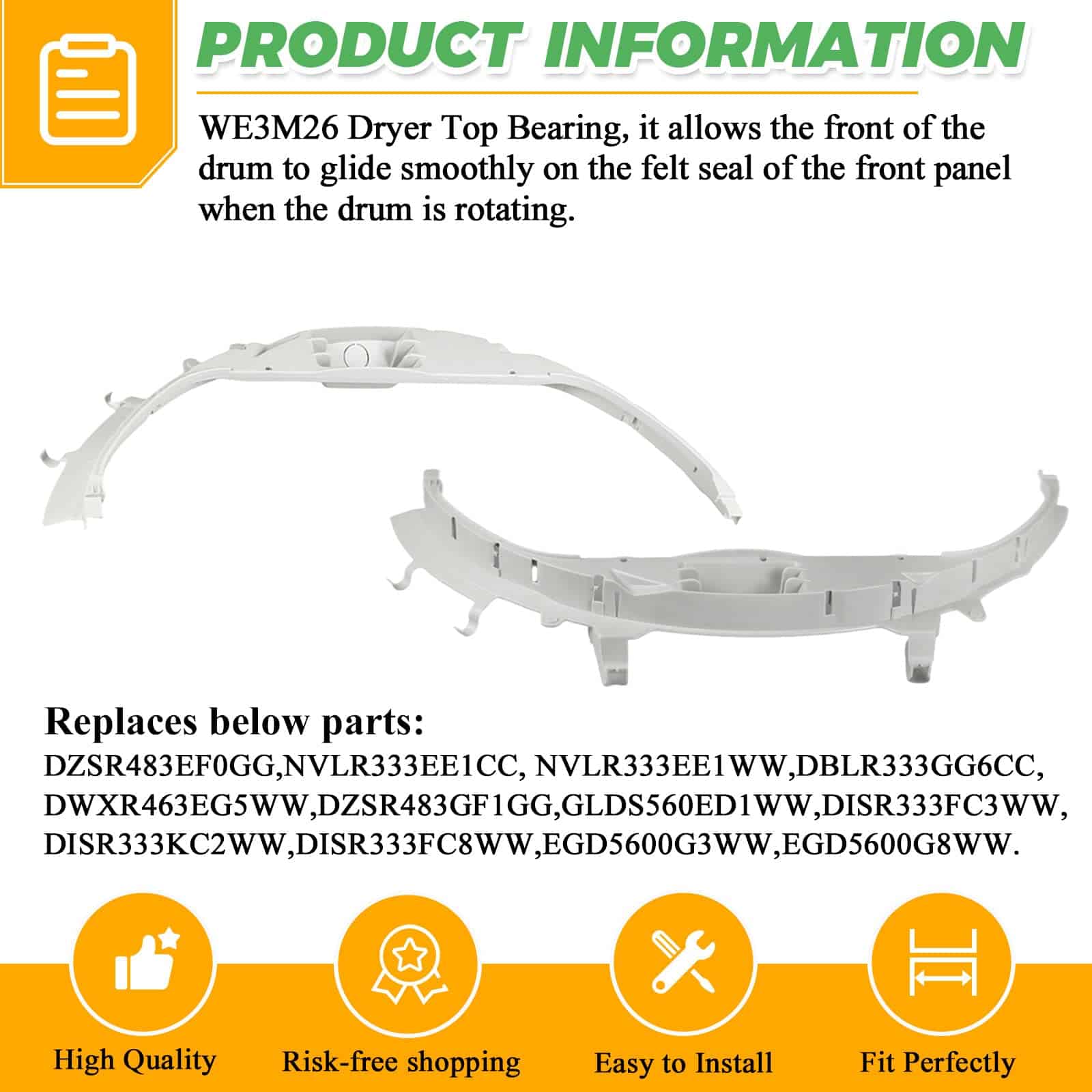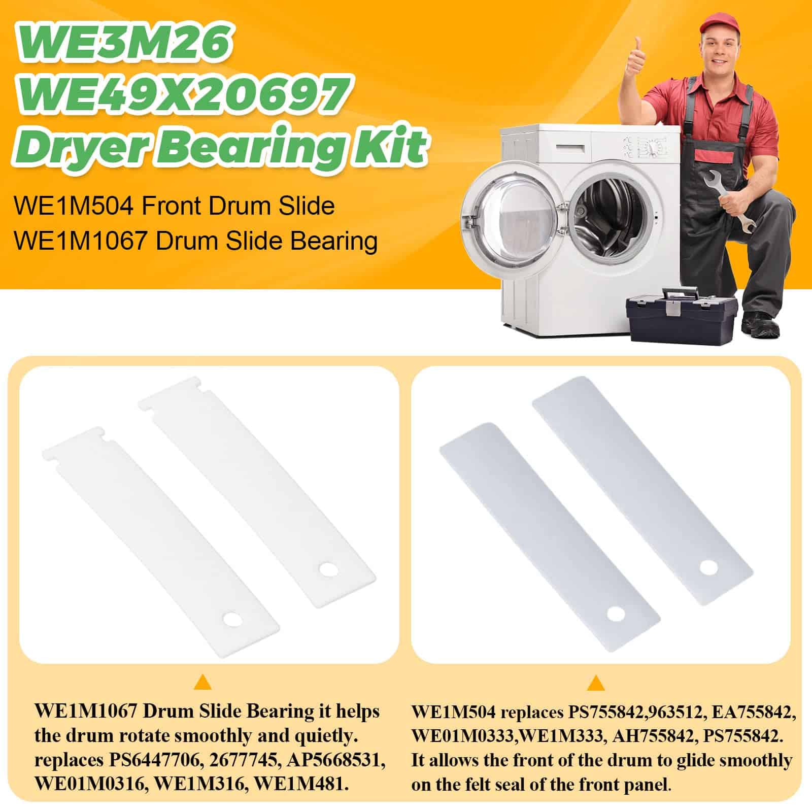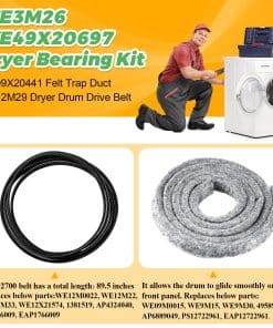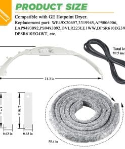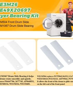 El rodamiento superior WE3M26 de la secadora está equipado con 4 cojinetes deslizantes para garantizar una rotación suave y silenciosa del tambor. La correa de transmisión del tambor de la secadora WE12M29 tiene una longitud aproximada de 89-1/2 pulgadas con 4 nervaduras. Los deslizadores del tambor WE1M504 se adjuntan a los lados exteriores del cojinete, ayudan a soportar la parte delantera del tambor mientras gira y permiten que el tambor gire. Los deslizadores de tambor WE1M1067 soportan el tambor en el lado delantero y permiten que el tambor se mueva suavemente. El fieltro WE09X20441 evita que el aire exterior entre en el tambor de la secadora. Incluye: 1 x Rodamiento superior WE3M26, 2 x Deslizadores del tambor delanteros WE1M504, 2 x Cojinete deslizante de tambor WE1M1067, 1 x Correa de transmisión del tambor de la secadora WE12M29, 1 x Fieltro de trampa WE09X20441. Pasos de instalación: 1. Desenchufe la secadora antes de instalar esta pieza. Use guantes de trabajo para proteger sus manos. 2. Retire los tornillos del panel frontal, desconecte las conexiones eléctricas del conjunto del rodamiento, retire el conjunto de rodamientos existente después de presionar las lengüetas y levantar del conjunto del panel. 3. Reemplace el nuevo conjunto, presione y ajuste firmemente en su lugar. 4. Vuelva a conectar los cables eléctricos, alinee el tambor de la secadora en el conjunto de rodamientos en el panel frontal y vuelva a colocar el panel frontal. Síntomas aplicables: Ruidoso, no gira, tarda mucho en secar. Modelos reemplazables: GE—DVLR223EE1WW, DPSE810EG0WT, DPSE810EG4WT, GTDX180ED0WW, GTDX180ED1WW, GTDX180ED2WW, GTDX180ED3WW, GTDX180ED4WW, GTDX180ED5WW, GTDP180ED1WW, DBSR463GG7WW, DPSR483EA0WW, GTDP490ED0WS, GTDP490GD0WS, GTDP490GD1WS, DVLR223GE0WW, DWXR473ET0WW, DWXR473ET1WW, DQSR483EE1CC, DX2300EB0WW, DWSR483EB0CC, DWSR483EB0WW, DWSR483EB1CC, DWSR483EB1WW, DWSR483EB3CC, DWSR483EB3WW, BWXR473ET0WW, BWXR473ET2WW, BWXR473ET3WW, DBSR453EB0CC, DBSR453EB0WW, DBSR453EB1CC, DBSR453EB1WW, DBSR453EB2CC, etc. HotpointE–