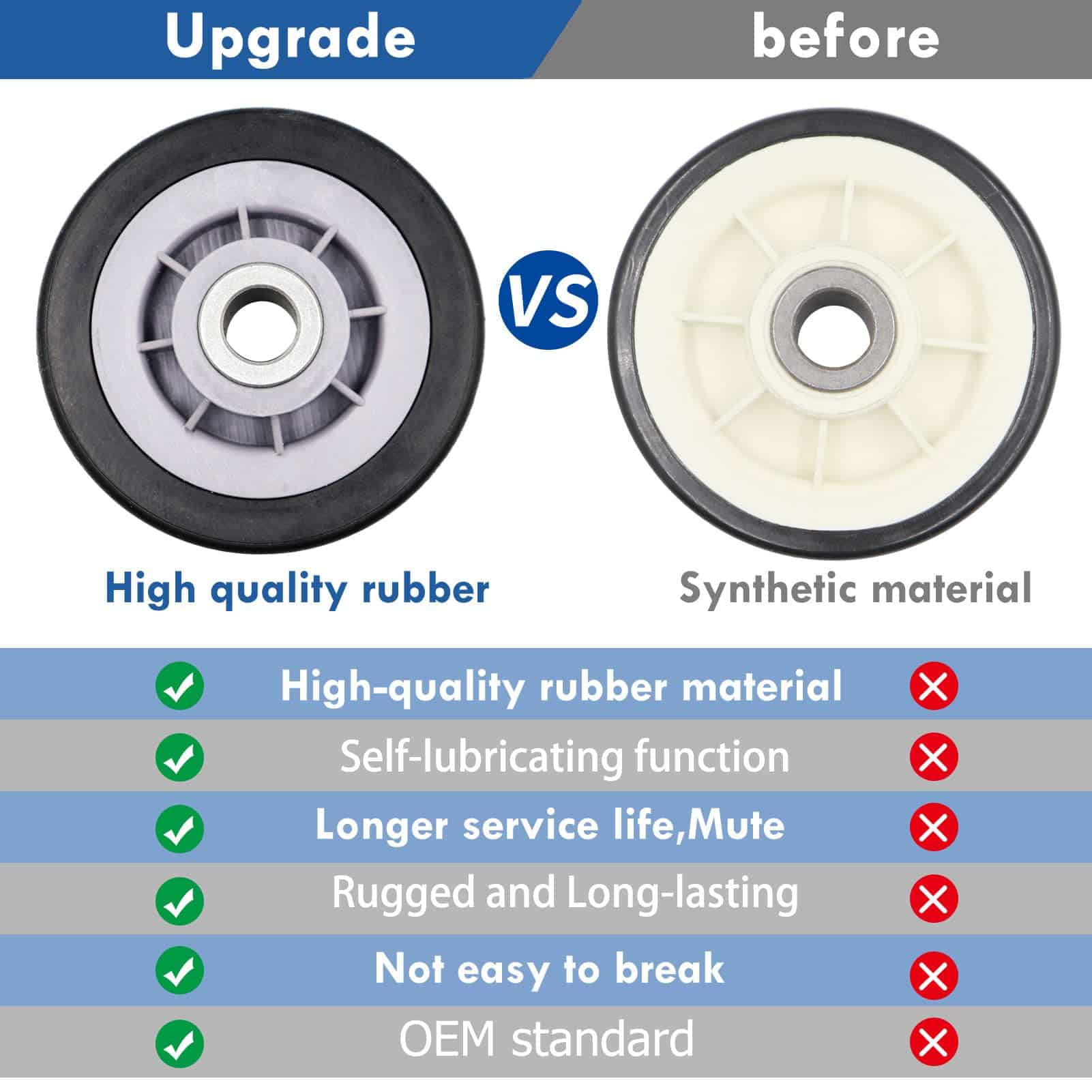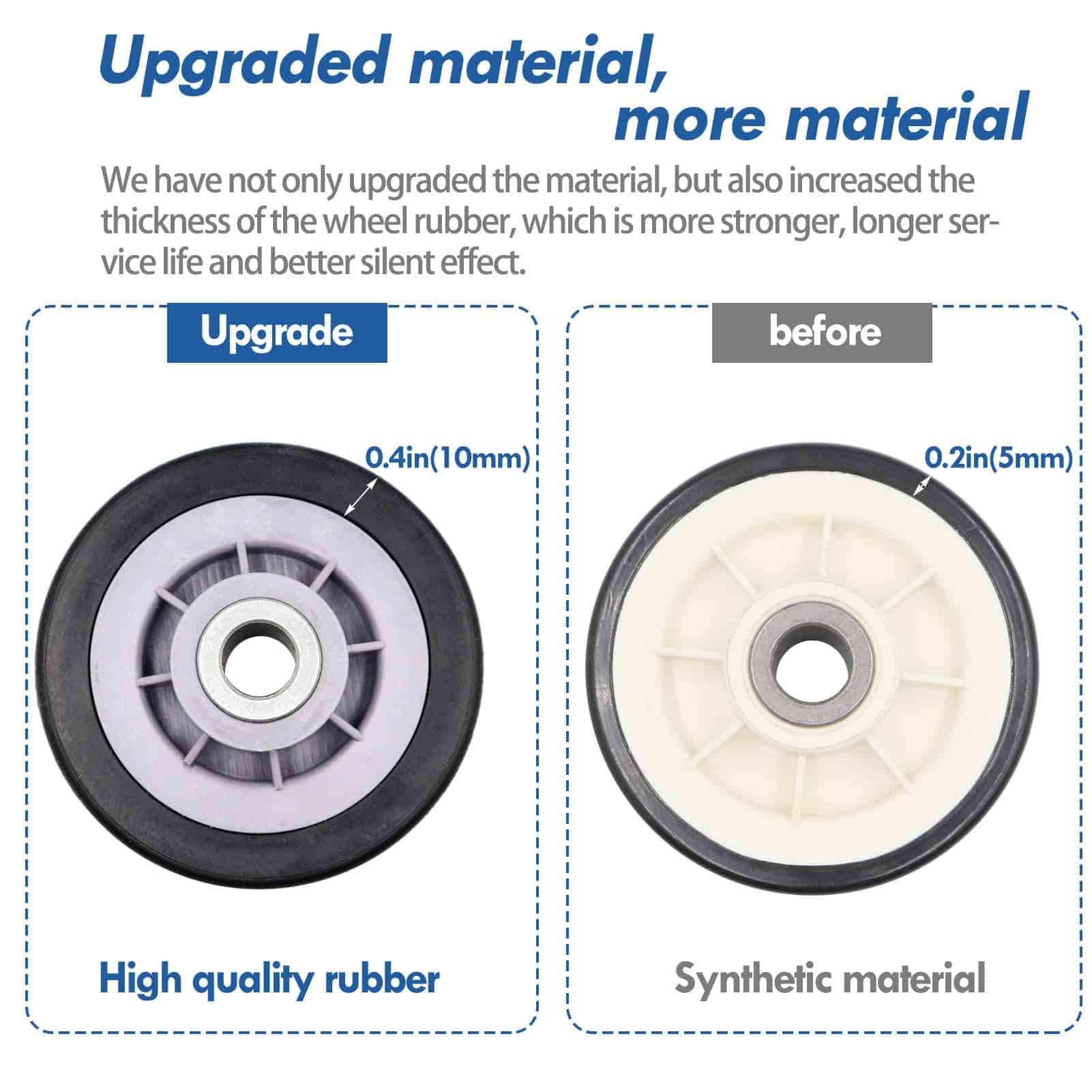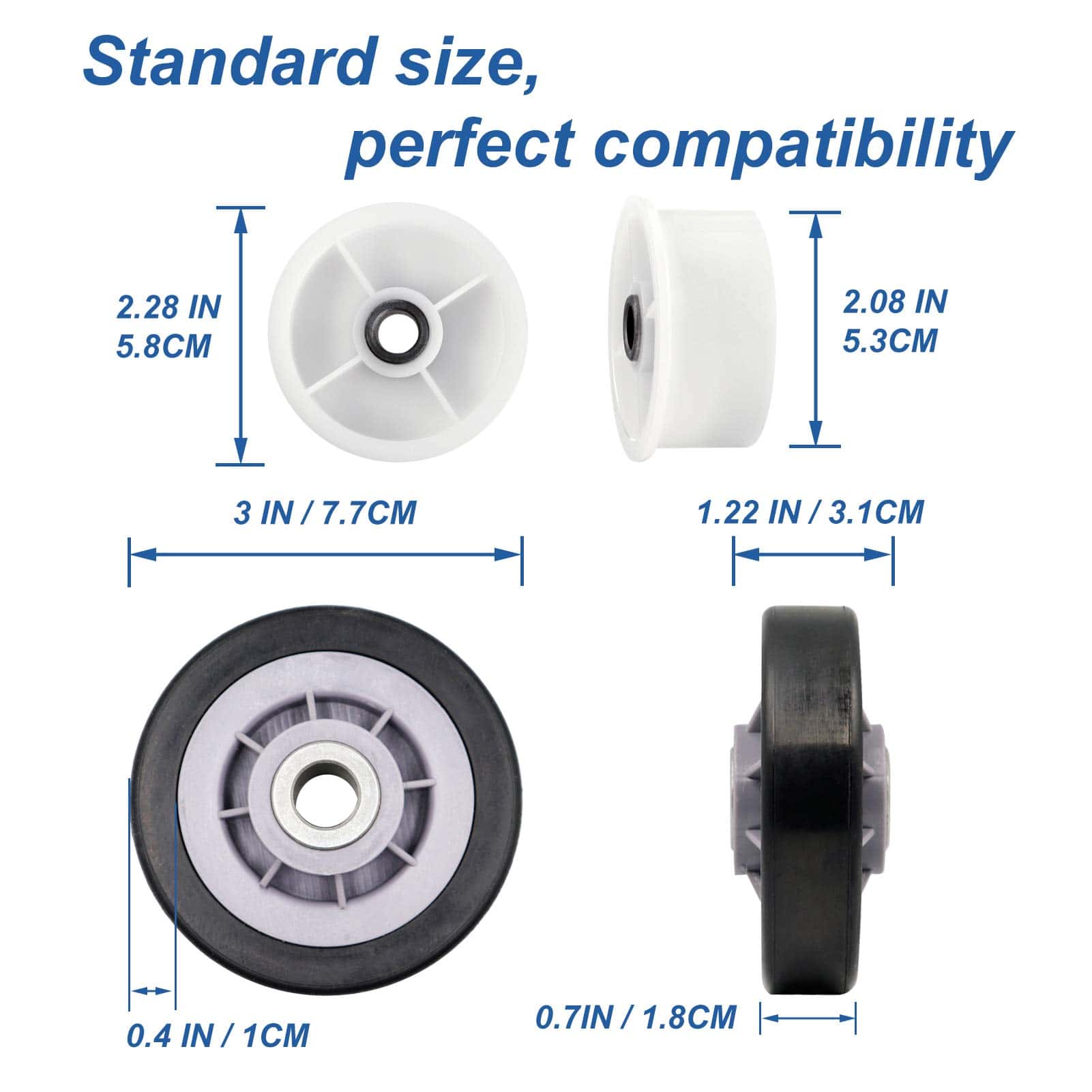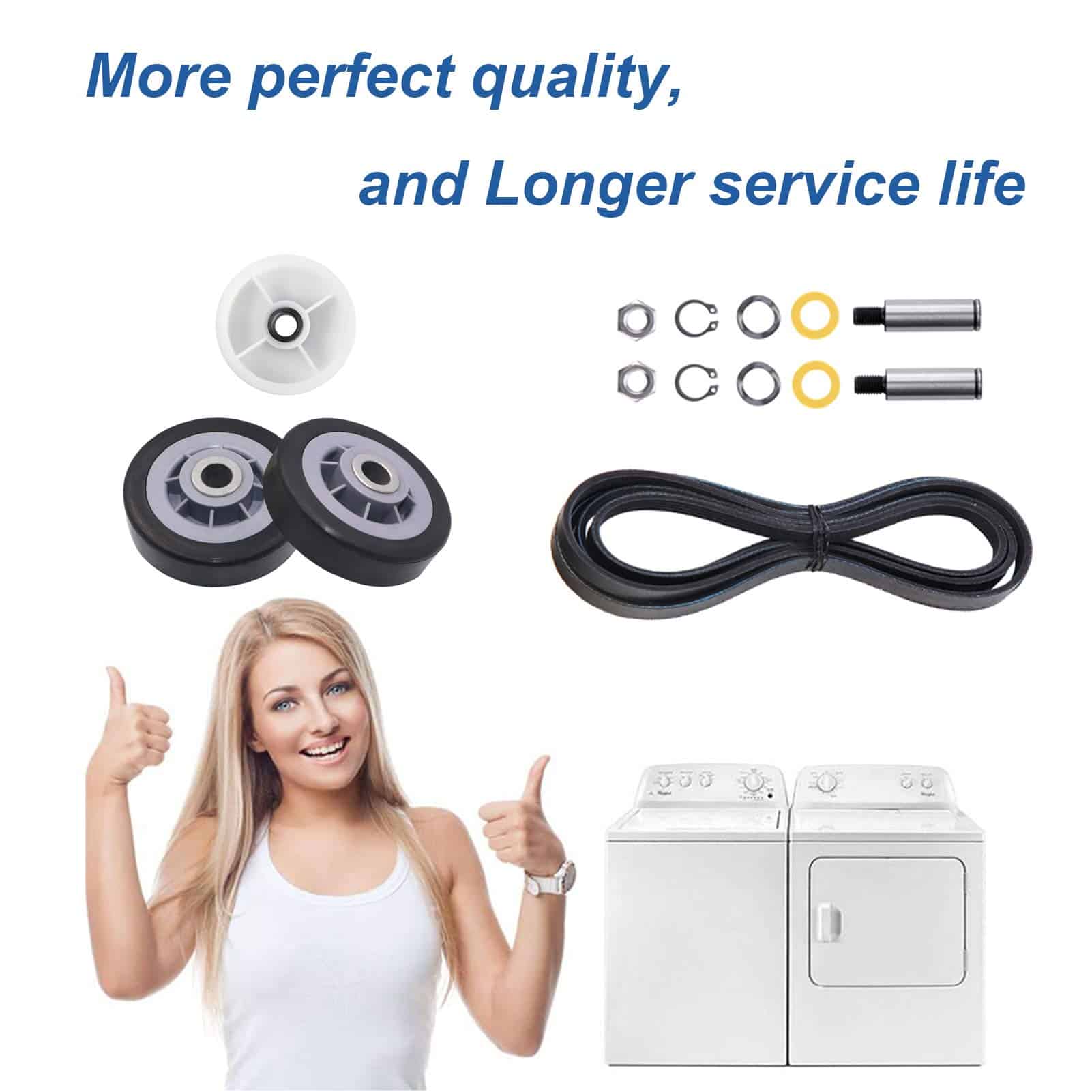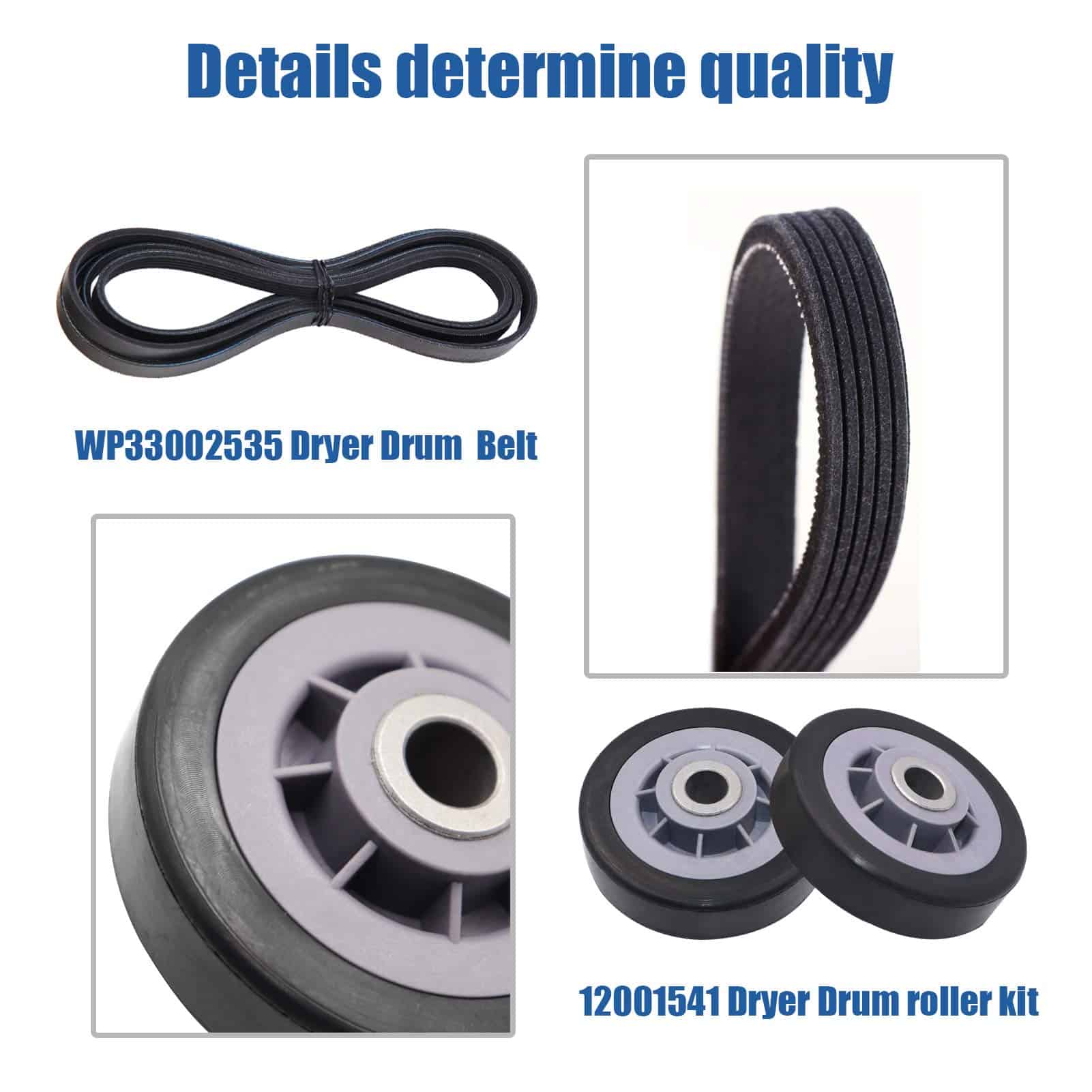 Kit completo de reparación para secadoras que incluye rodillos de tambor, polea loca y correa de tambor. Este kit es compatible con secadoras Maytag, Kenmore, Crosley, Amana, Jenn Air, entre otras marcas. Los rodillos de tambor están diseñados para soportar el tambor de la secadora y reemplazan los números de pieza 12001541VP, AP4008534, PS1570070, EAP1570070, W10116741, 3-3373, 303373, 303373K, Y303373, DE693, K35-248, 400518, entre otros. La polea loca reemplaza los números de parte 33001783, 6-3700340, WP6-3700340VP, 1472812, AP4373393, PS2347262, EAP2347262, etc. La correa de tambor reemplaza los números de parte 33001777, 33002535, WP33002535VP, 791135, AP6007983, PS11741110, EAP11741110, etc. Ofrecemos un excelente servicio al cliente con garantía de devolución de dinero de 30 días y garantía de 1 año.