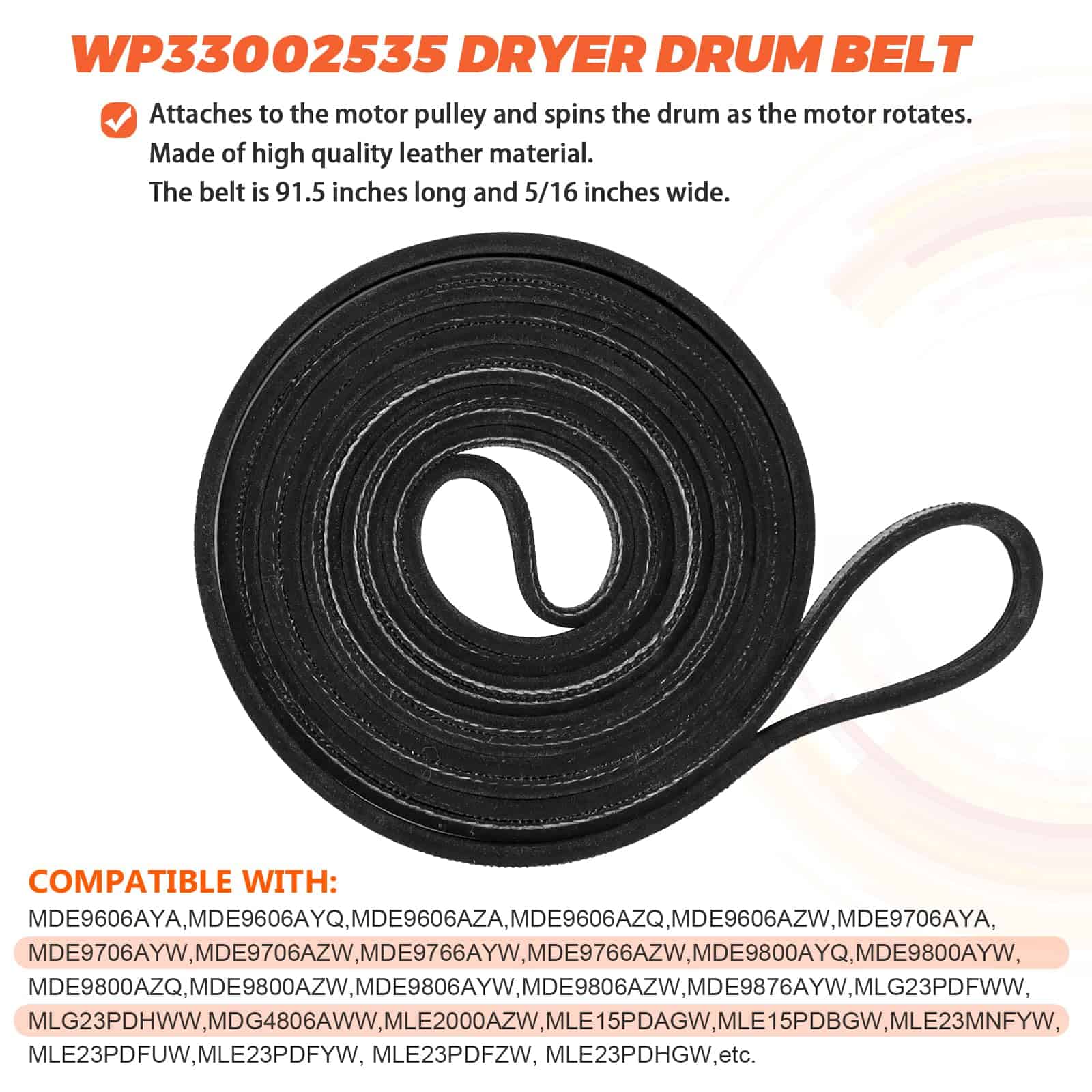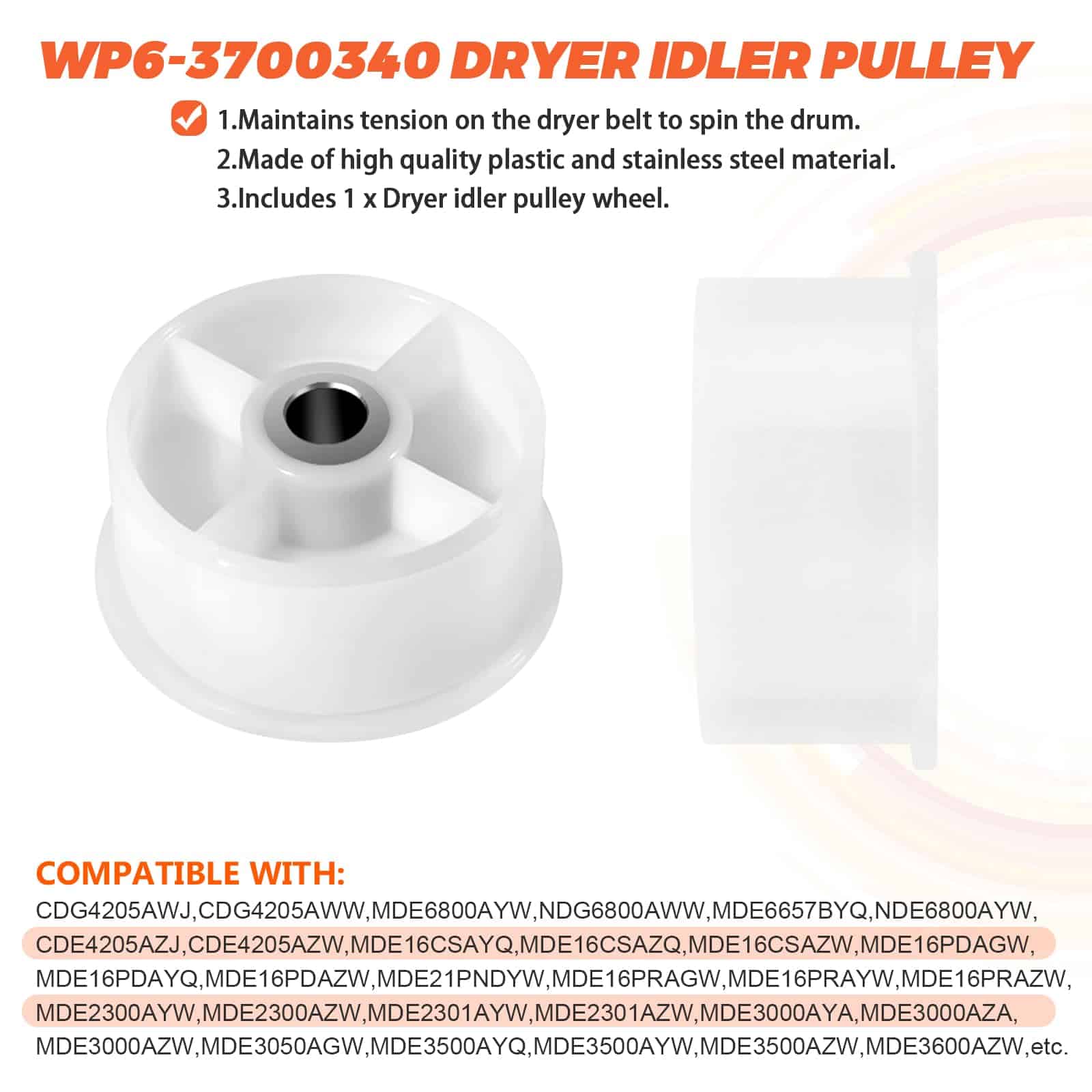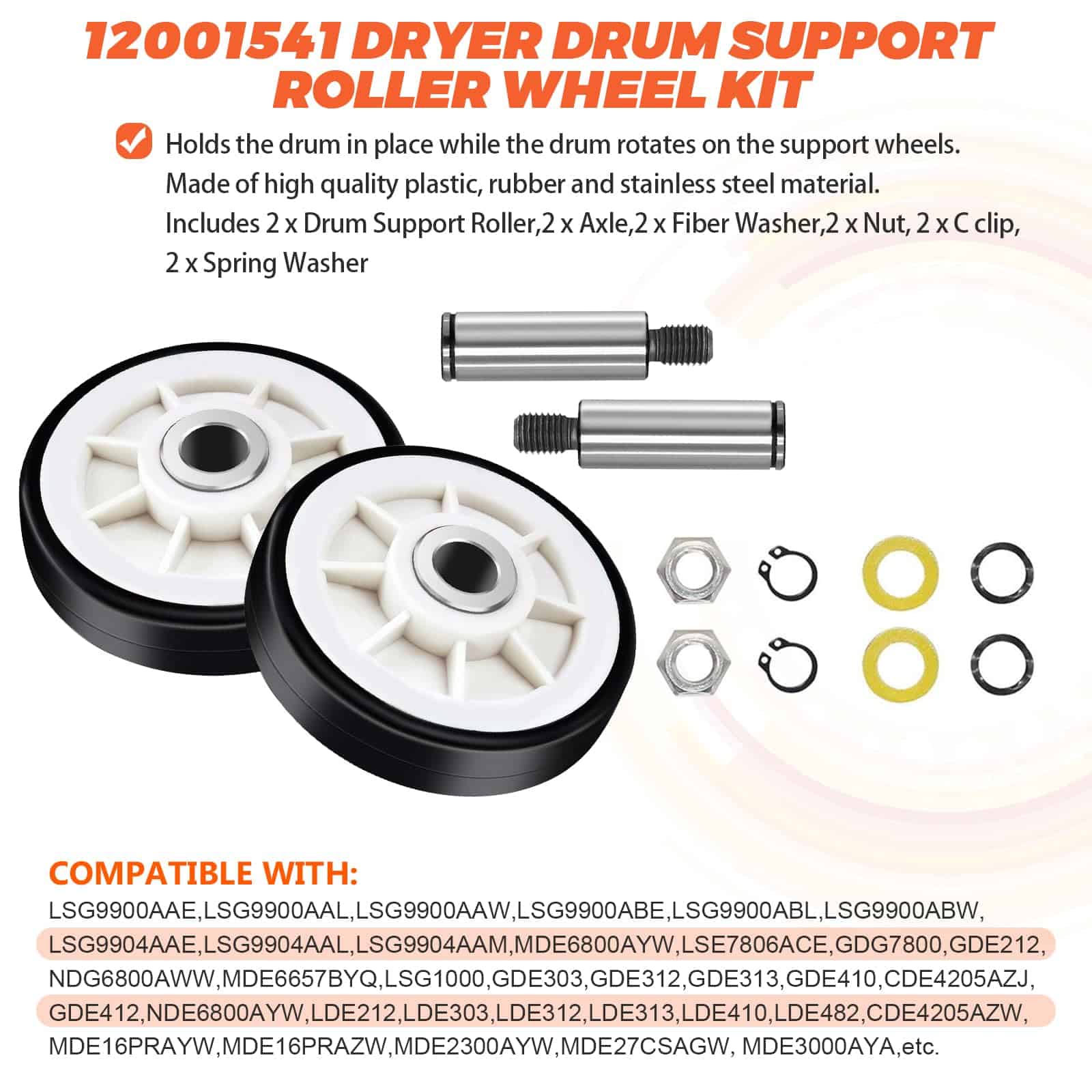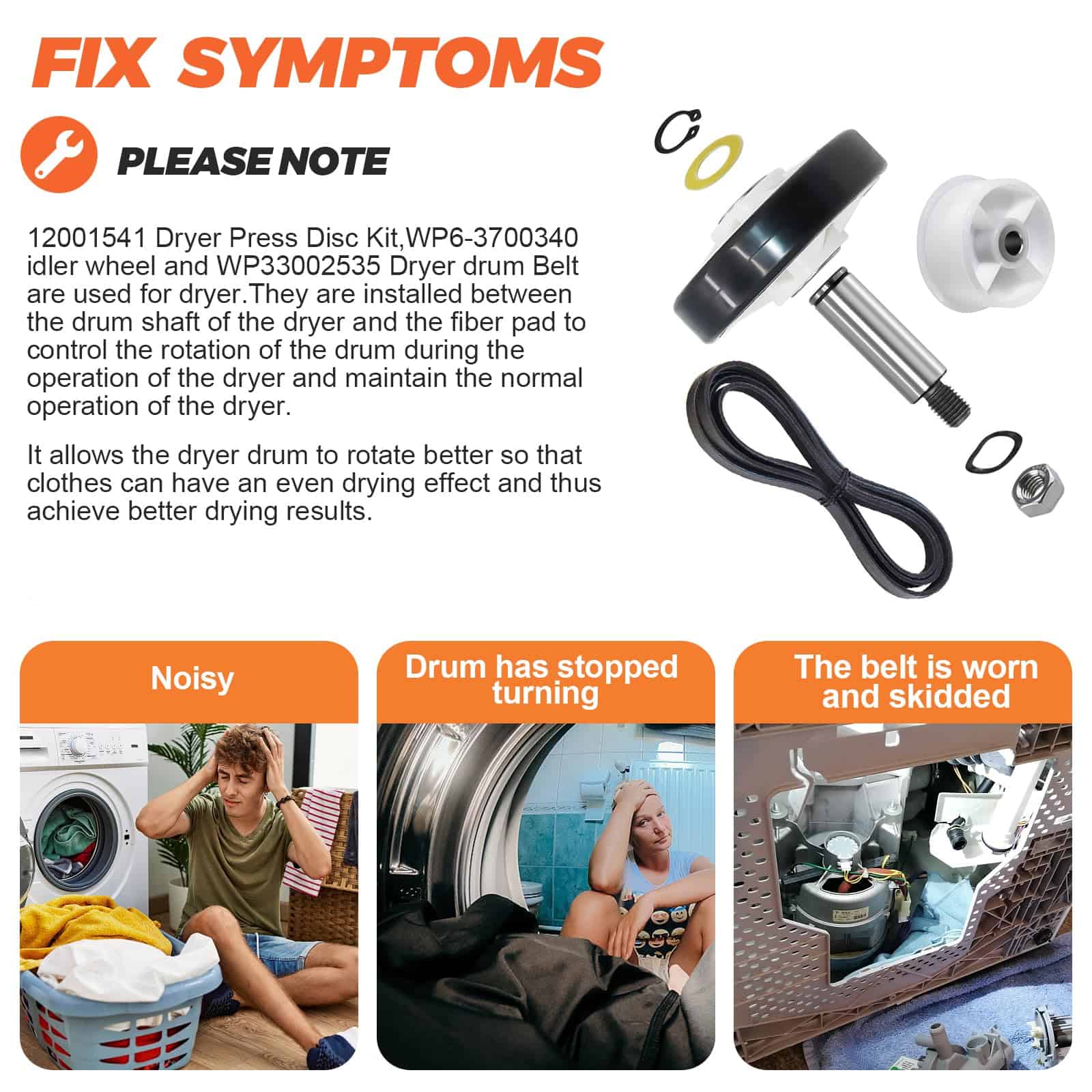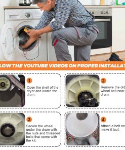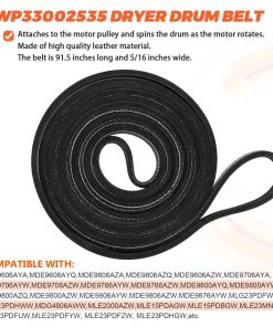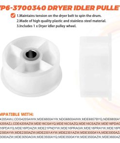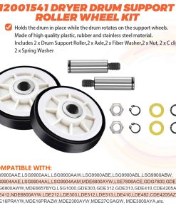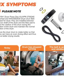 DESCRIPCIÓN DEL PRODUCTO: El Kit de Rodillo para Tambor de Secadora 12001541 es de unos 3″ de diámetro e incluye un rodamiento y 2 arandelas. La polea tensora WP6-3700340 mantiene la tensión correcta en la correa de transmisión para hacer girar el tambor. Mantiene la tensión contra la correa de la secadora. La Correa de Tambor WP33002535 es de aproximadamente 91 1/2 x 5/16. Plana por un lado con 5 nervaduras en el otro lado. PAQUETE INCLUYE: 2 unidades de Kit de Rodillos para Tambor 12001541, 1 unidad de polea tensora WP6-3700340, 1 unidad de Correa de Tambor WP33002535. CONSEJOS DE INSTALACIÓN: Las herramientas necesarias para la instalación son: destornillador y juego de llaves. Desenchufe la secadora antes de instalar esta pieza. Use guantes de trabajo para proteger sus manos. CORRIGE LOS SIGUIENTES SÍNTOMAS: Ruidoso, No gira, La secadora no arranca, La secadora no produce suficiente calor. COMPATIBLE CON LA MAYORÍA DE LAS MARCAS: Kenmore, Whirlpool, Crosley, Amana, Jenn Air, etc. COMPATIBLE CON LOS SIGUIENTES NÚMEROS DE MODELO: Kit de Rodillos para Tambor 12001541: MDG6800AWQ, MDG6800AWW, MDG9800AWQ, MDG9800AWW, CDE4205AYW, CDE4205AYJ, GDG8000, GDG882, MUE2000AYM, etc. Polea Tensora WP6-3700340: MUE2000AYM, MUE2000AYW, MUE2000AZW, MUG2000AWW, MHG15PDAEW, MDE6800AYW, NDG6800AWW, CDE4205AZJ, MDE16CSAYQ, MDE16CSAZQ, MDE16PDAGW, etc. Correa de Tambor WP33002535: MUE2000AYM, MUE2000AYW, MUE2000AZW, MHG15PDAEW, CDG4205AWJ, CDG4205AWW, MDE6800AYW, CDE4205AZJ, MDE16CSAYQ, MDE16CSAZQ, etc. TENGA EN CUENTA: El nombre de marca o la designación del modelo de este producto se realiza únicamente con fines de demostrar compatibilidad. Gracias.