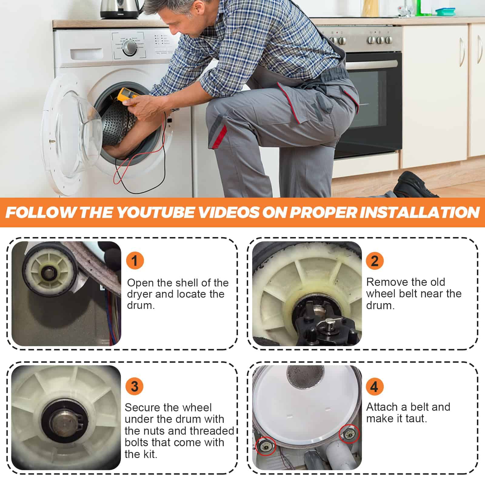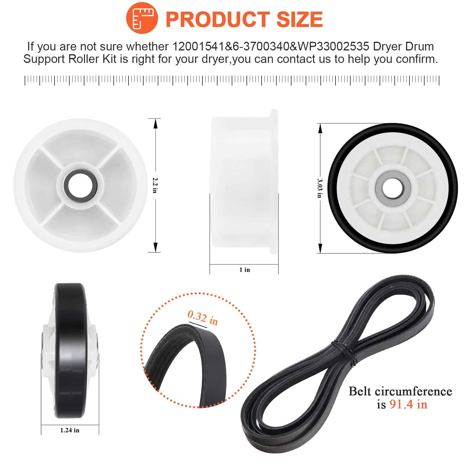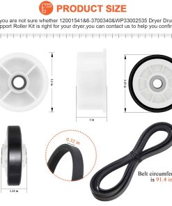 Kit de Reparación de Secadora con Garantía de 15 Años. Incluye 2x Rodillos para Tambor 12001541 303373K, 1x Polea Tensora 6-3700340, 1x Correa de Tambor WP33002535