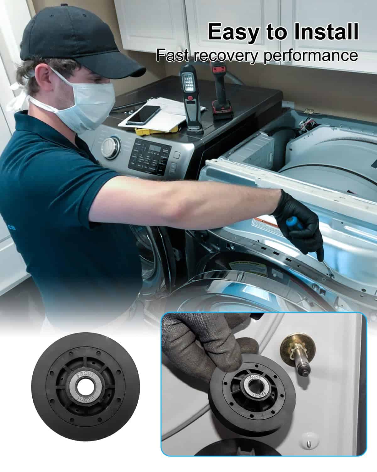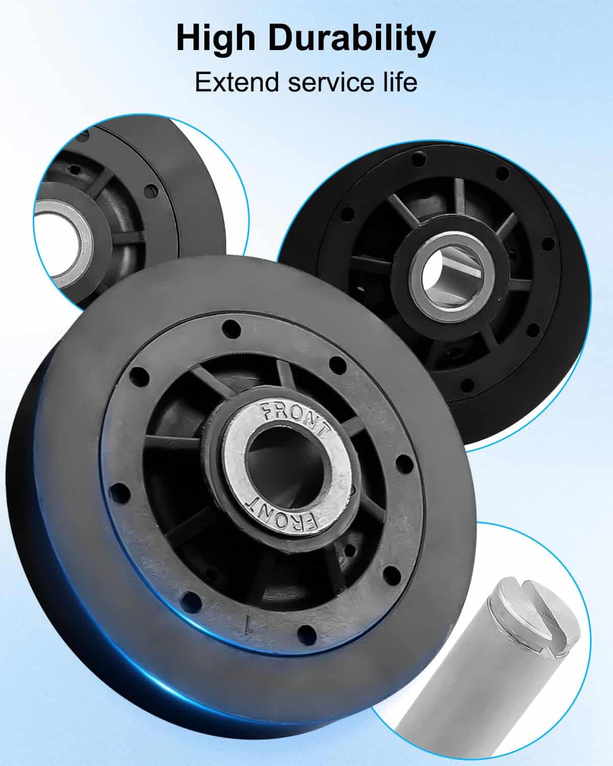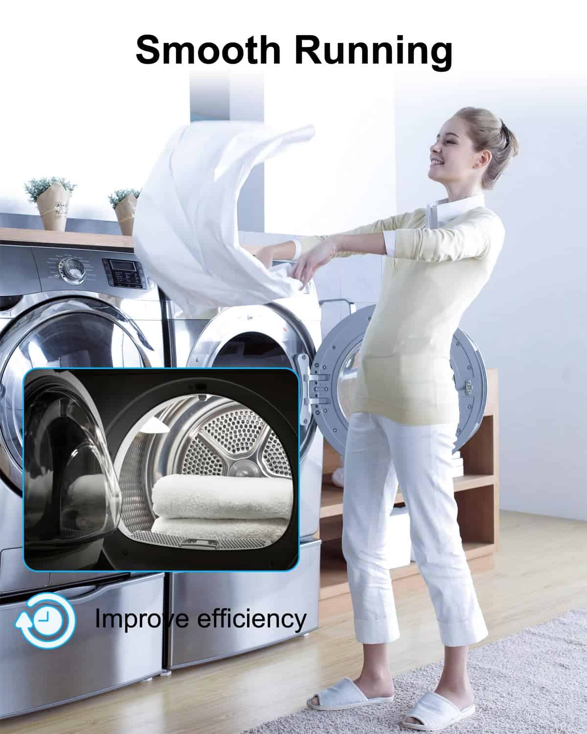 2. Mejora la eficiencia de la secadora: Este kit de rodamientos de tambor ayuda a que su secadora funcione suavemente, reduce la fricción y asegura una rotación de tambor suave, lo que mejora la eficiencia de la secadora y acelera el proceso de secado de la ropa.